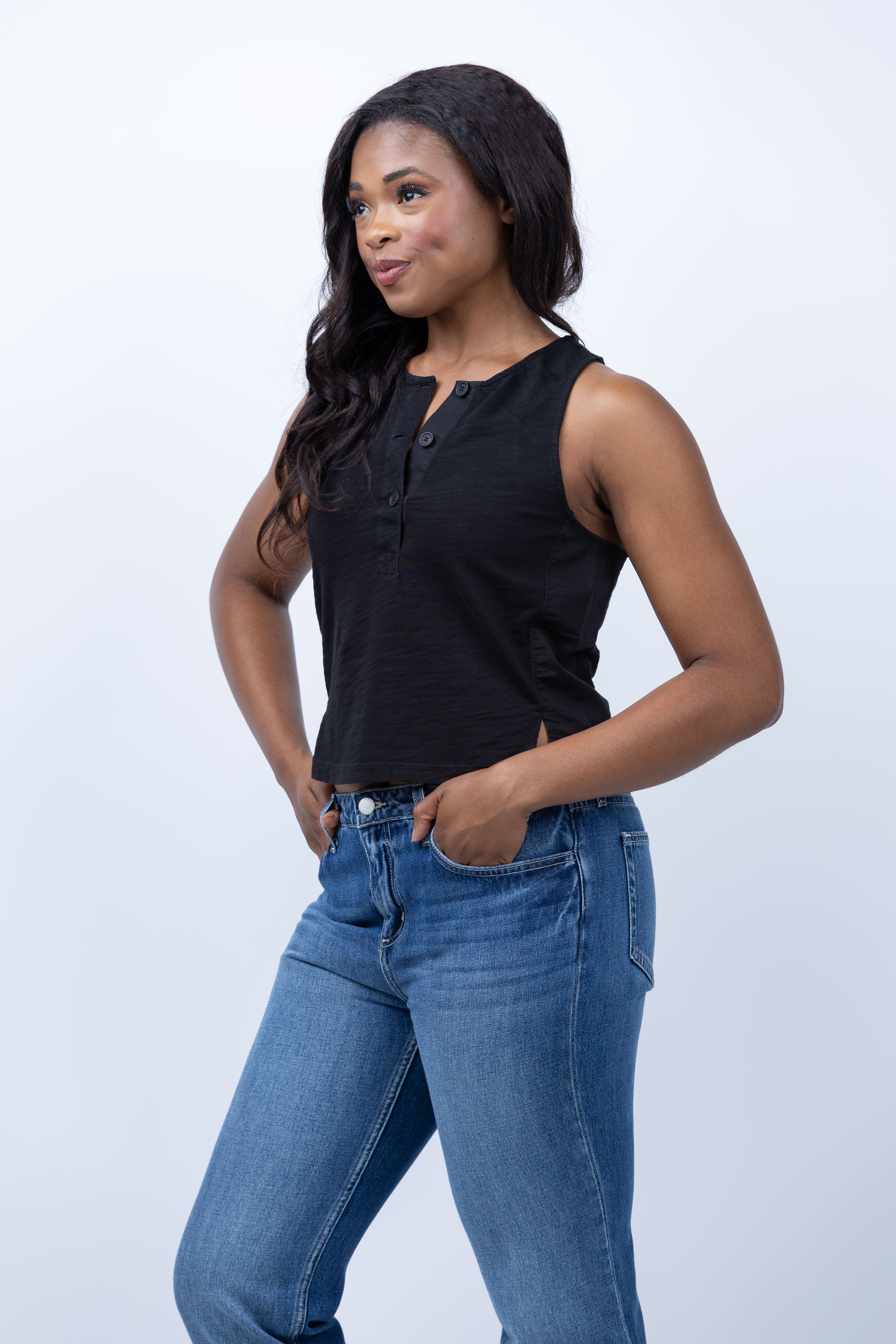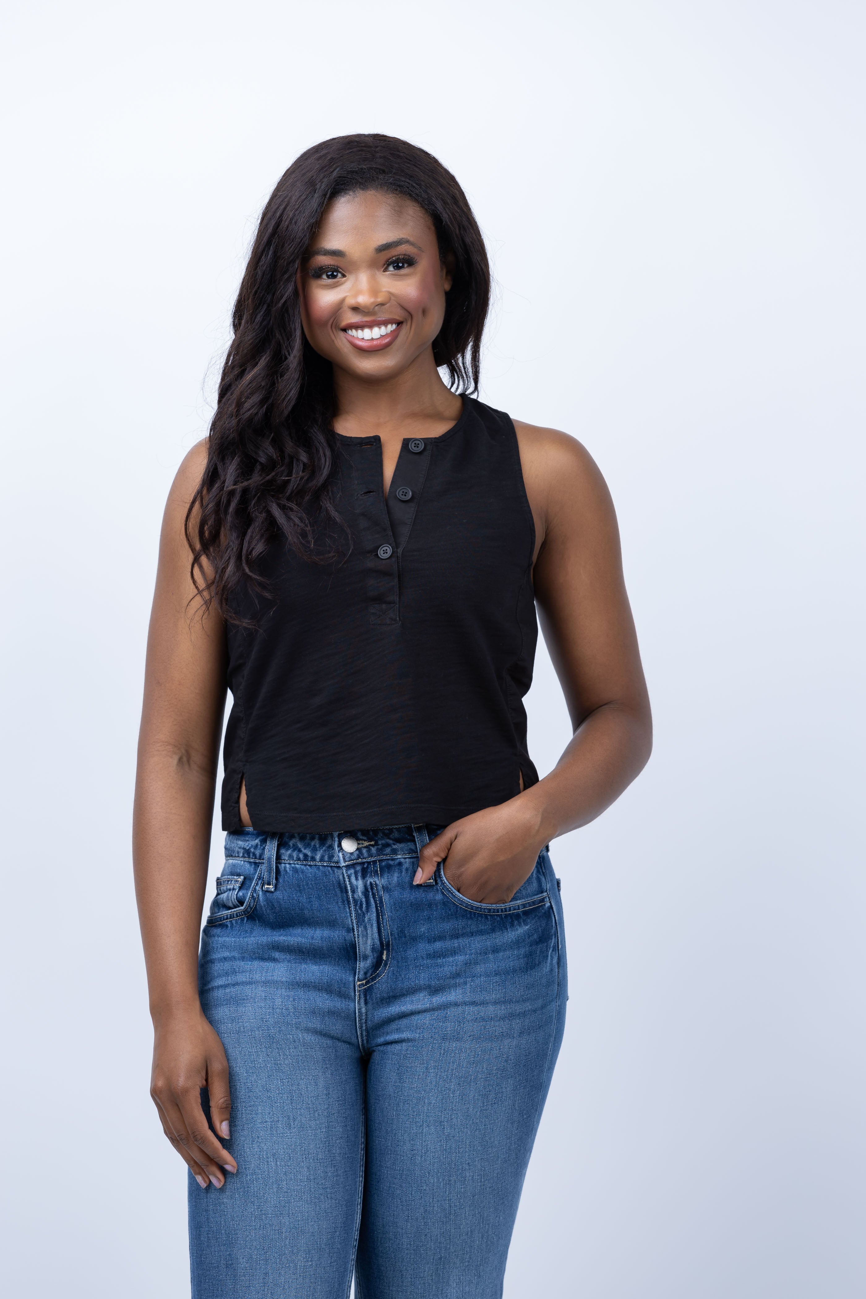 Elevate your classic tank game with NATION LTD's Bree Tank in Jet Black. Featuring contrast Poplin insets on the sides, a scoop neck with a button placket, and a perfect hip-hitting length. Keep it buttoned for a sleek look or leave it loose for effortless style.