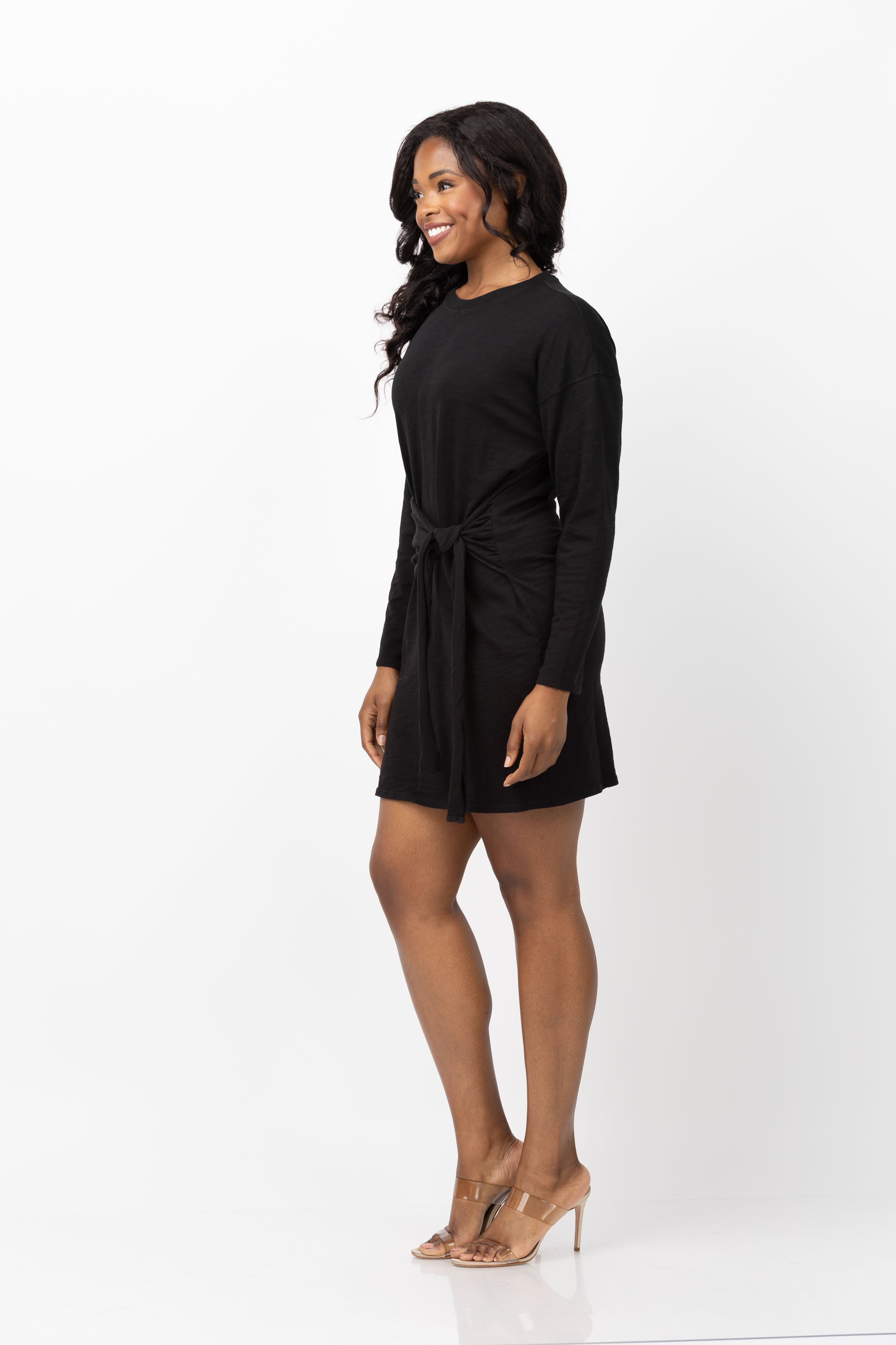 Introducing the Nation Ltd Gloria Wrap Front Dress in classic Jet Black. This versatile dress features a relaxed fit, shirring at the waist, and a tie for customizable cinching. Complete with a crew neck and contrast neckband, it's the perfect canvas for your favorite knee-highs. Get ready to make a statement!