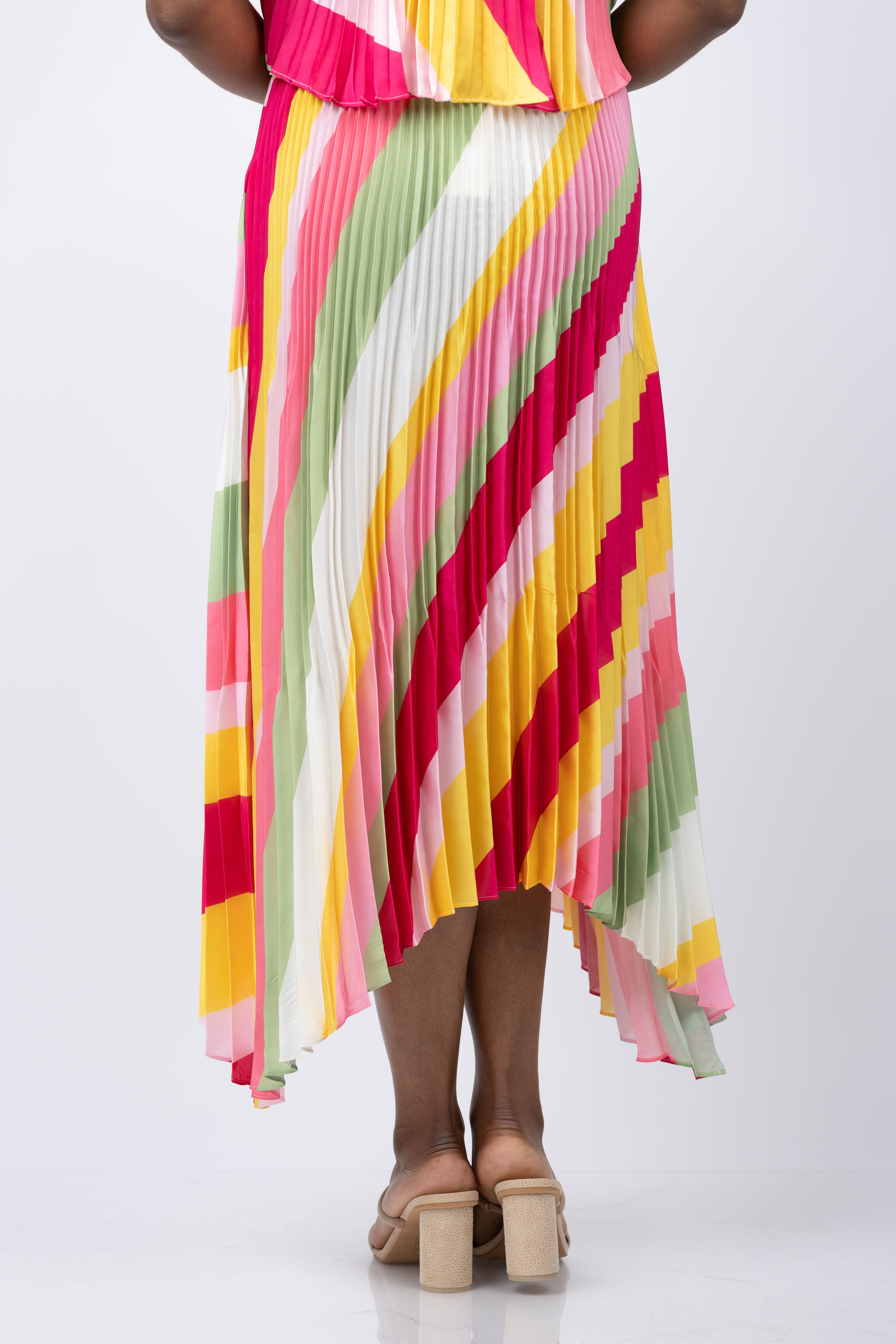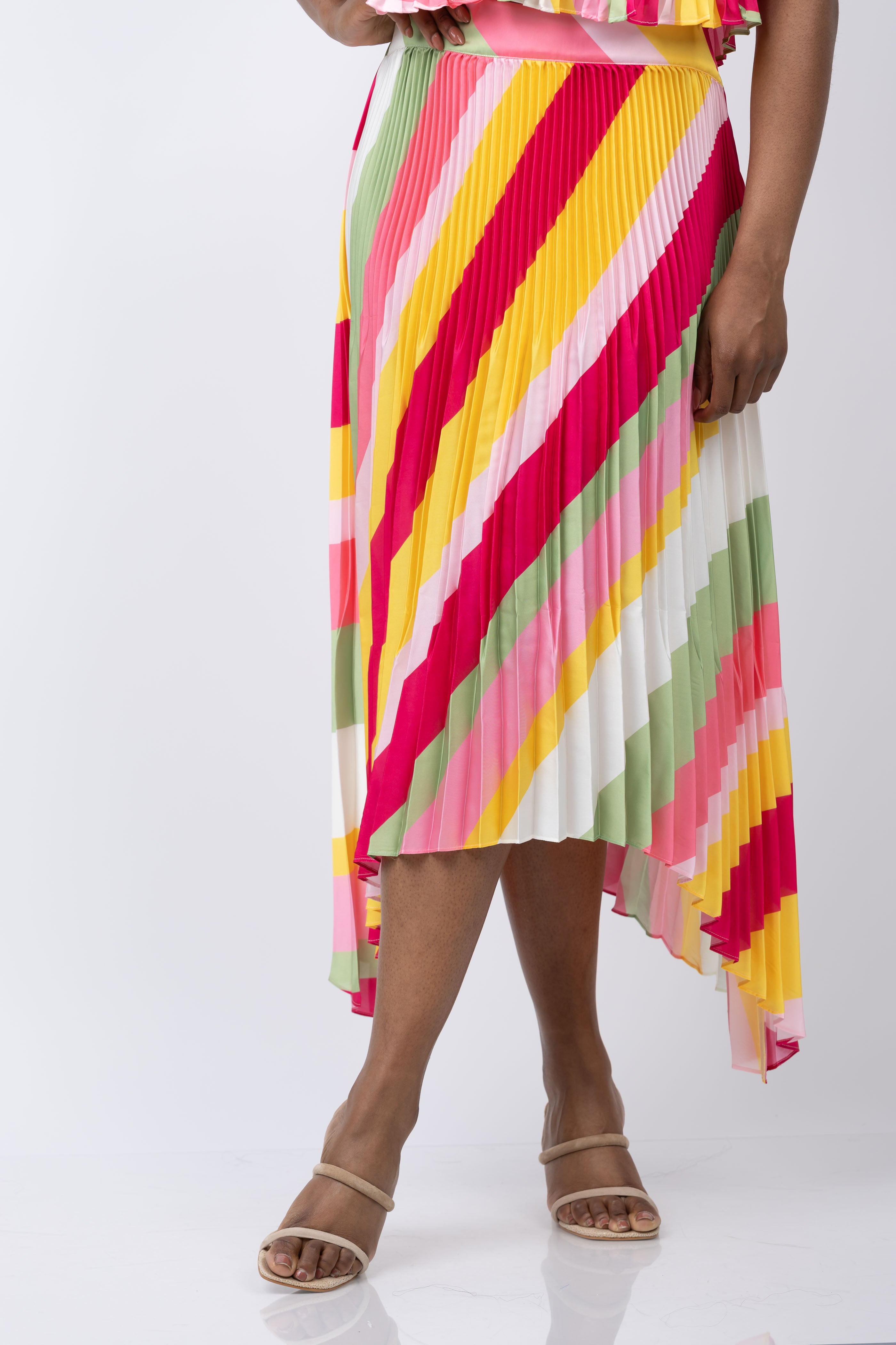 Make a statement this summer with the Ramy Brook Beatrice Skirt! This beautiful pleated maxi skirt features a multicolored stripe design and a breezy, dynamic silhouette. Perfect for any summer occasion, this skirt is sure to turn heads and add a lively touch to your wardrobe, with its handkerchief hemline and vibrant color palette.