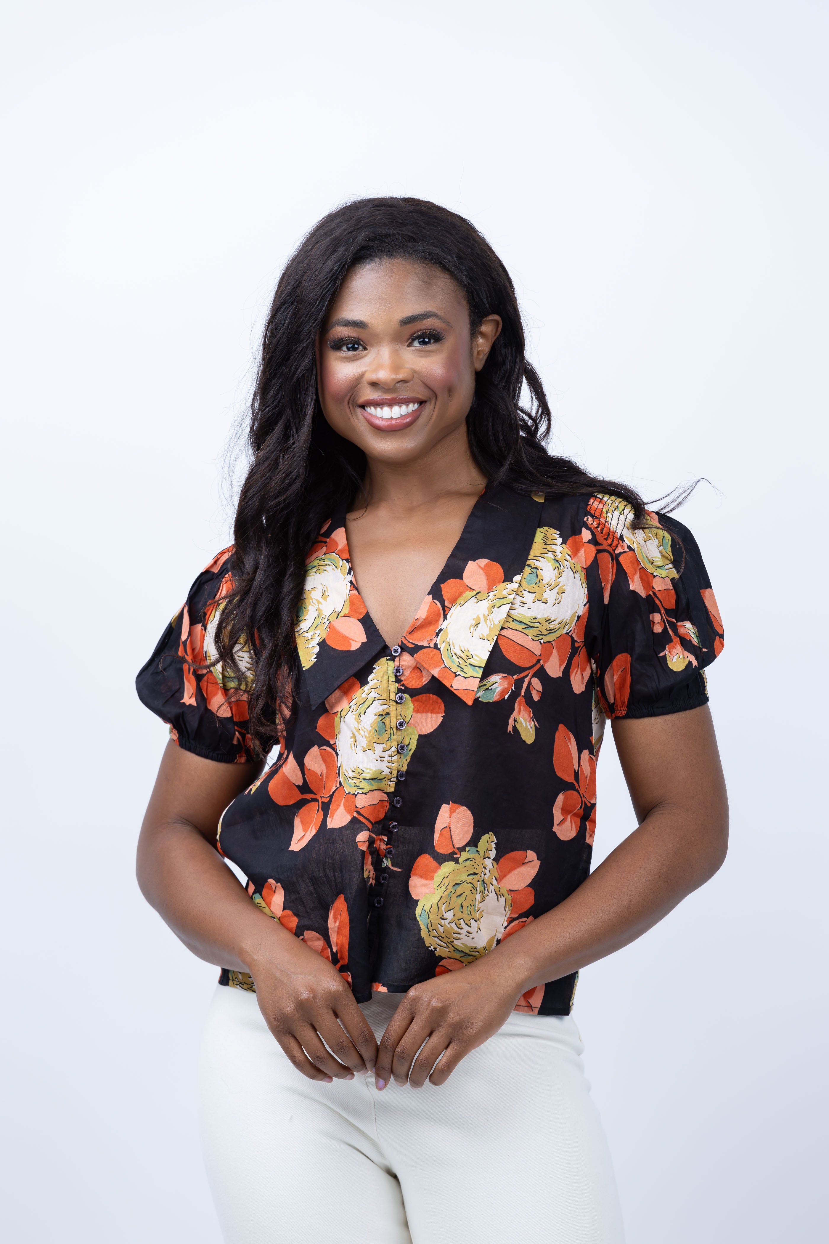 Introducing The Fairway Top, a modern take on a vintage classic! Featuring a low neckline, delicate shirting buttons, and charming puffed sleeves, this top is both timeless and sweet. Made from our sundried cotton fabric with a crisp finish, and adorned with the Pre-Fall Cabbage Rose Print, it's the perfect addition to your wardrobe!