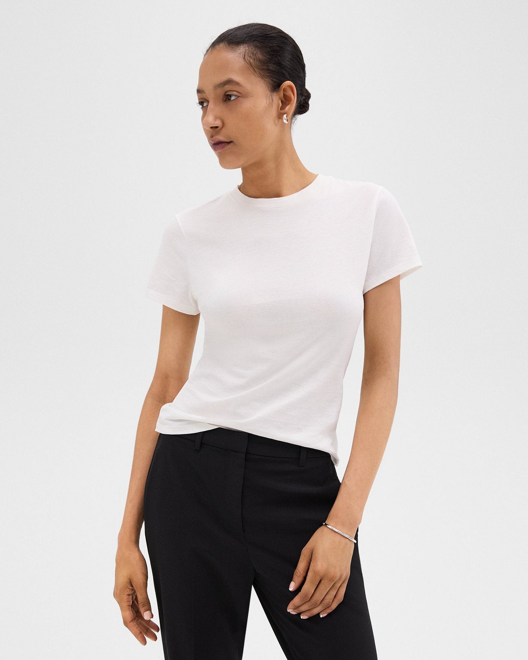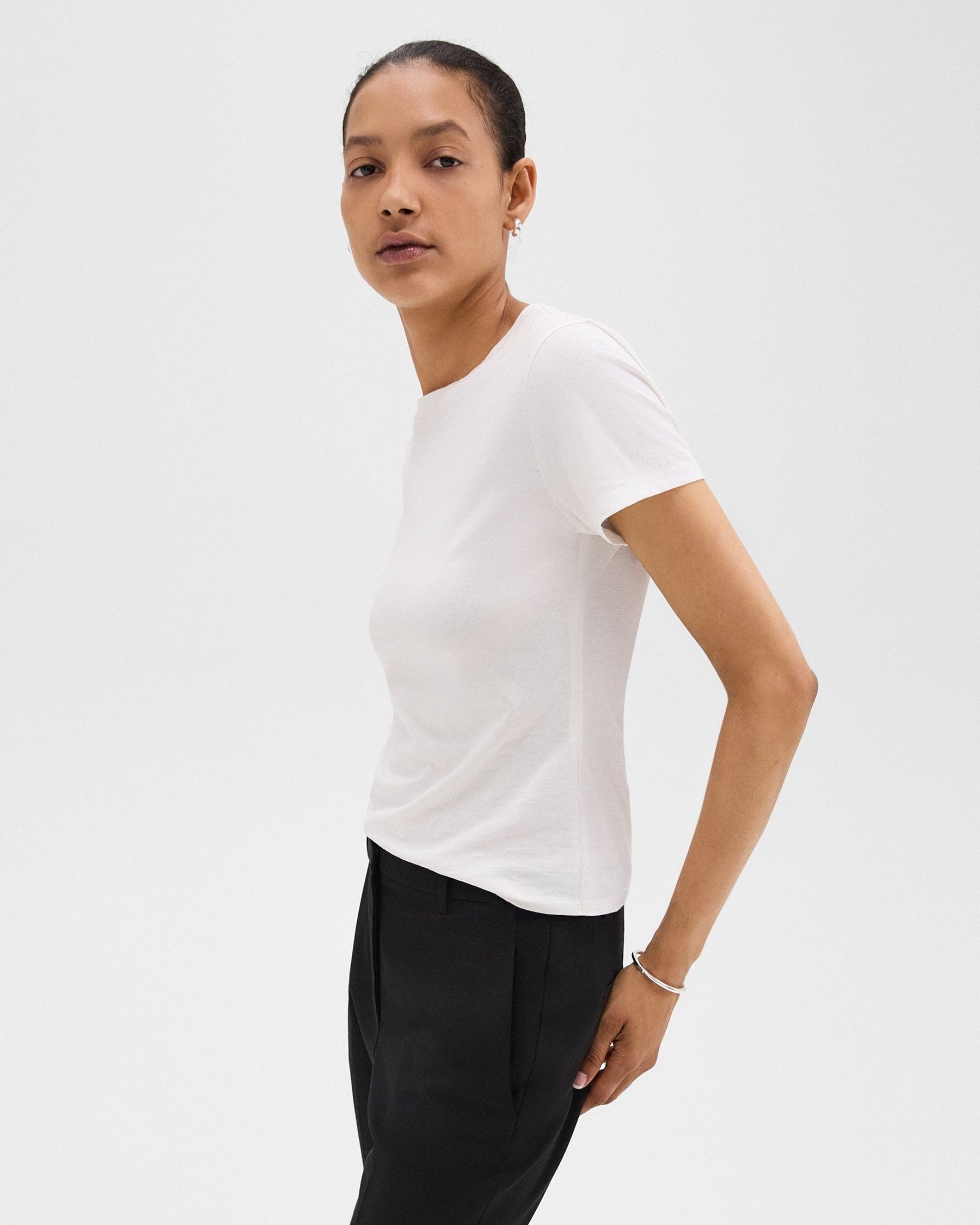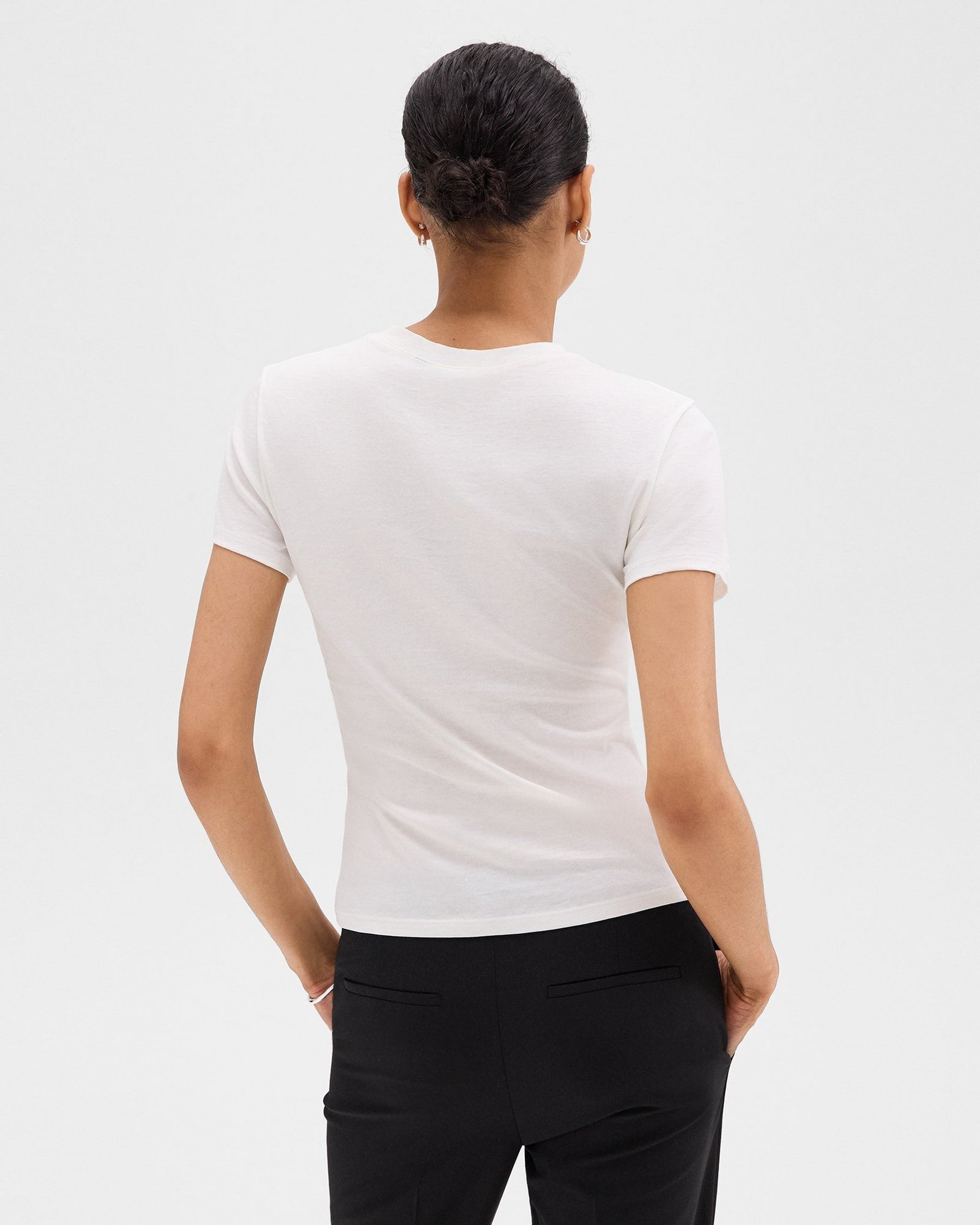 Introducing the Theory Tiny Apex Tee in White - the must-have basic tee for every closet! Perfect for wearing alone or layering under a cardigan, this versatile top will become your go-to for any outfit. Stay stylish and comfortable with this wardrobe essential!