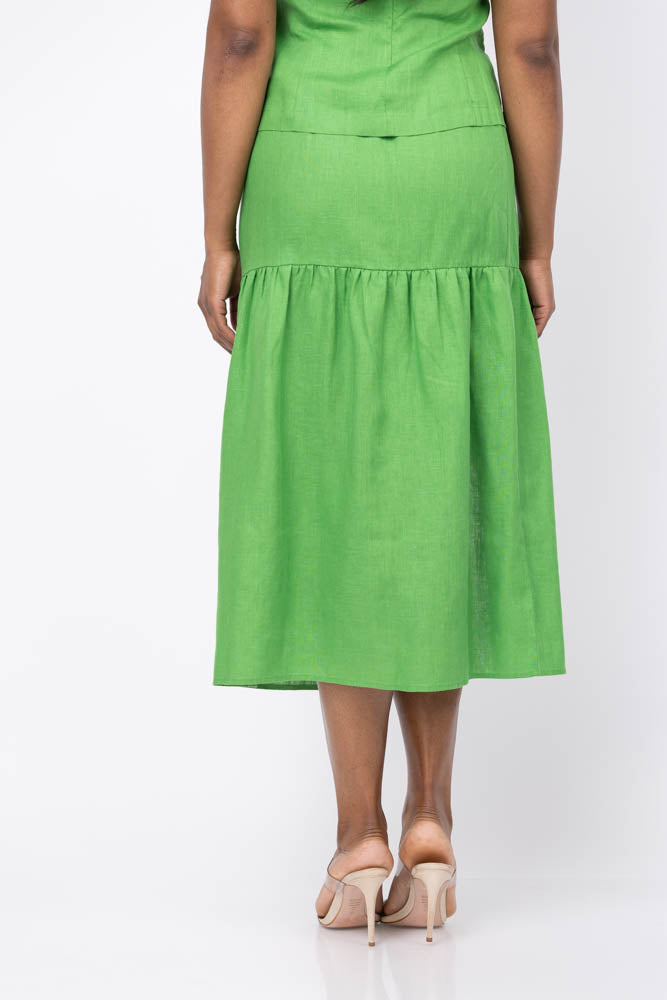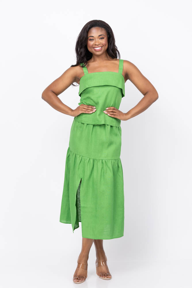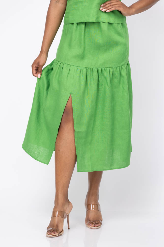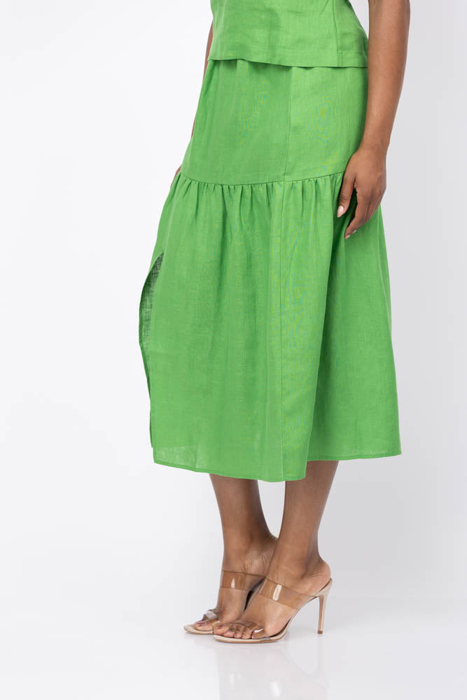 The NATION LTD Esmeralda Skirt in Lime is your new summer essential. Featuring delicate shirring and a playful slit at the hem, it adds a flirty, feminine touch to your everyday look. Its vibrant lime color brightens any outfit, making it perfect for warm days and casual outings. Embrace effortless style with this versatile midi skirt.