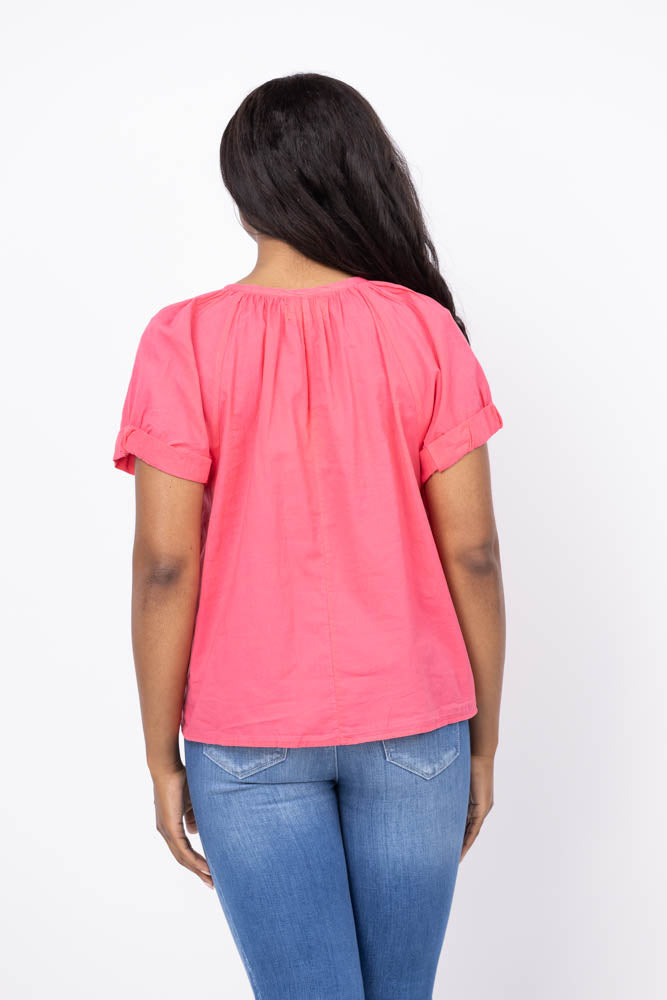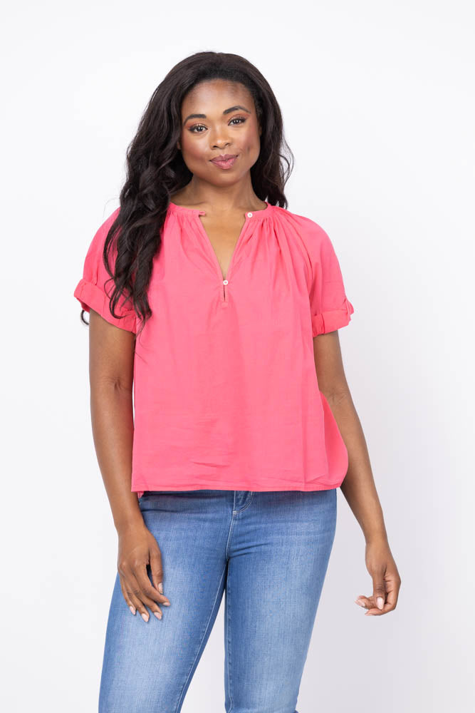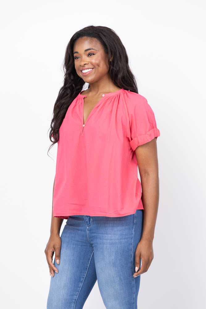 Experience effortless style with the XiRENA Calla Top in Strawberry. Made from classic lightweight woven cotton poplin, this short sleeve raglan top features stitched rolled puff sleeves, a delicate rouleau button-front, and shirred details for a flattering, lived-in look. Perfect for easy, everyday wear with a touch of feminine charm.