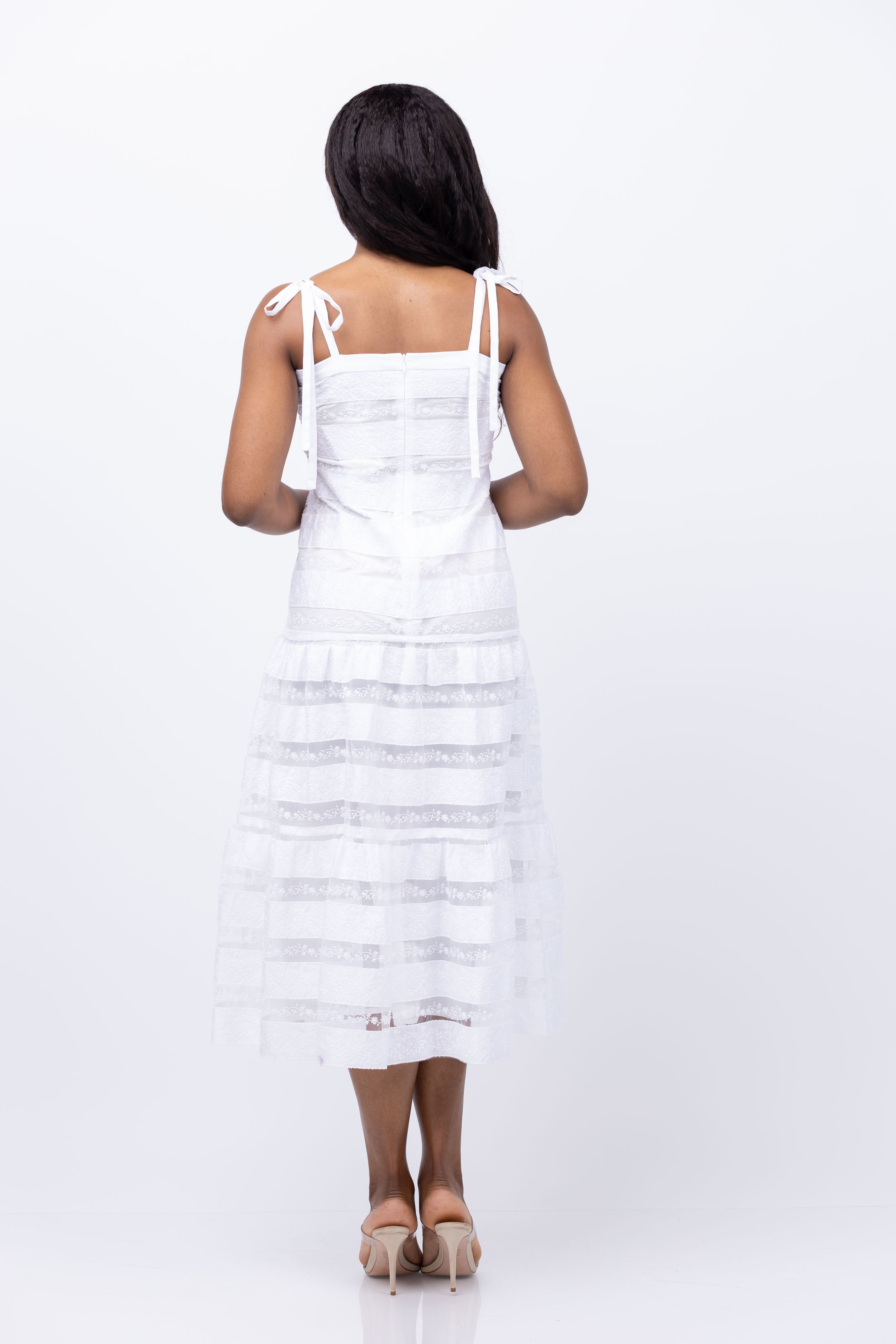 Embrace the beauty of Spring with our Christy Lynn Bryn Dress. Made with a linen tulle combination, this dress boasts self-tie straps and a flattering a-line shape. The invisible zipper in the back ensures a seamless fit. Elevate any event with this stunning white lace dress.