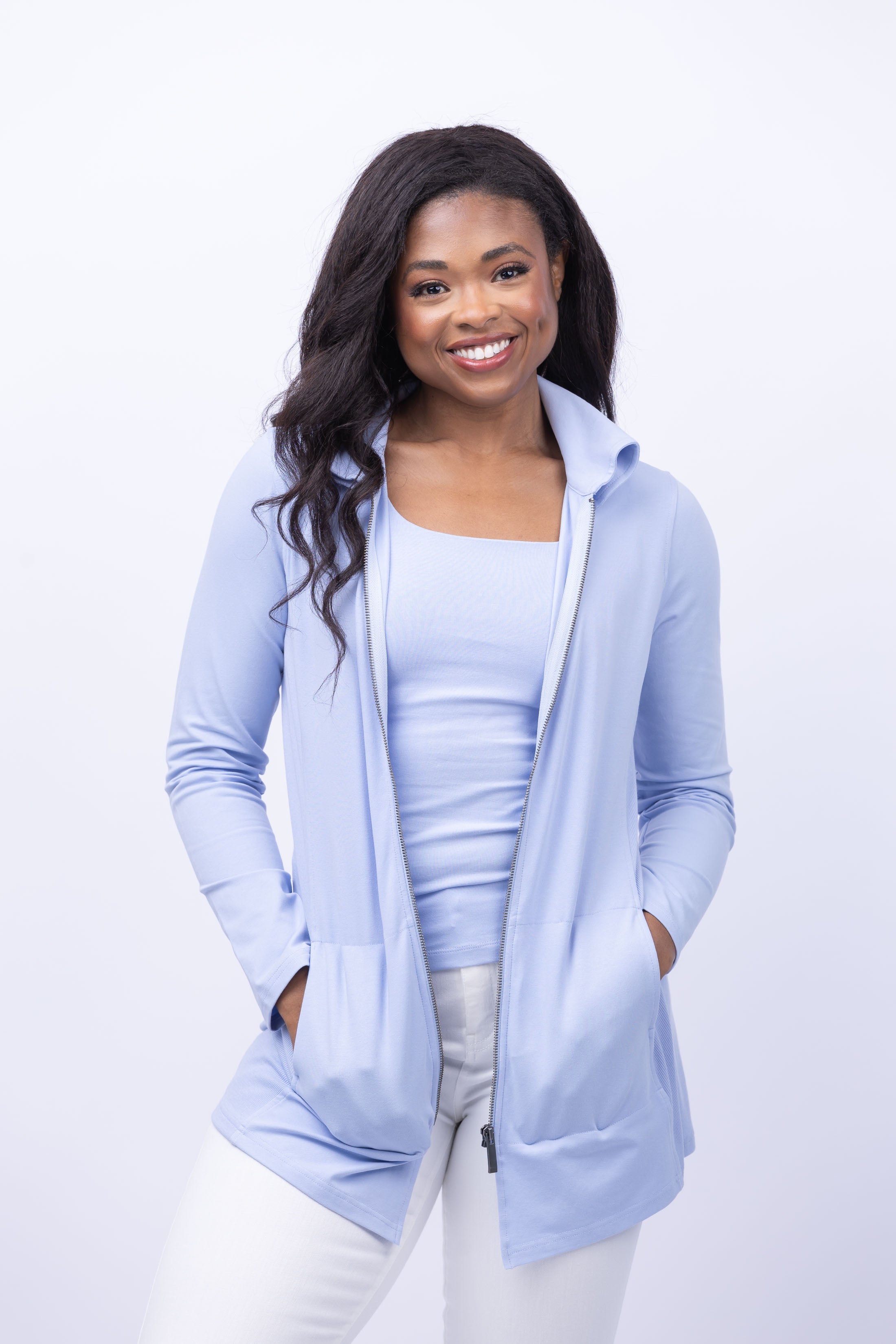 This Nic + Zoe Knit Jacket in Powder Blue is the perfect combination of fashion and comfort. Made from soft, knit fabric, it features a convenient zip-up design. Wear it with leggings for a cozy, yet stylish look, or dress it up with white jeans for a chic ensemble. Elevate your wardrobe with this versatile and trendy piece!