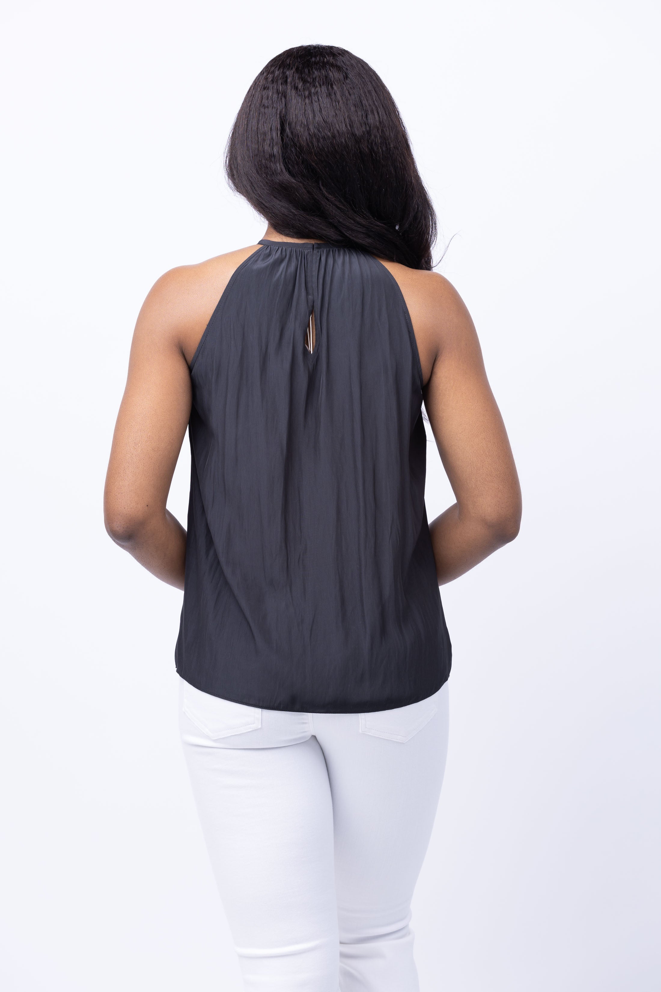 This sleeveless black Ramy Brook tank top is a versatile and elegant addition to your wardrobe. The neck detail adds a touch of sophistication, and the silky texture makes it the perfect top to pair with white shorts or jeans. A classic tank that will elevate any outfit!