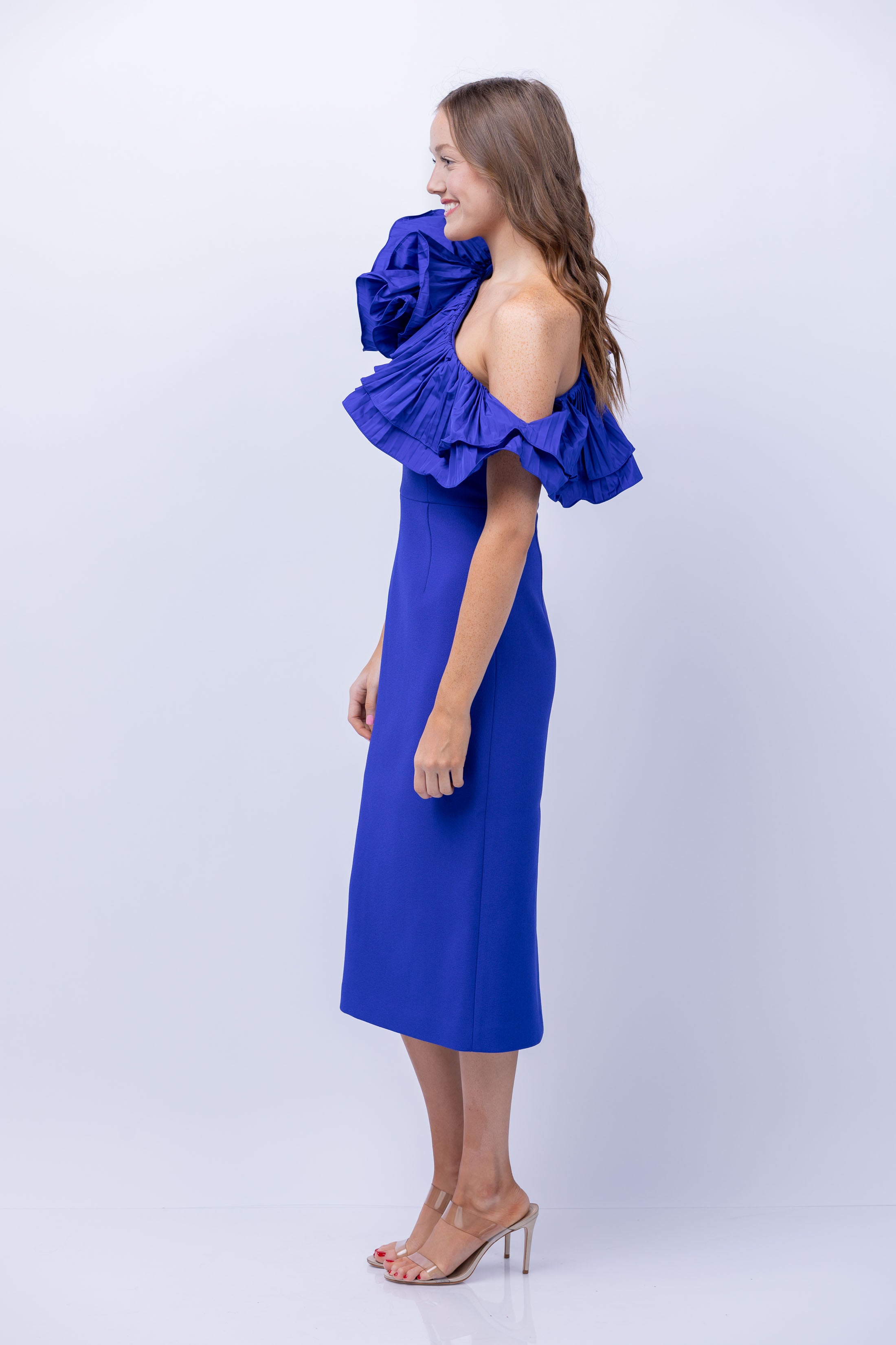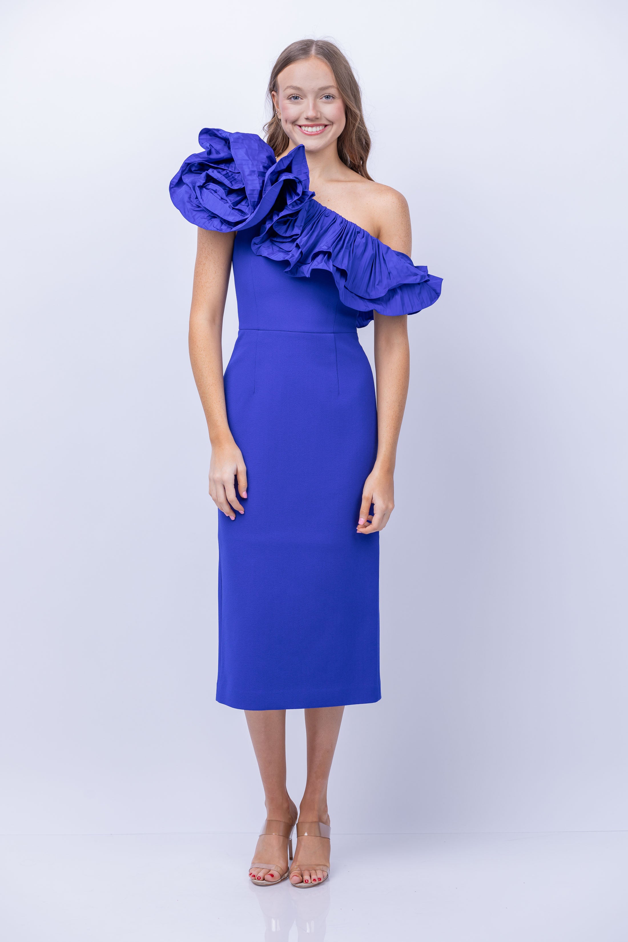 Step into sophistication and style with the Rebecca Vallance Cora One Shoulder Midi Dress in Cobalt. Crafted from luxurious crepe and taffeta, this dress features a frilled pleated neckline and cinched waist for an elegant silhouette. The fitted bodice and pencil skirt with a back split add a touch of flair to this dress, while the discreet side seam zip ensures a comfortable and secure fit. Perfect for special occasions, this dress will make you feel confident and chic.