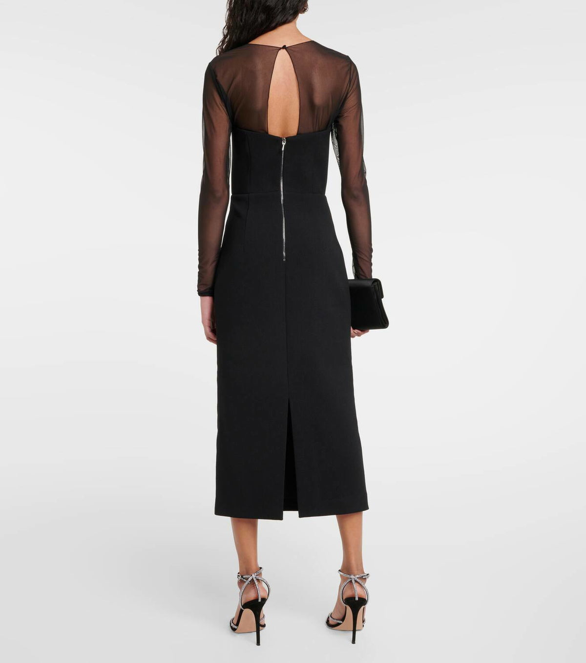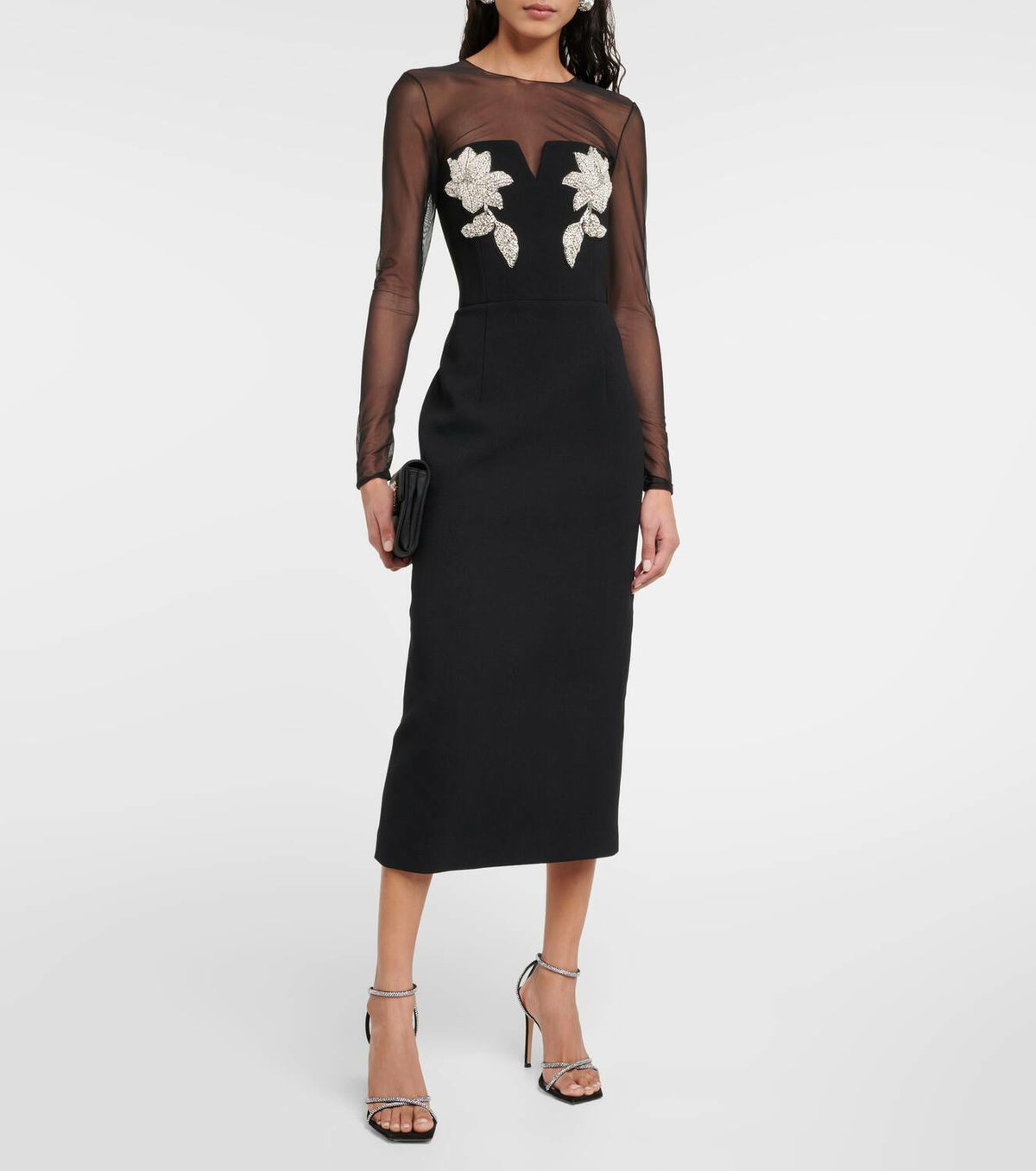Be effortlessly chic in this Rebecca Vallance Ginevra Midi Dress. Crafted from luxe crepe and adorned with dazzling diamante appliques, this midi dress radiates captivating mesmeric charm. A strapless look with plunge v neckline and sheer mesh sleeves add the perfect alluring finish. Make a statement wherever you go!