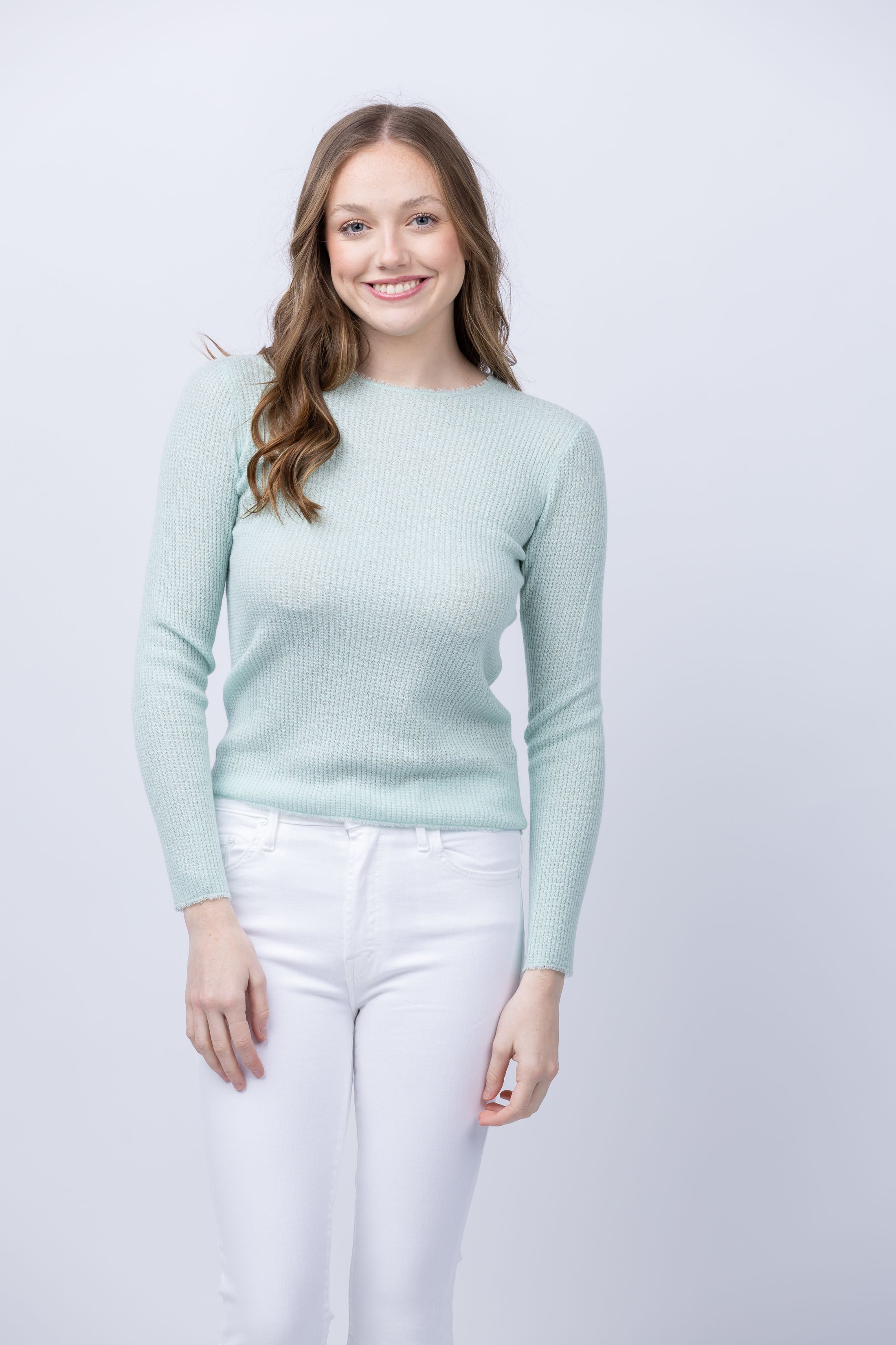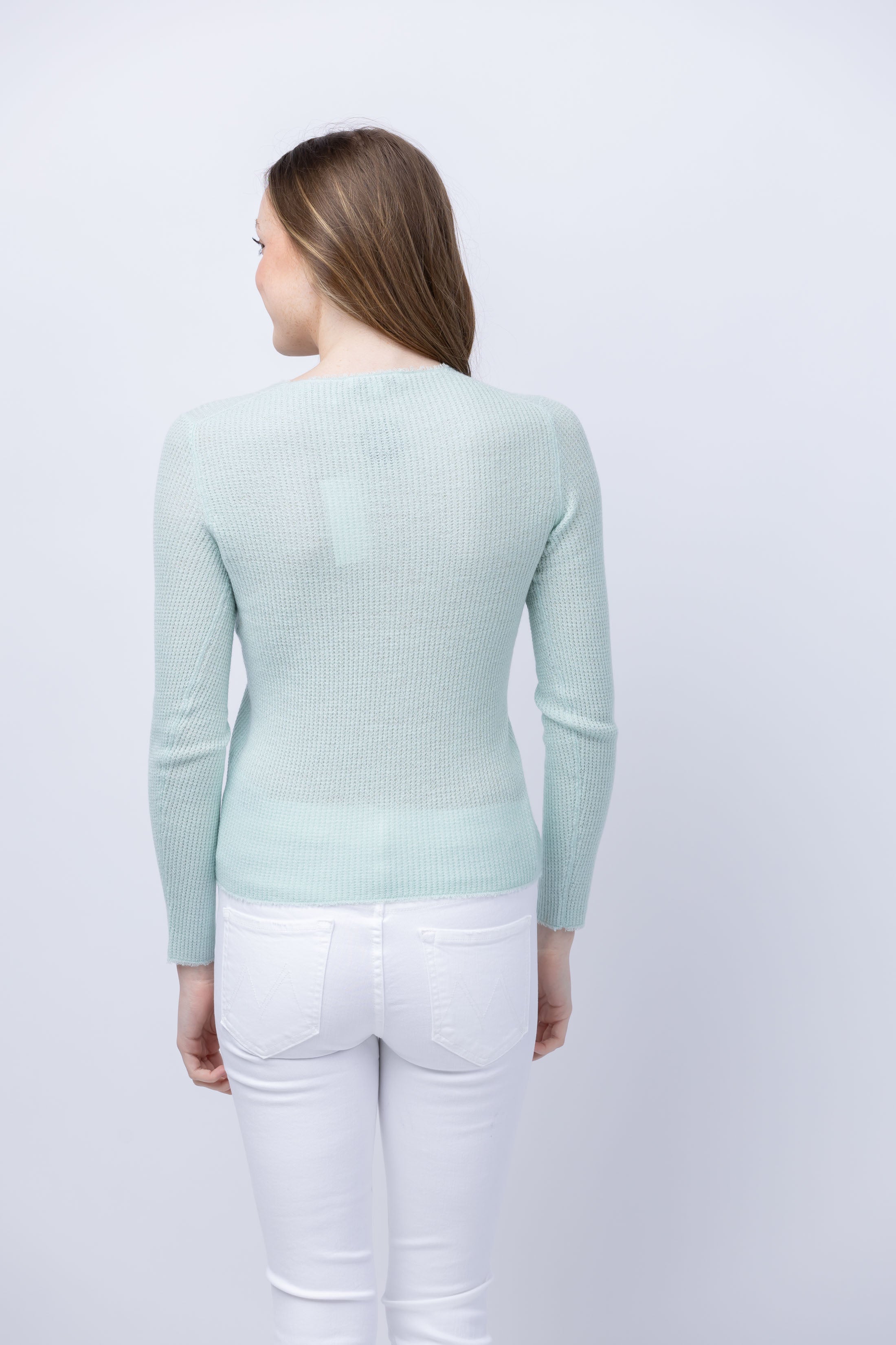 Experience luxury and comfort with the Vince Waffle Stitch Crew Neck Sweater in Sea Star. Made from a blend of cashmere and silk, the waffle stitch adds texture while the raw edges give a unique touch. Perfect for a lightweight, stylish look.