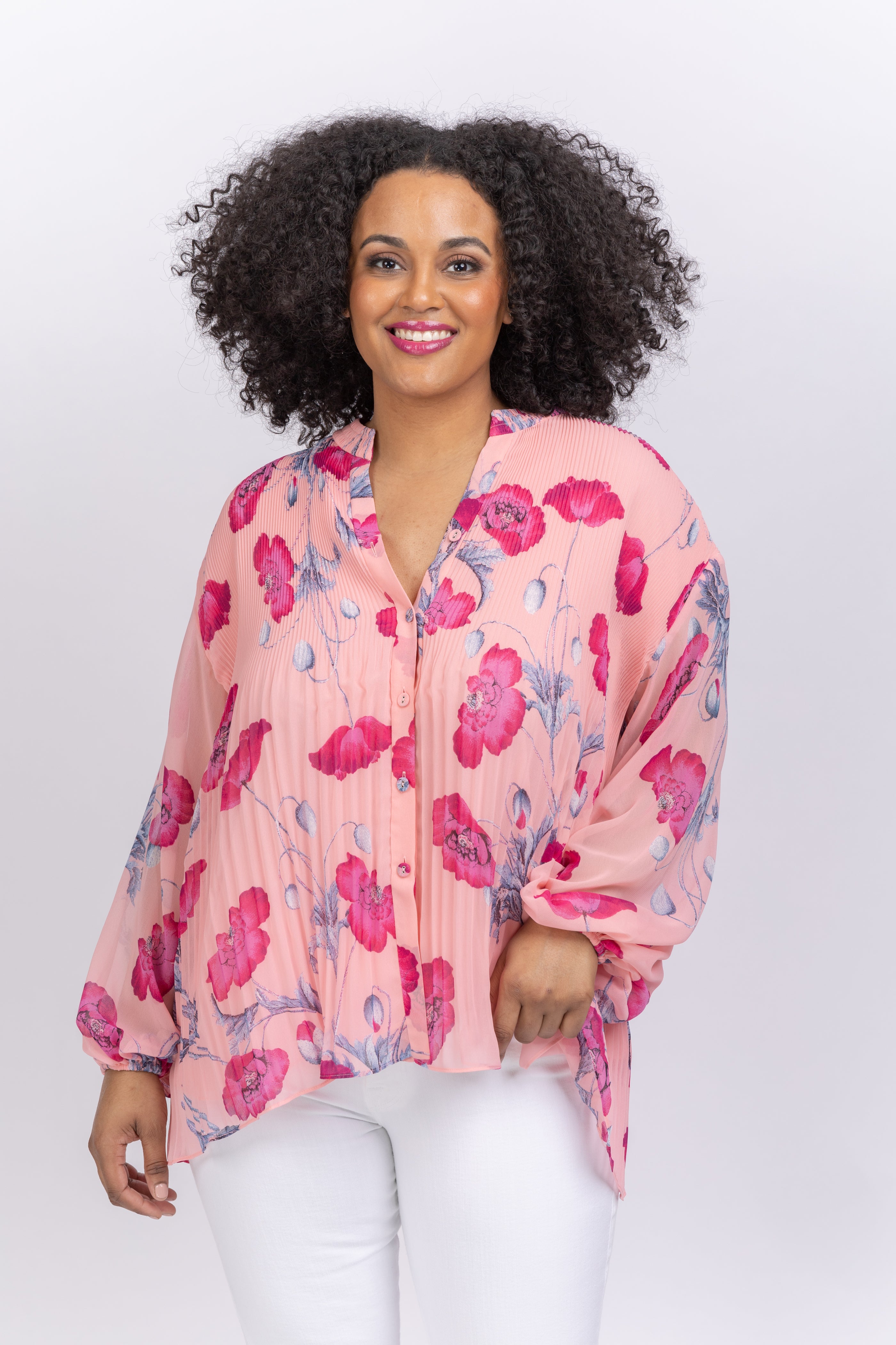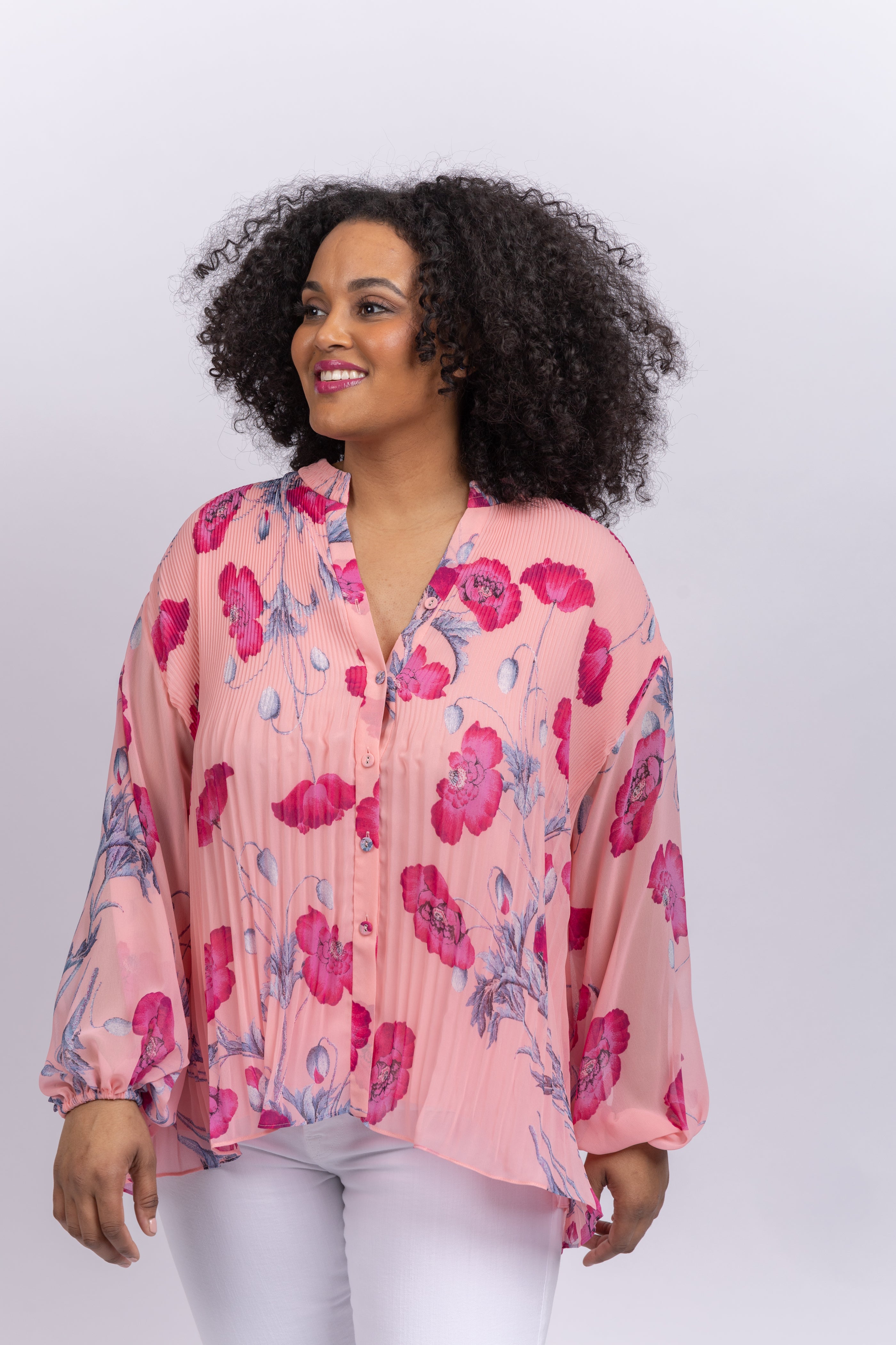 Pleated from the shoulders to the hem, the Nate top is cut from a soft chiffon. Loose with slightly ballooning sleeves, this button up has a billowy, relaxed fit.