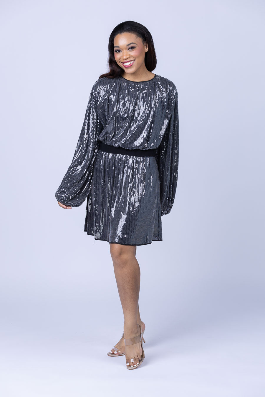 The Moana Mini Dress by DVF is the ideal pick to make a statement at your next event. This crewneck mini dress is embelishhed with metallic sequins and features a swingy silhouette with an elasticated waistline, and balloon sleeves. Style yours with strappy heels and minimal accessories.