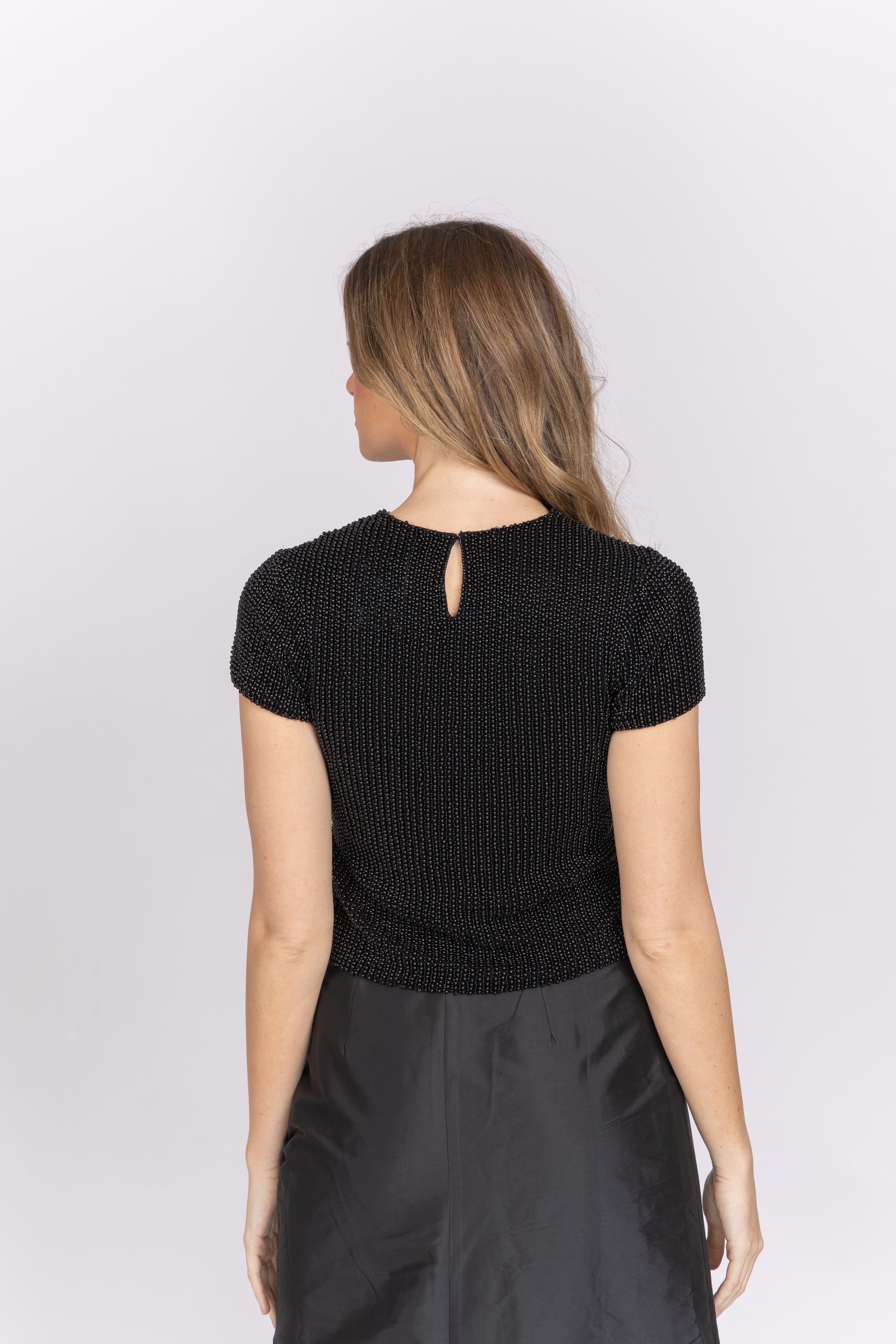 Your favorite short sleeve top is encrusted in tiny pearls. Wear with our taffeta skirts or to a special event or a pair of jeans for a fancy brunch or dinner out. Makes for a really fun bridal outfit for your rehearsal dinner or engagement party. And she’s stretchy!