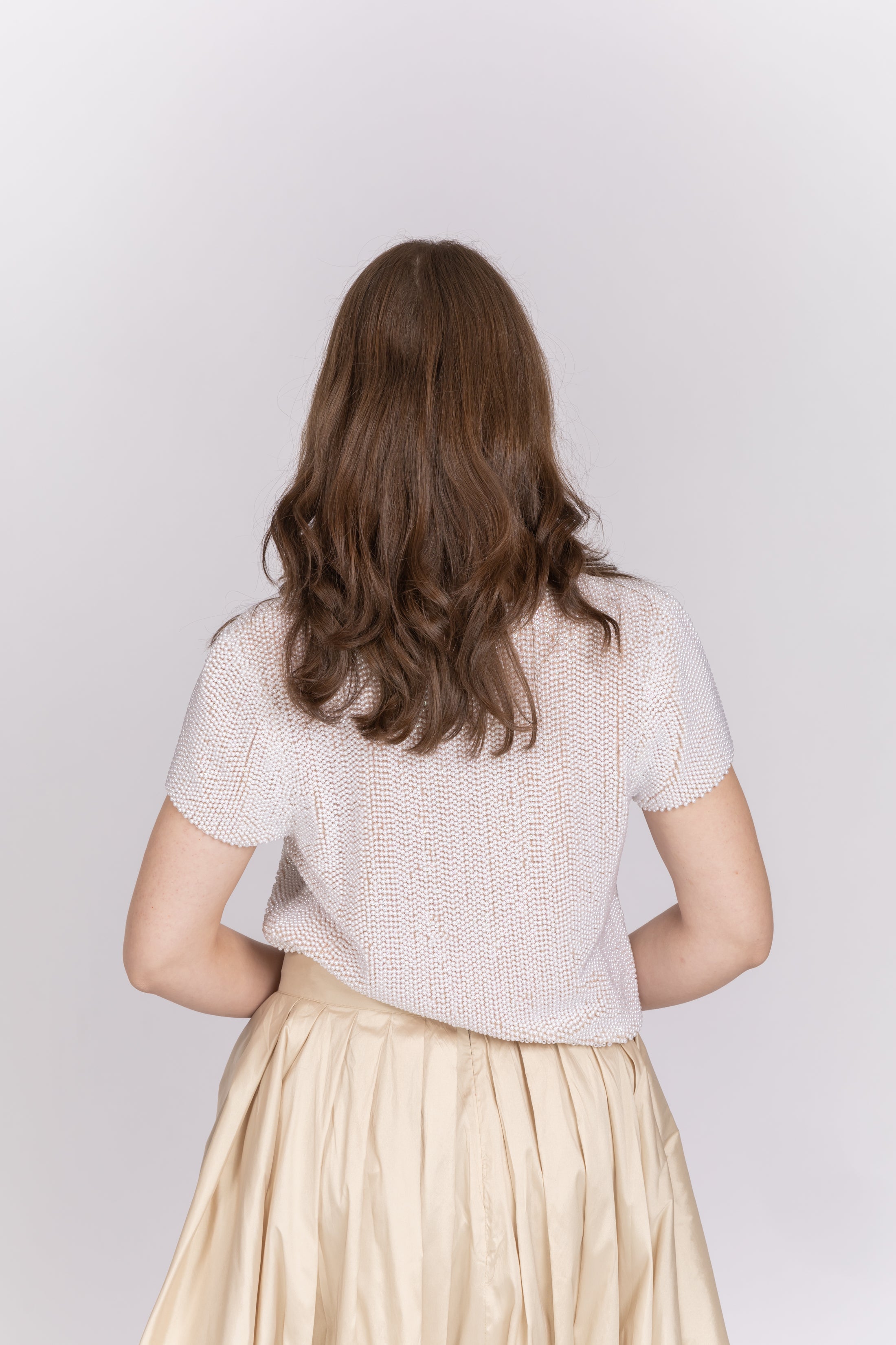 Your favorite short sleeve top is encrusted in tiny pearls. Wear with our taffeta skirts or to a special event or a pair of jeans for a fancy brunch or dinner out. Makes for a really fun bridal outfit for your rehearsal dinner or engagement party. And she’s stretchy!
