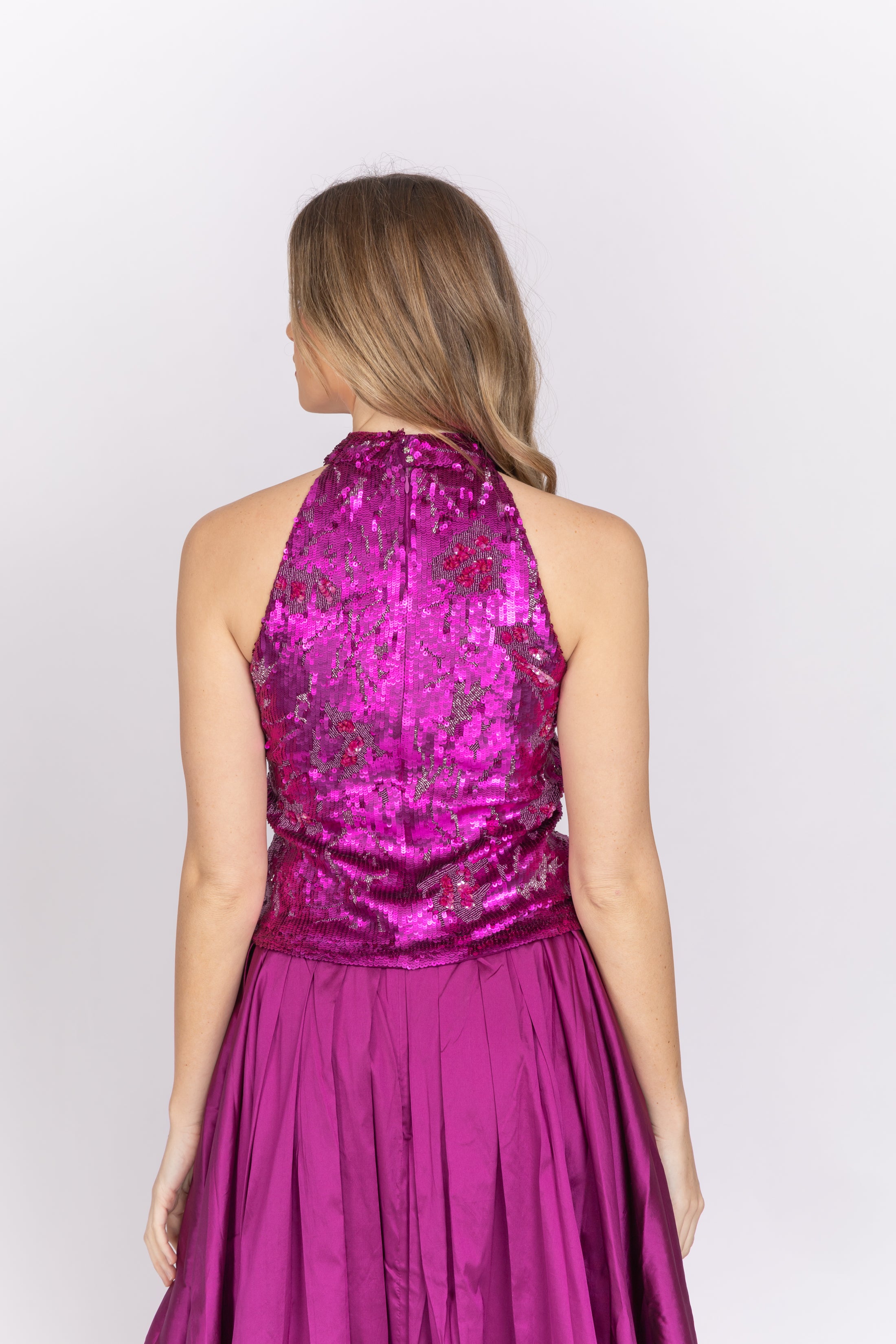 Stretch sequin mock-neck top is hand beaded and embroidered with gorgeous tonal flowers.  This top is a total show stopper.  Pair back with a skirt for a formal event or try her with a wide leg pant for a modern spin on elegant attire.  Then wear her later with your favorite black jeans to that birthday dinner.