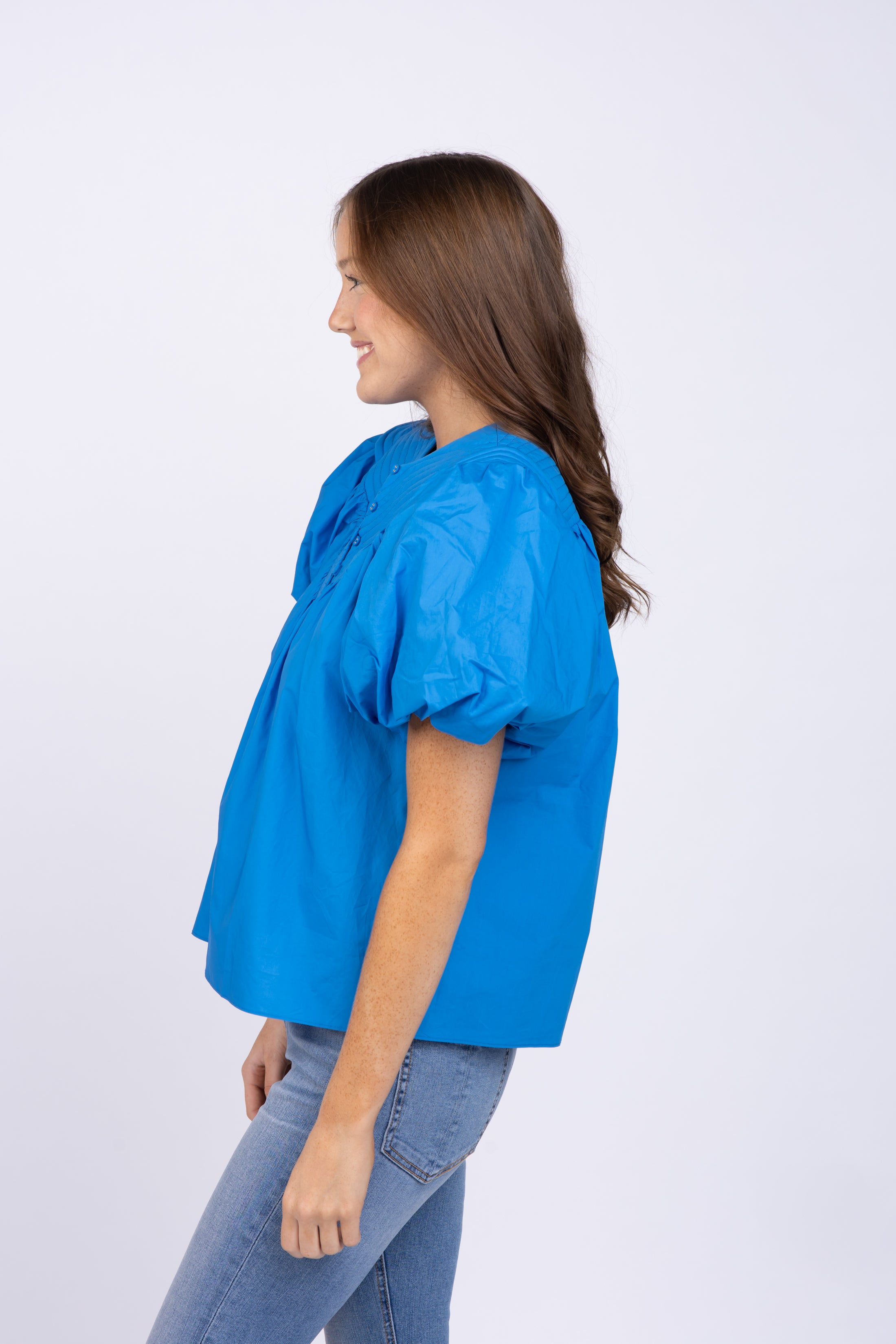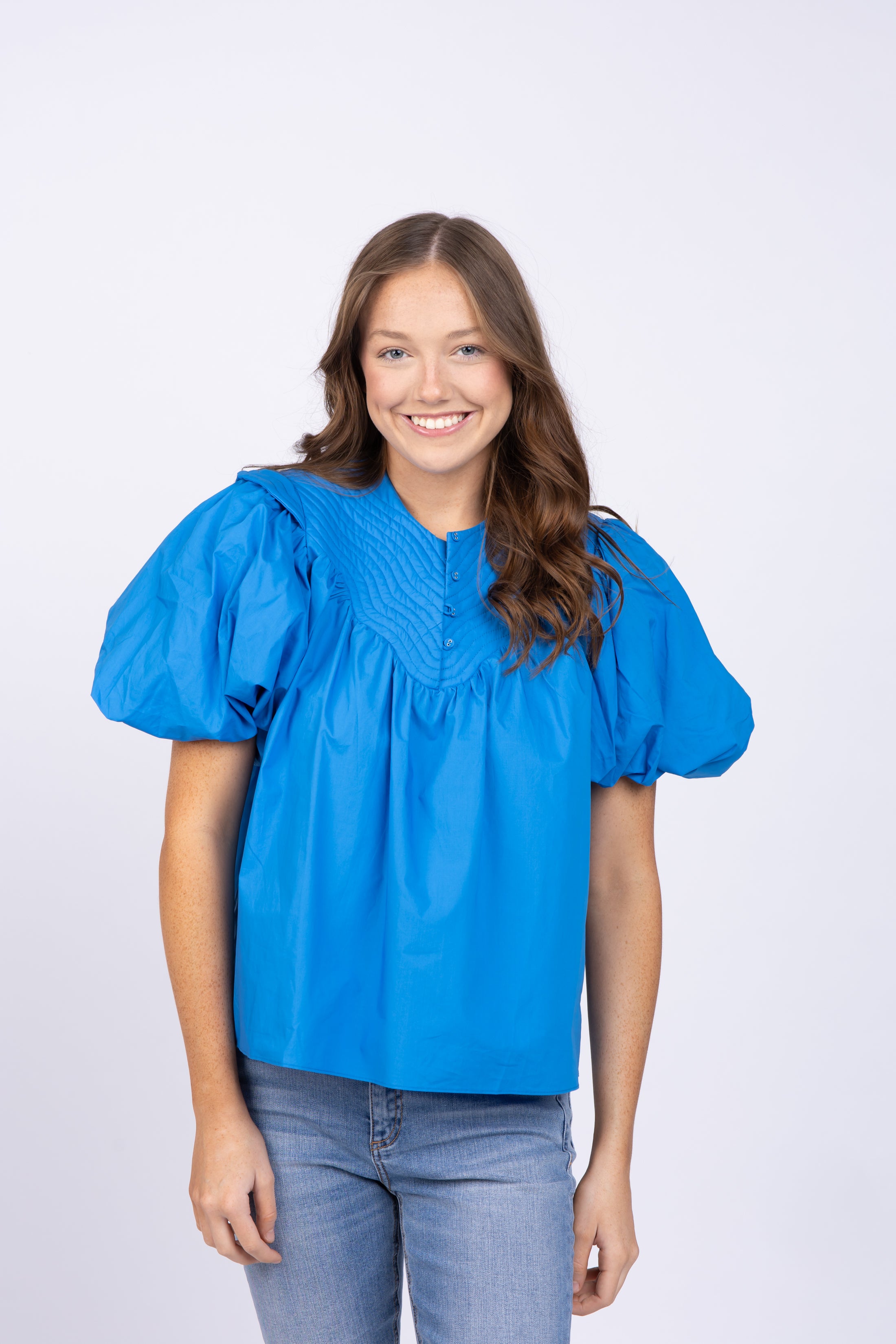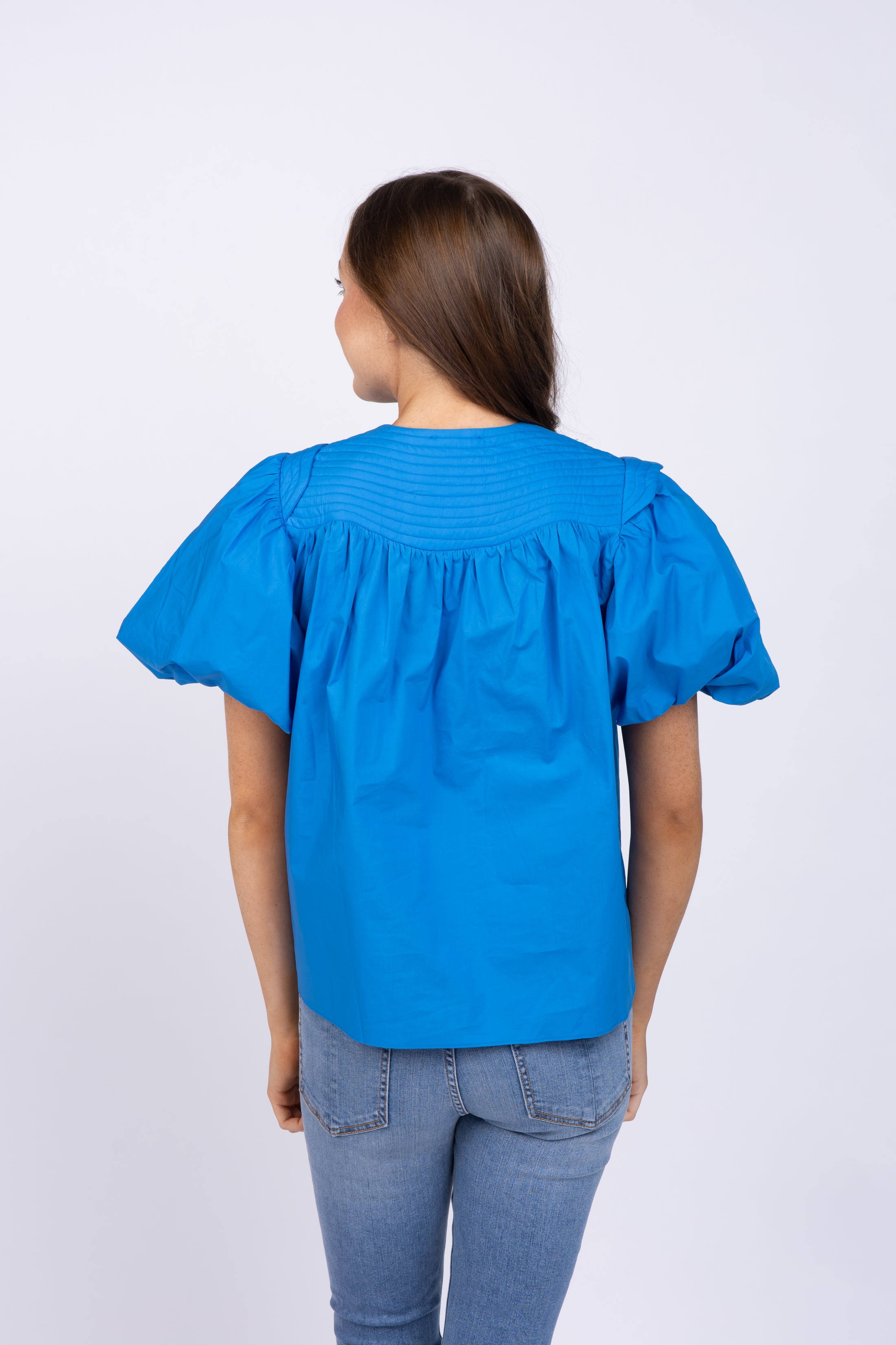 Brighten up your look with the Gilner Farrar Brynn Top! This adorable poplin top boasts a pop of blue, puff sleeves, and a unique neck detail for a stylish twist. You'll love the energy and freshness this top brings to your wardrobe. What are you waiting for? Try it today!