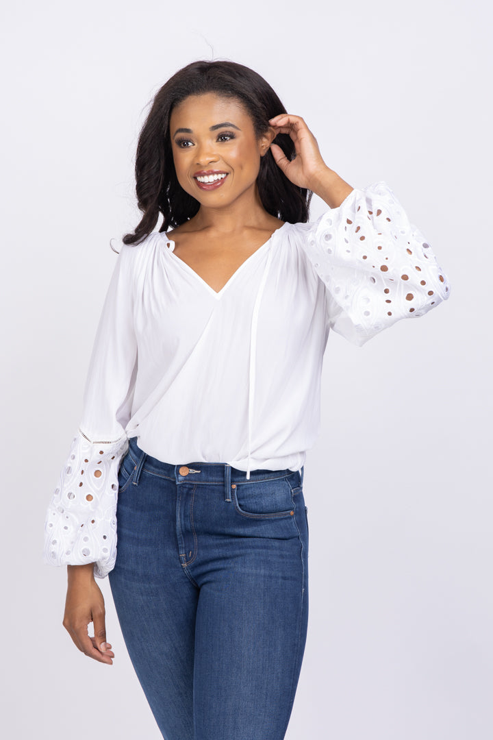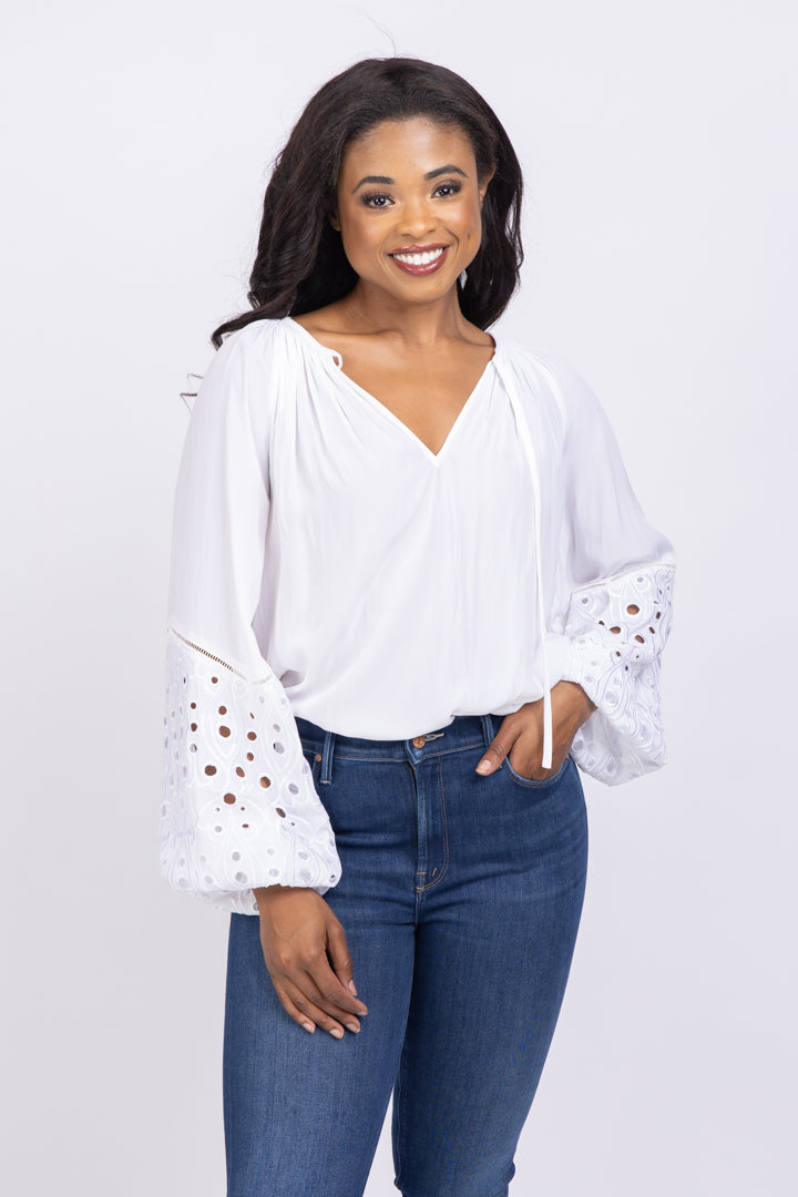 Eyelet detailing along the sleeves lends femininity to Ramy Brook’s Aleya top, designed with a timeless peasant silhouette.