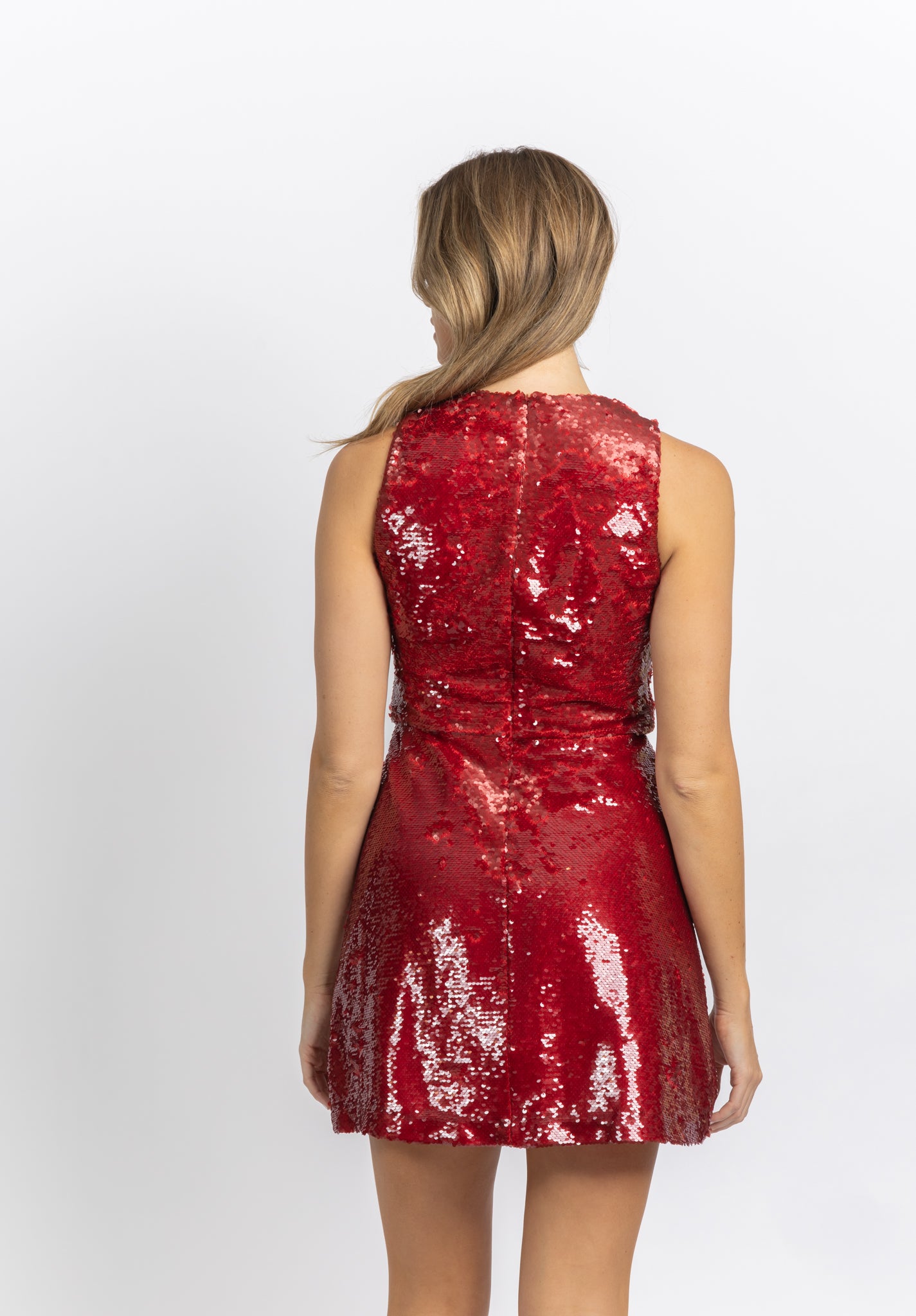 Gorgeous scarlet red sequin mini dress. This sleeveless style features a rounded neckline and fitted bodice with an A-line skirt. Fully lined. Hidden back zipper.