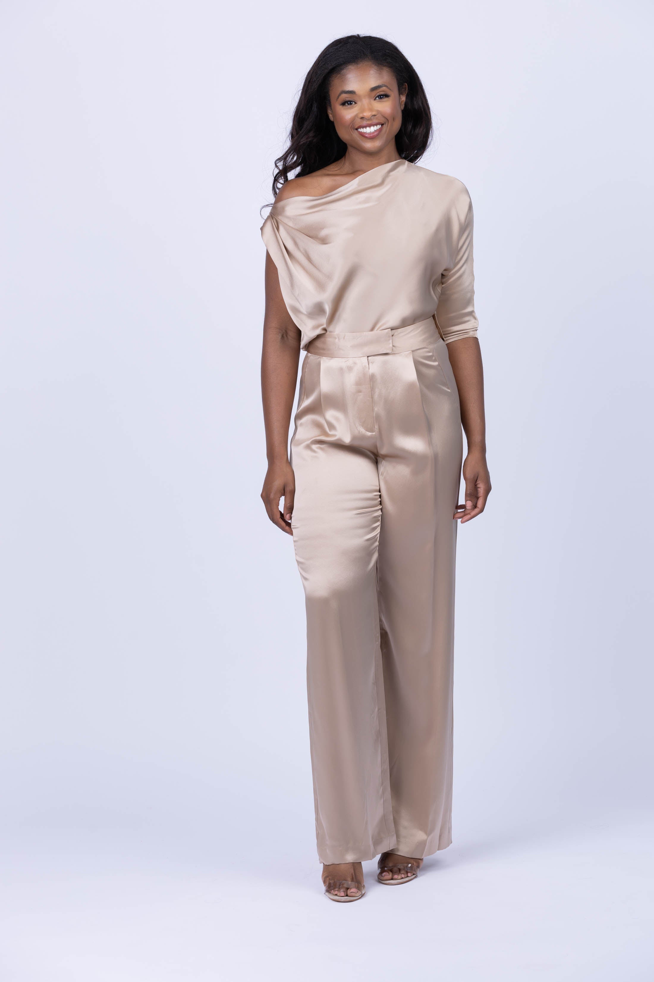Introducing The Sei Wide Leg Pant in Champagne: an on-trend pant crafted from fluid, glossy silk. Luxuriously elegant and lightweight, these trousers fit like a dream and offer a pleated, wide-leg silhouette that flatters any figure. Upgrade your style with these chic and comfortable trousers. Pair with The Sei One Sleeve Top in Champagne.