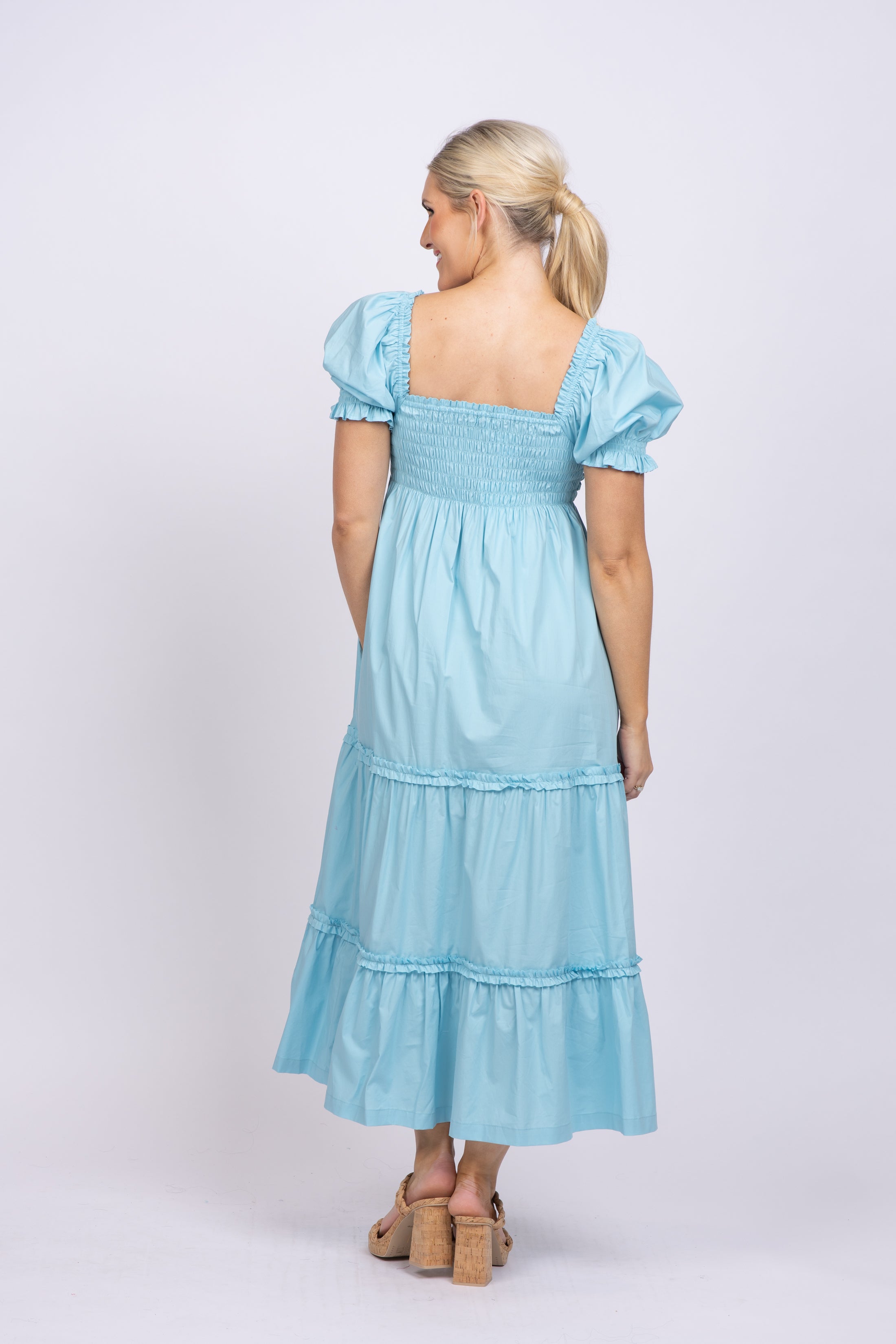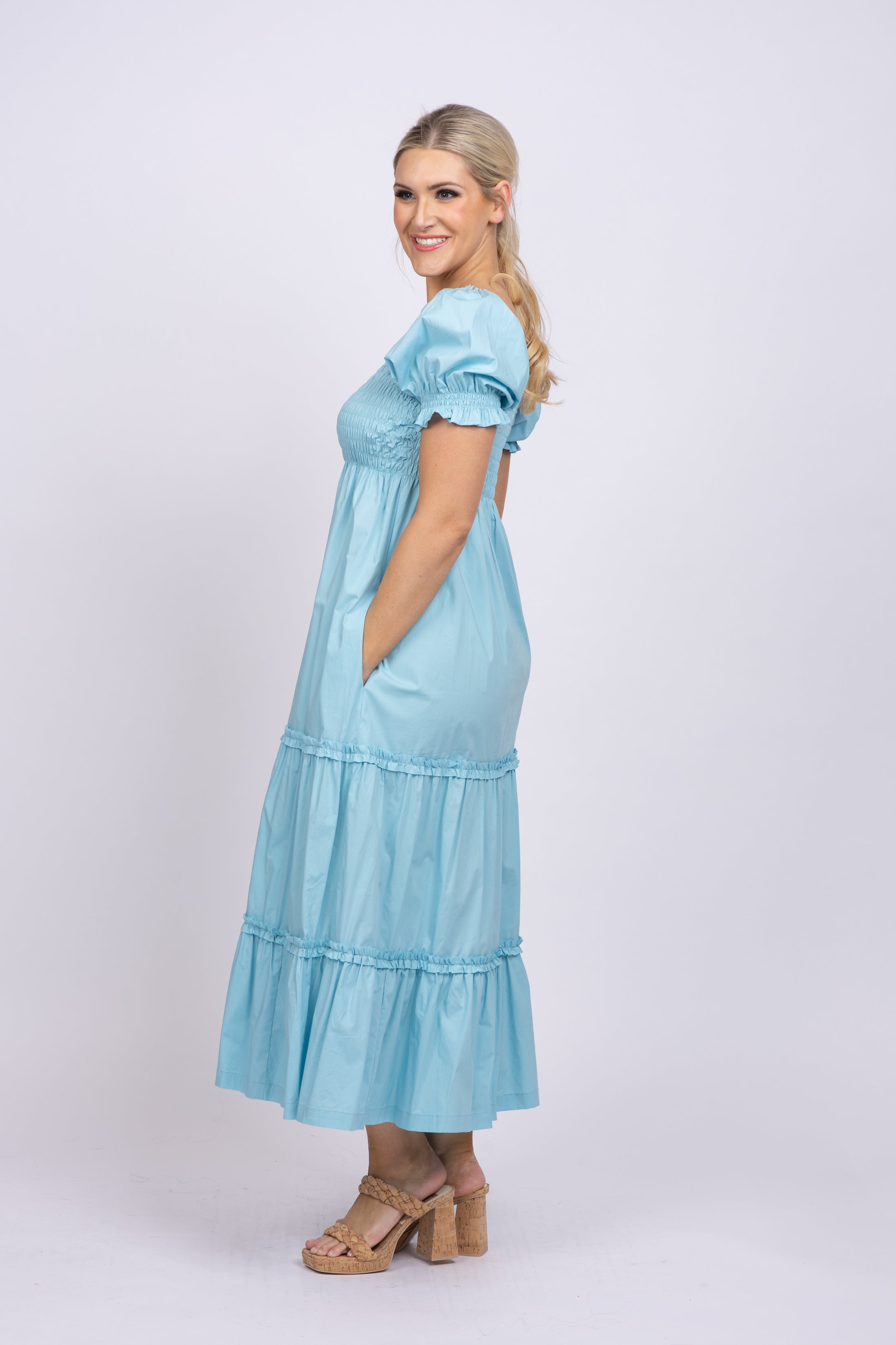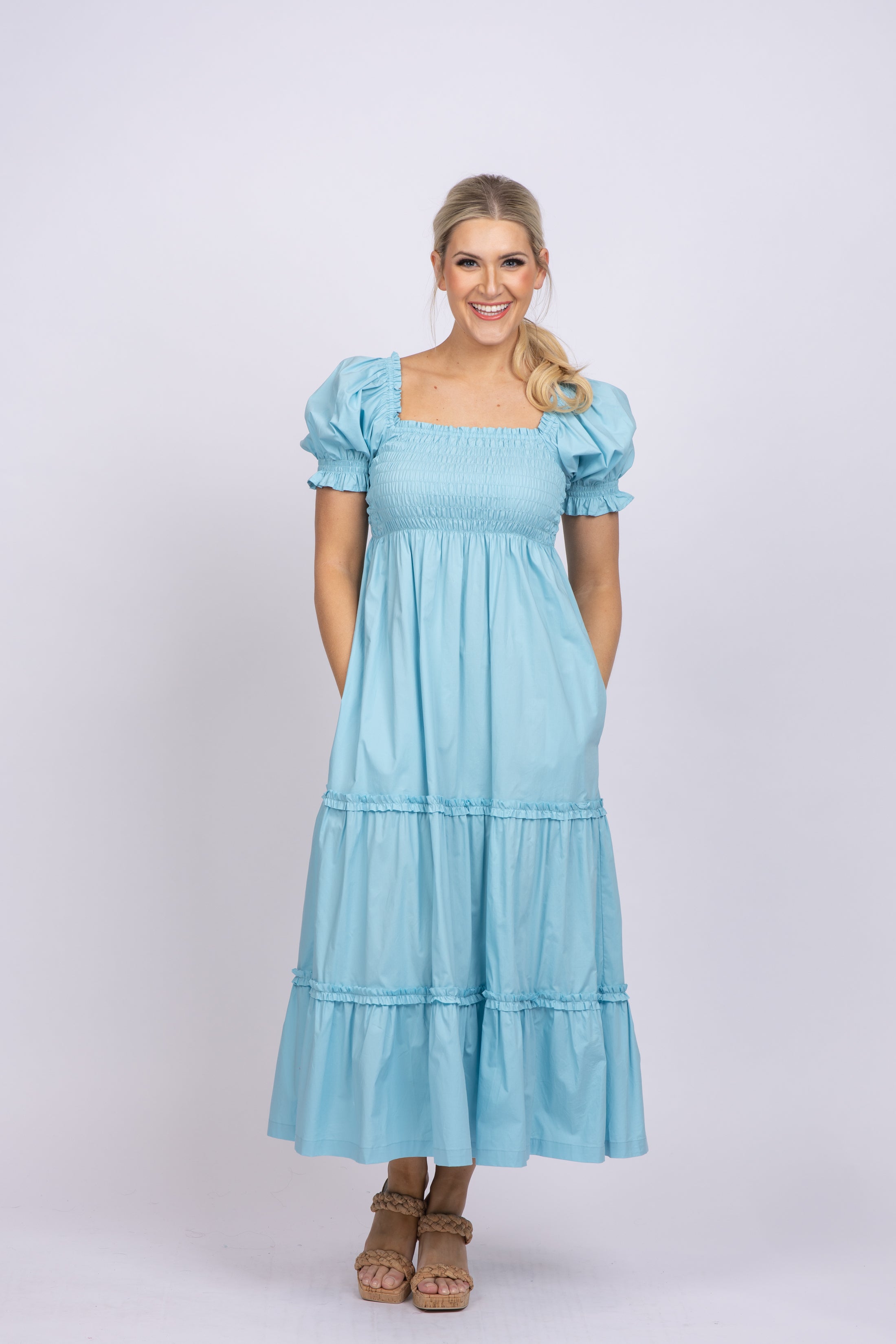 The Tyler Boe Kate Smocked Midi Dress is made with a smocked bodice, three-tiered skirt, short puff sleeves and side pockets. The 100% cotton fabric is oh-so soft, giving you an airy yet comfortable wear. Perfect for an outdoor party or summer event, this dress is sure to be a warm-weather favorite.