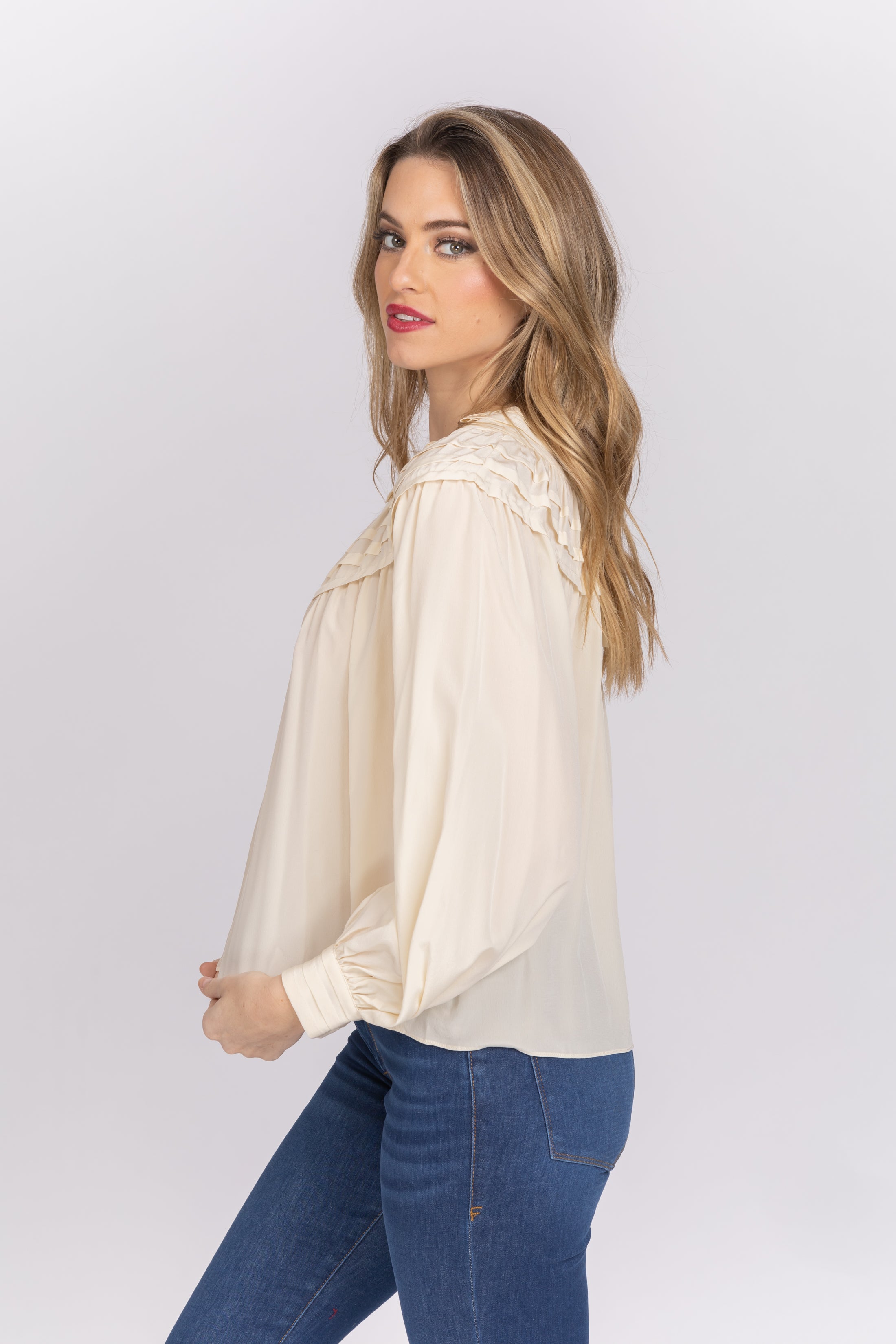 The Aria Blouse is a signature Ulla Johnson silhouette made from soft silk crepe de chine and adorned with a mesmerizing print of orchids and geometric shapes. It features an airy bodice with split neckline, full sleeves that are finished with buttoned cuffs, and an exaggerated ruffled yoke.