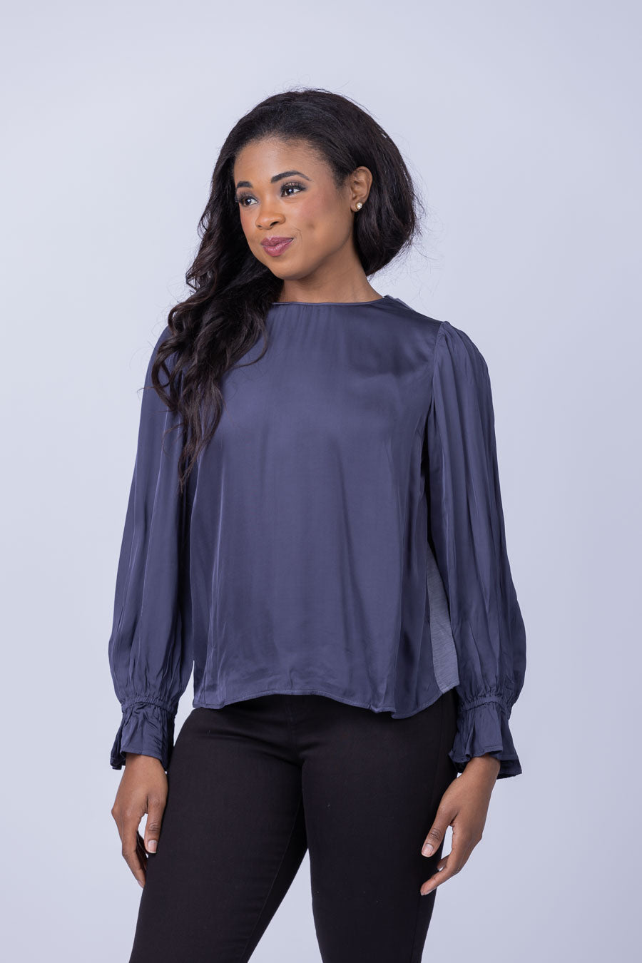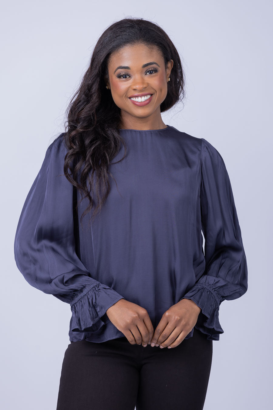 The Velvet Pari Top in Copen is the perfect blend of professional and chic. Its thoughtful button in the back and flattering sleeve detail make it a feminine staple. Great for the office or after-hours, you'll stay comfortable all day long.