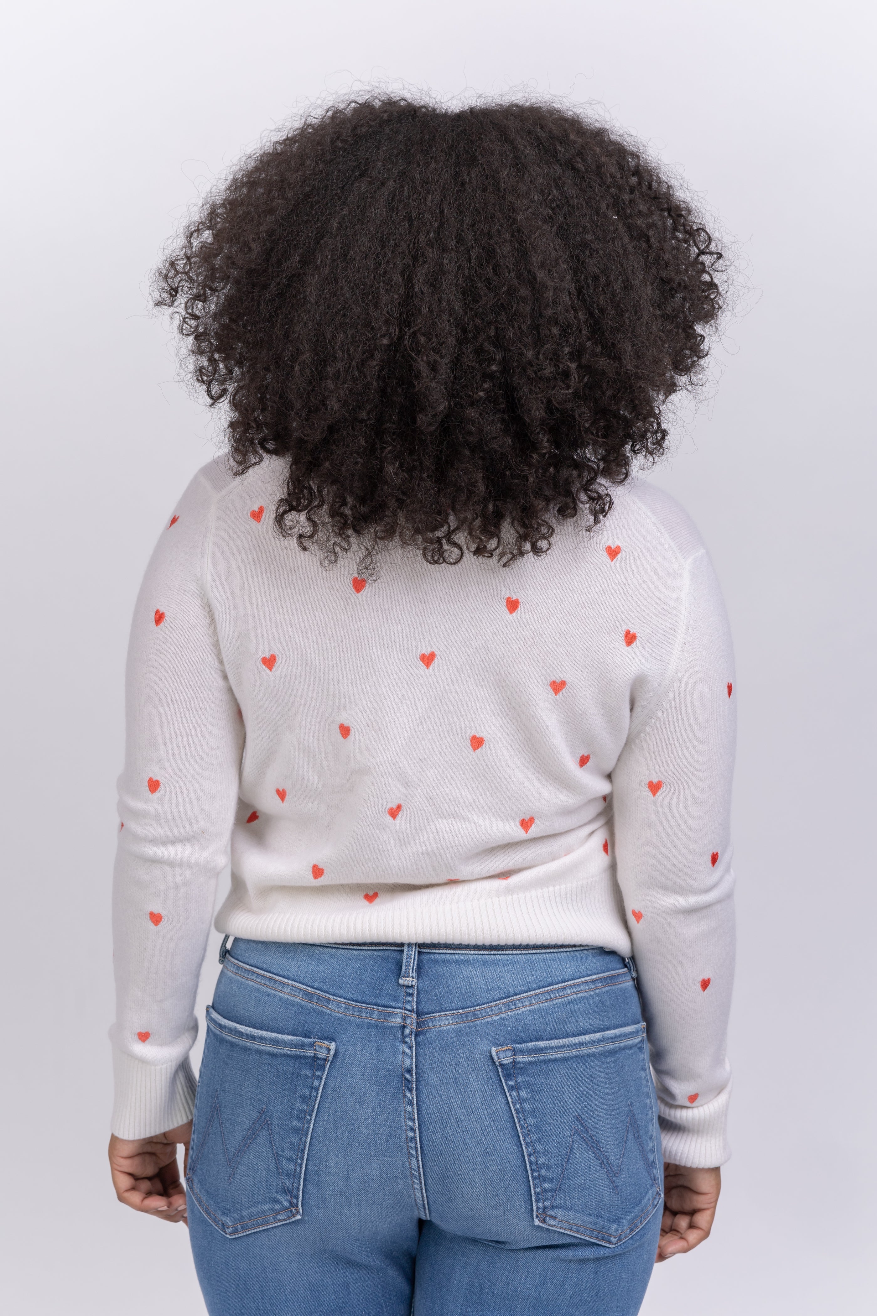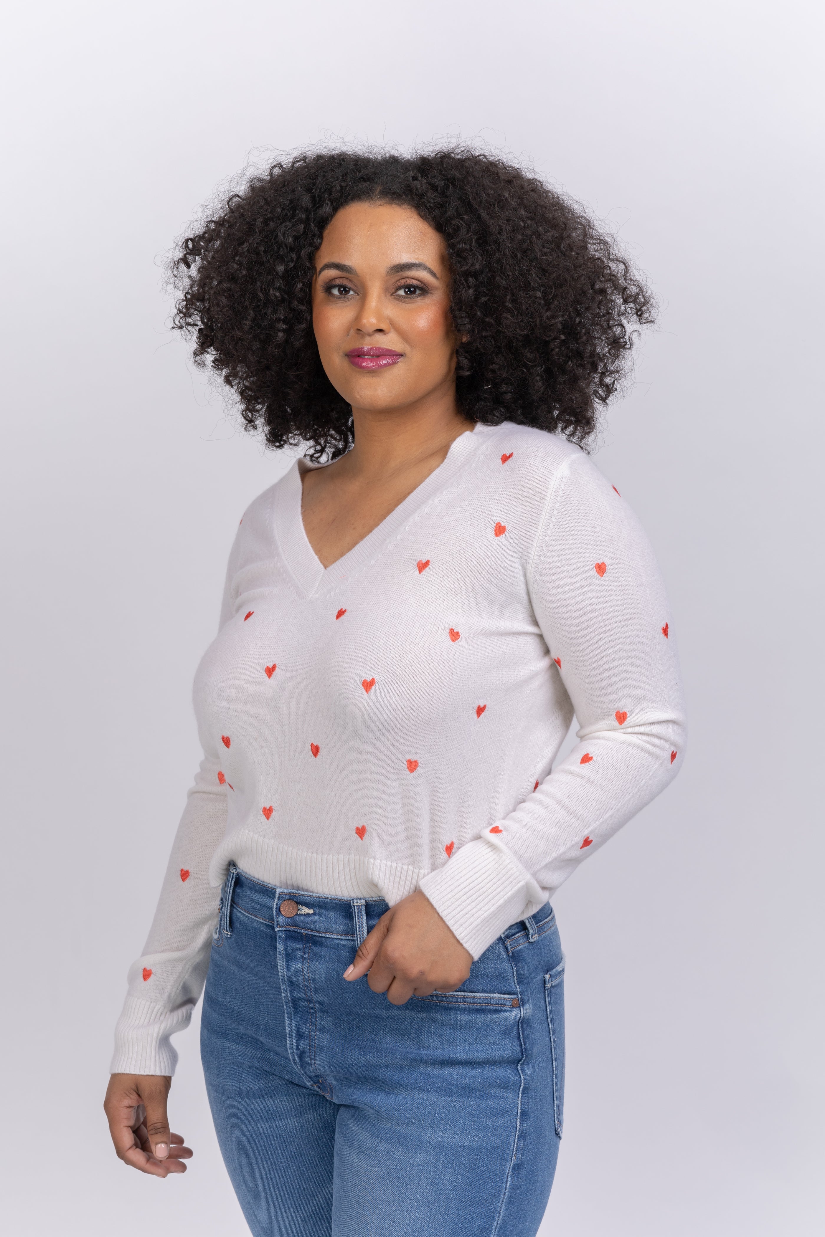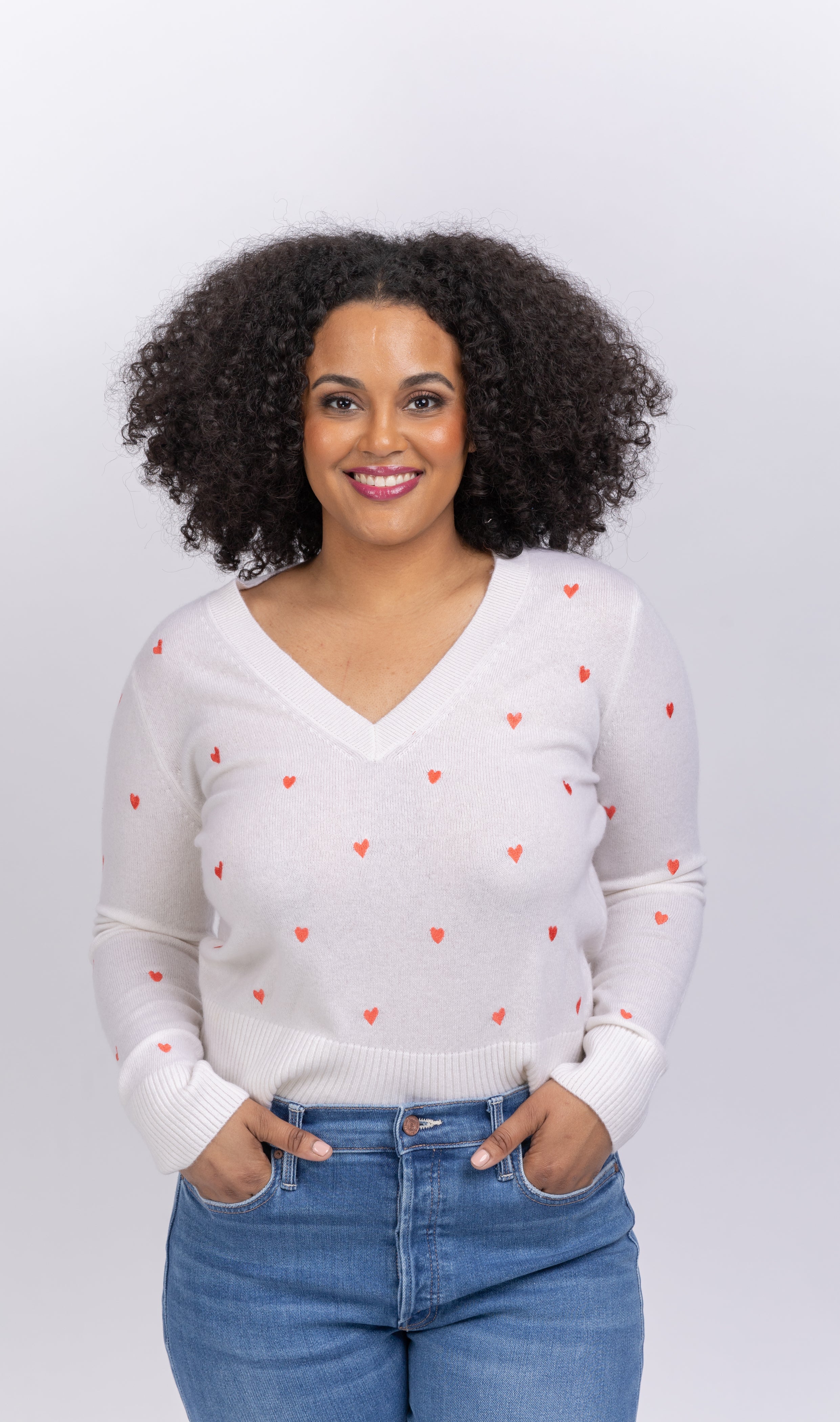 White + Warren Cashmere Embroidered Heart V Neck Soft White Red