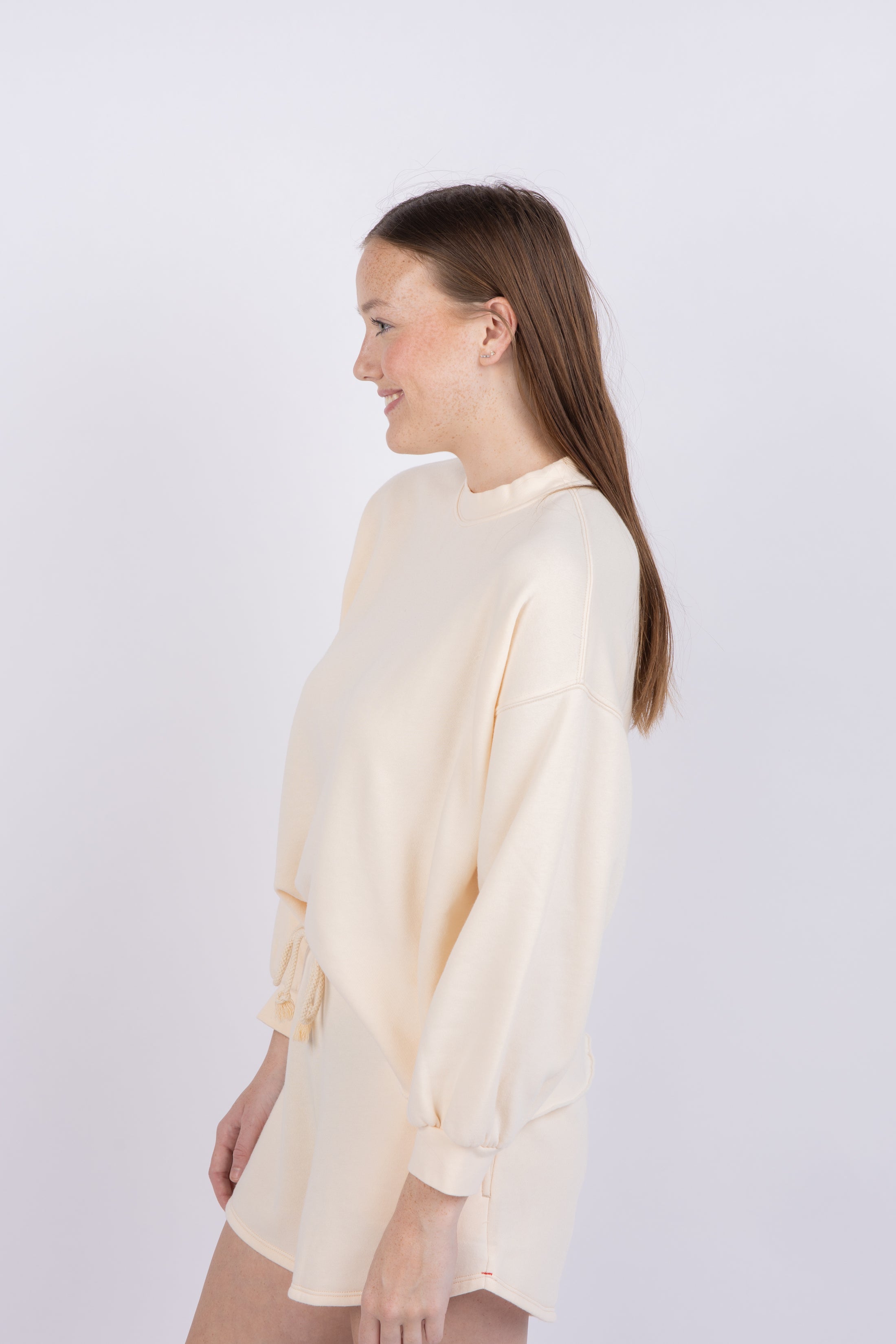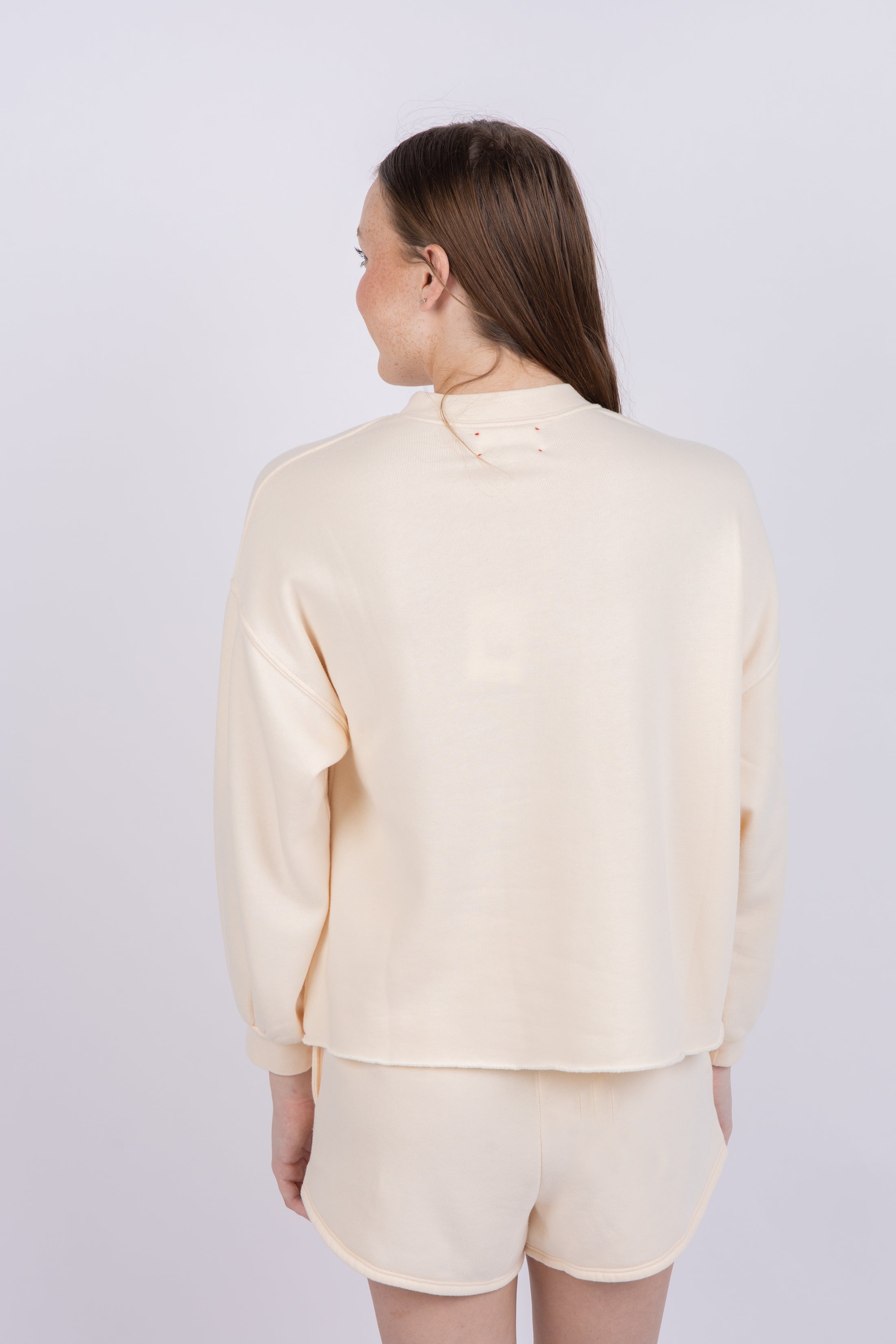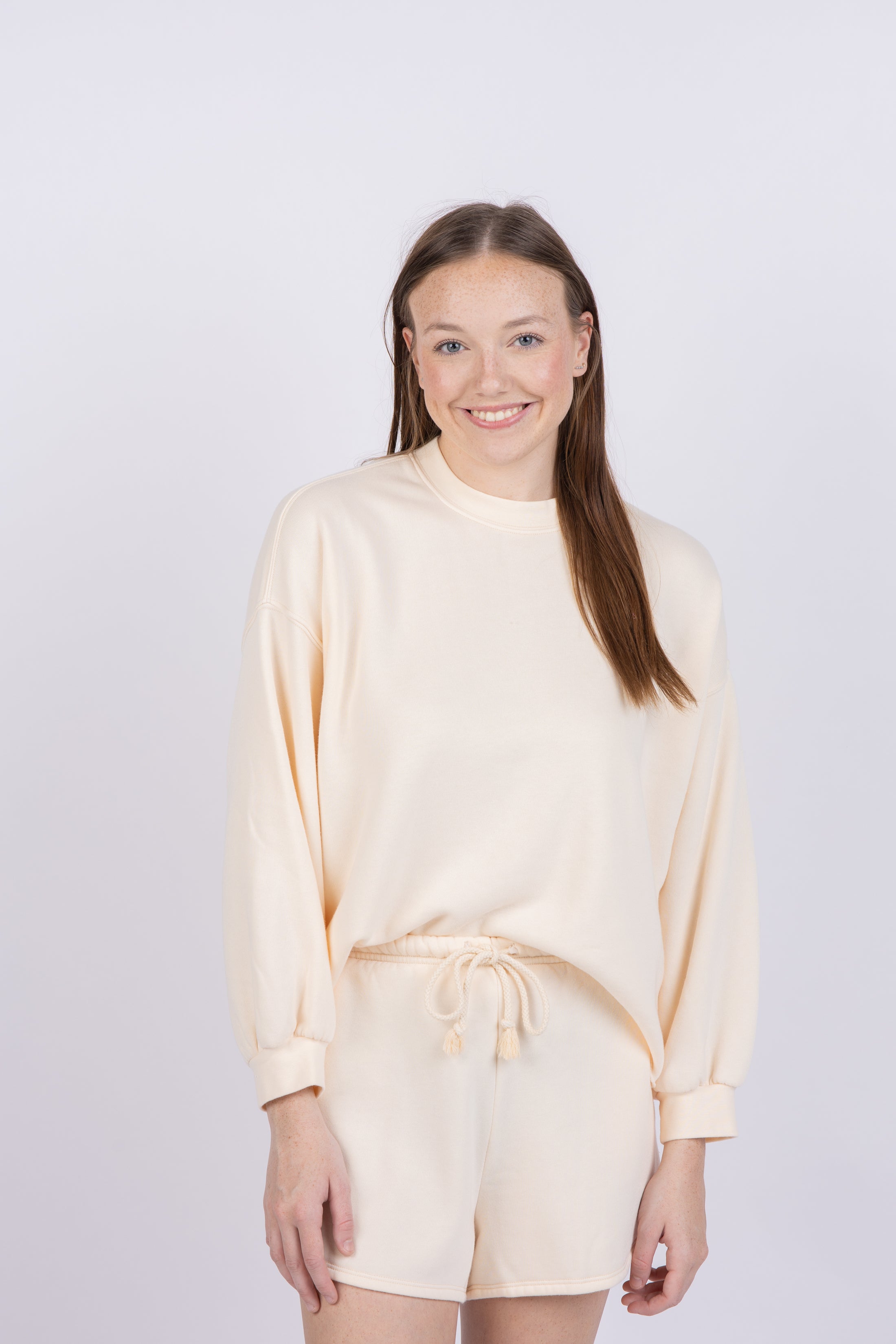 This timeless sweatshirt has full length sleeves and a slightly cropped raw hem. The loose fitting and soft material makes for the perfect throw-on basic!