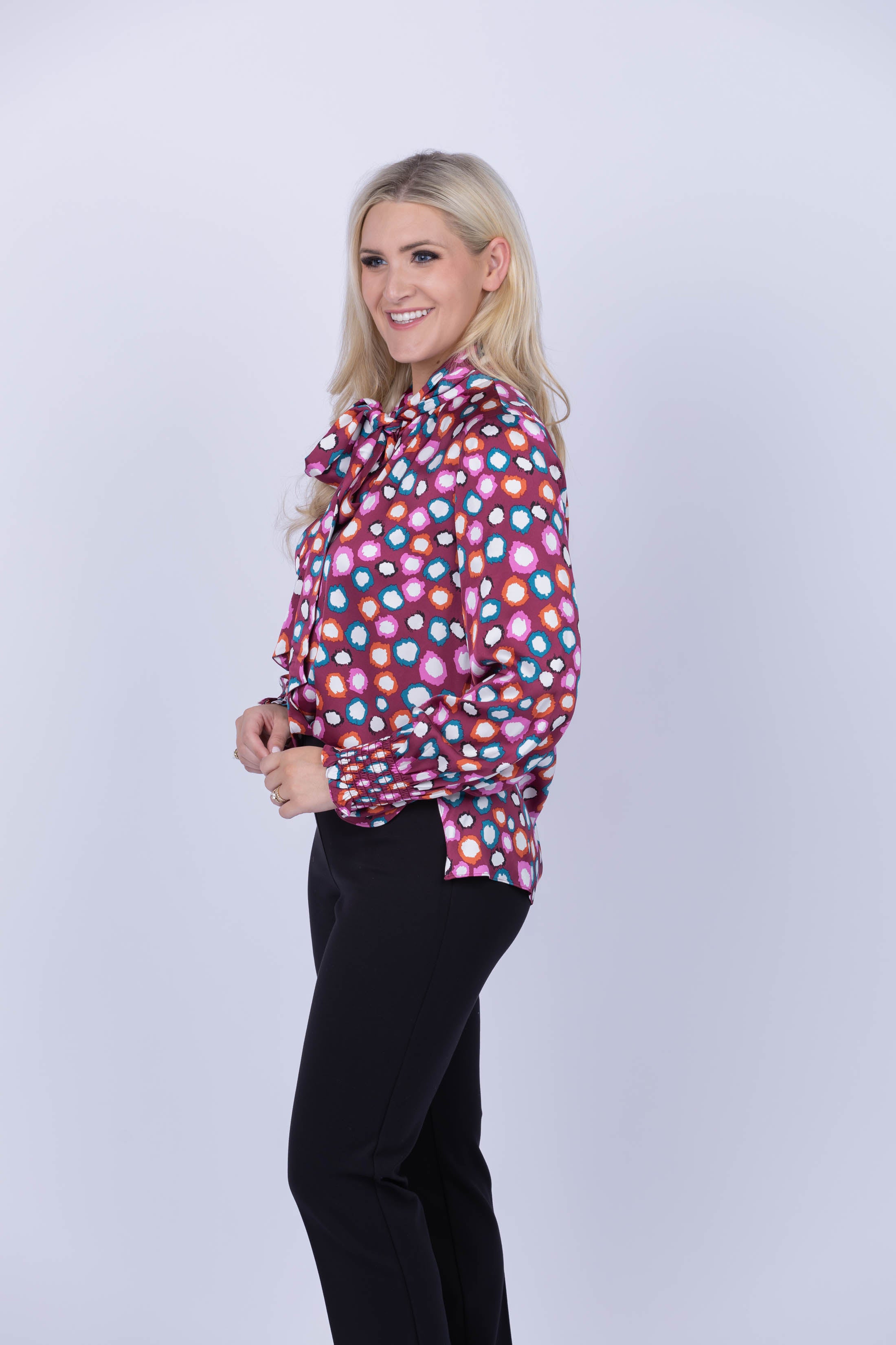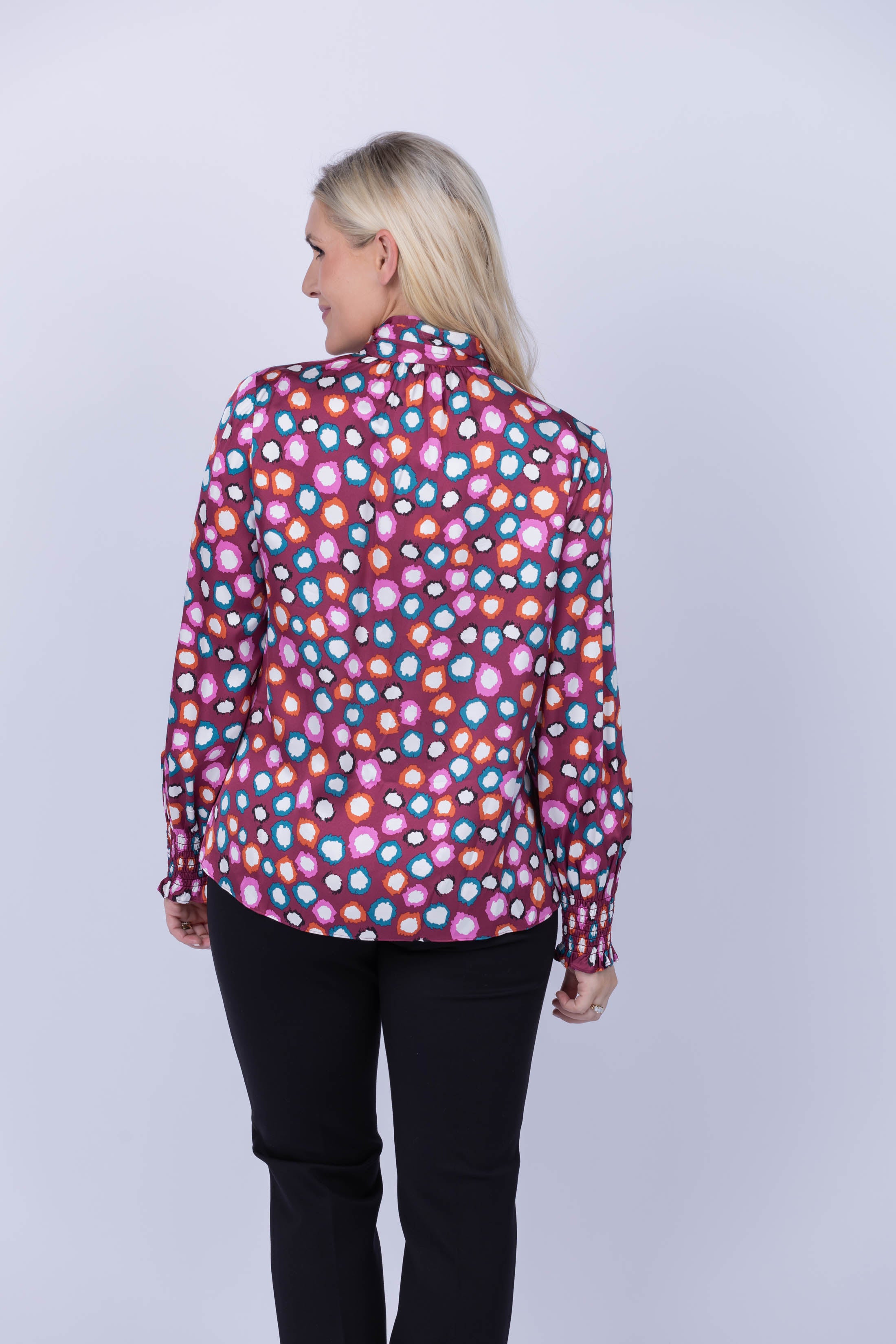 Look your best in the DVF New Tina Top. Cut from soft chiffon, it's light and breezy making you feel as confident and beautiful as you look. The button-up style has long sleeves with cinched wrists and flared cuffs, plus a scarf detail that adds a flirty touch. Show off your wild side with the Leopard Spots Wine Pink print. Get the confidence boost you need for any occasion!