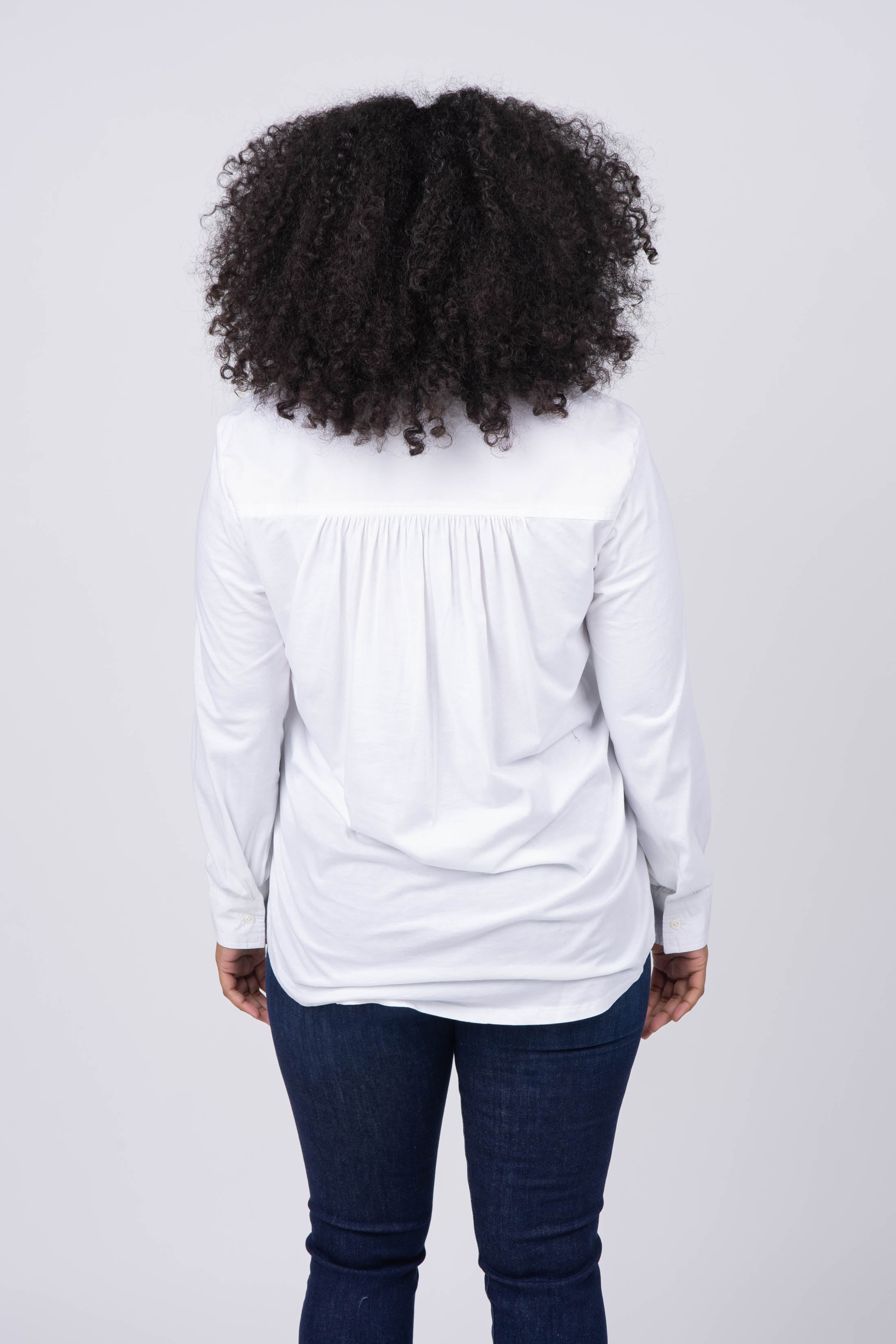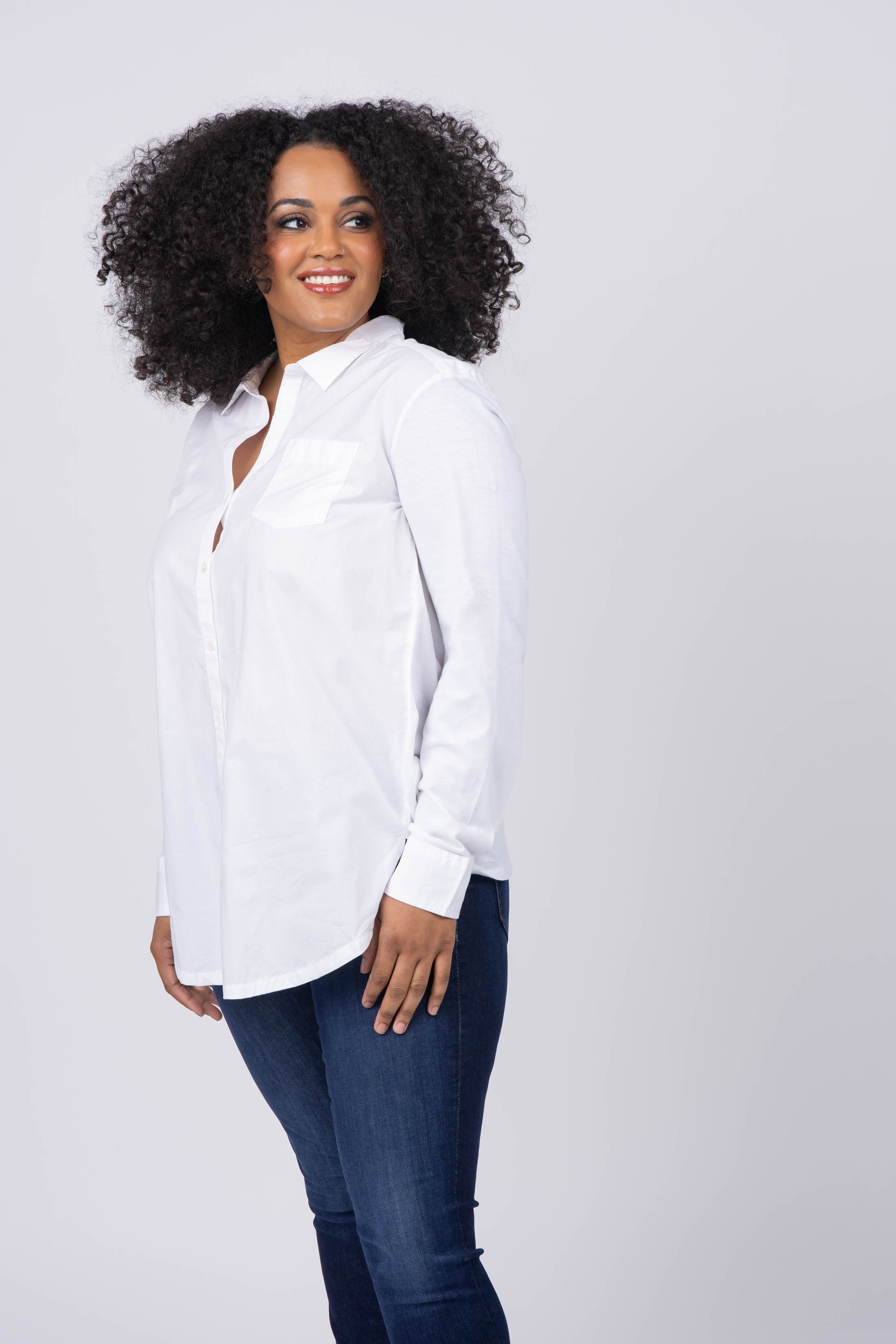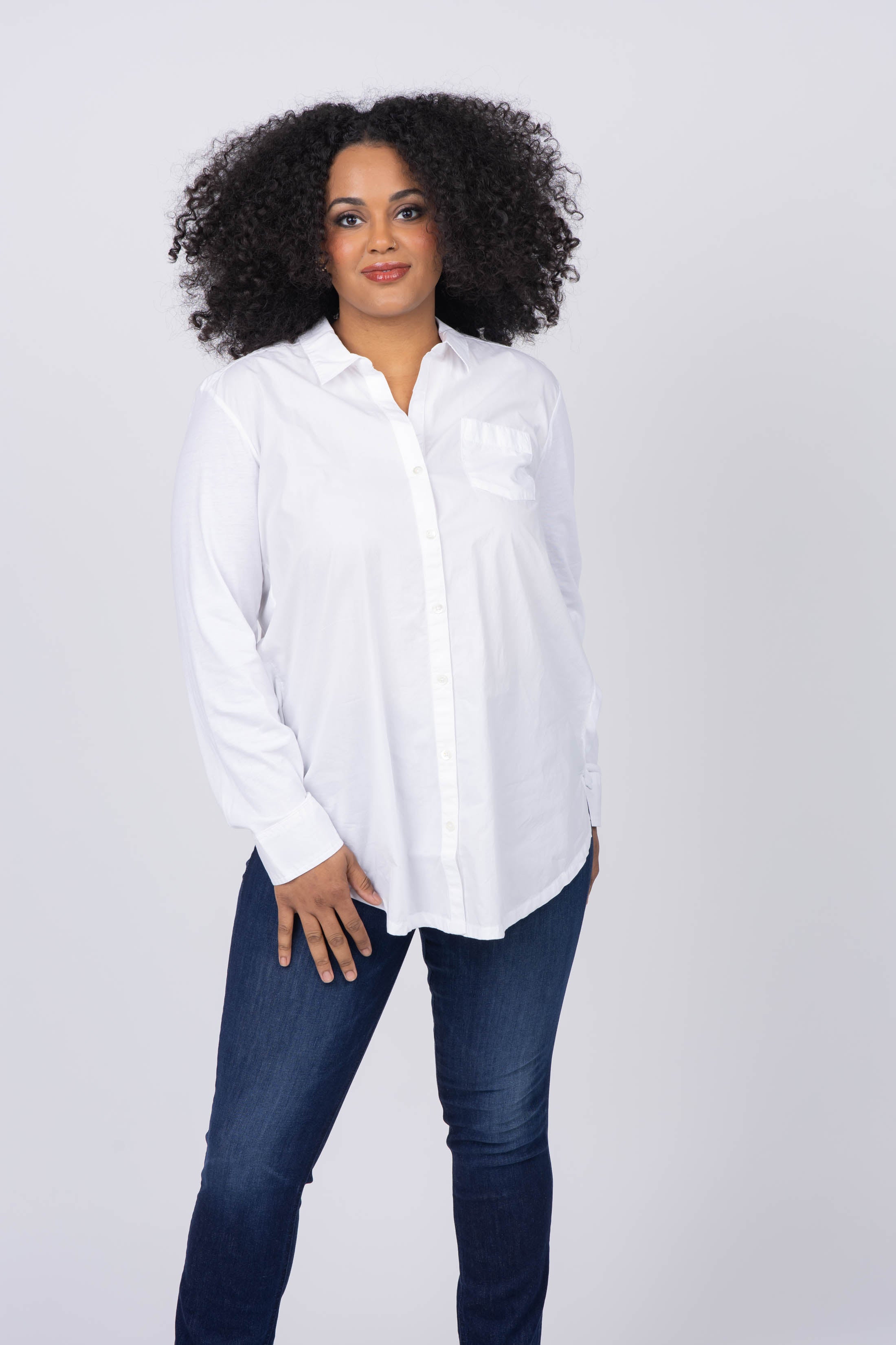 Embrace the overlap. Designed with an easy fitting and extra-long body, this essential button down is perfect with leggings--and just about any other casual style you throw at it. The material is super comfy 100% cotton and features a woven front, collar, cuff, and chest pocket while the back, body, and sleeves are a crisply cozy jersey knit.