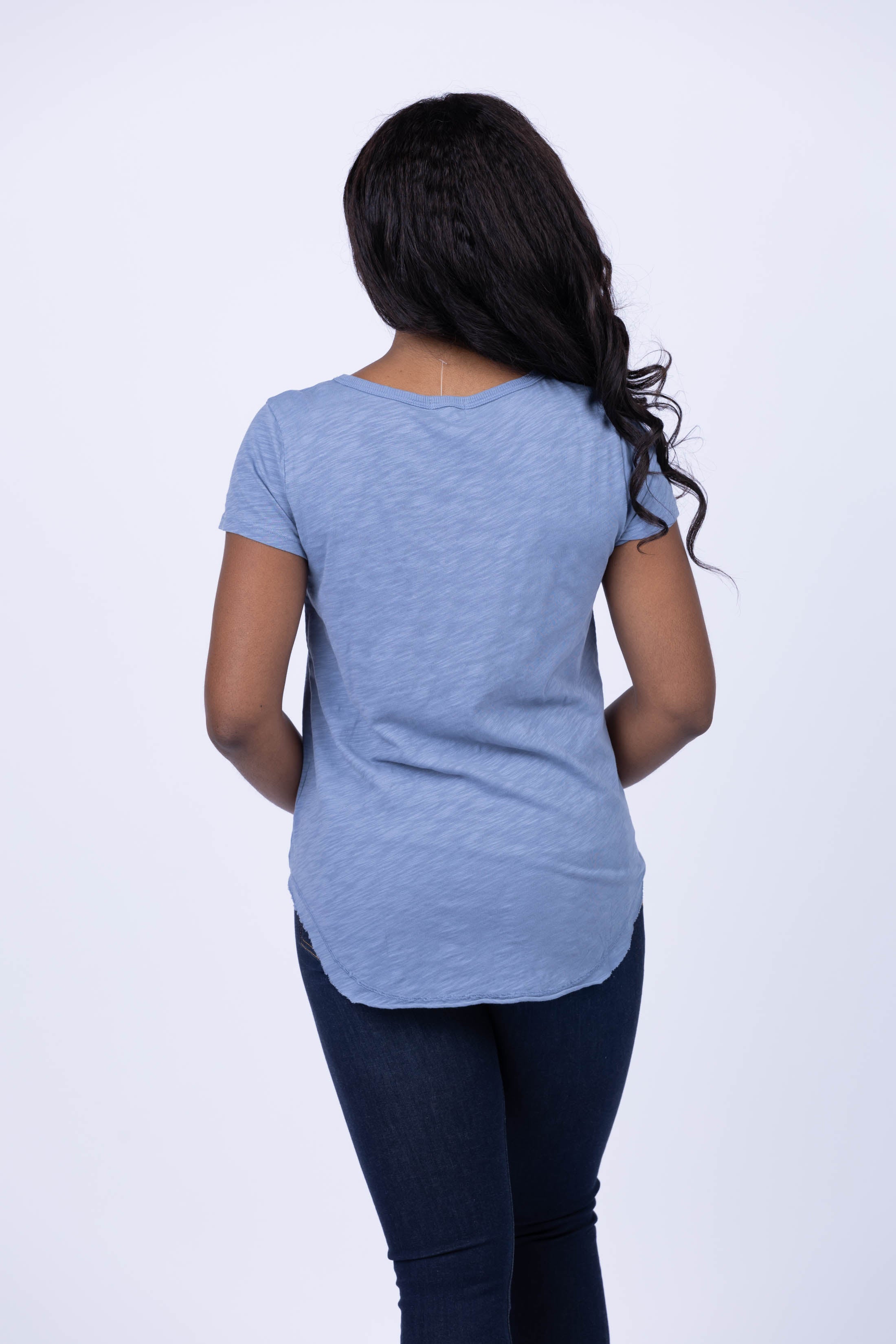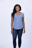 Dylan Shirt Tail-V W Raw Hem Top in Amber Blue