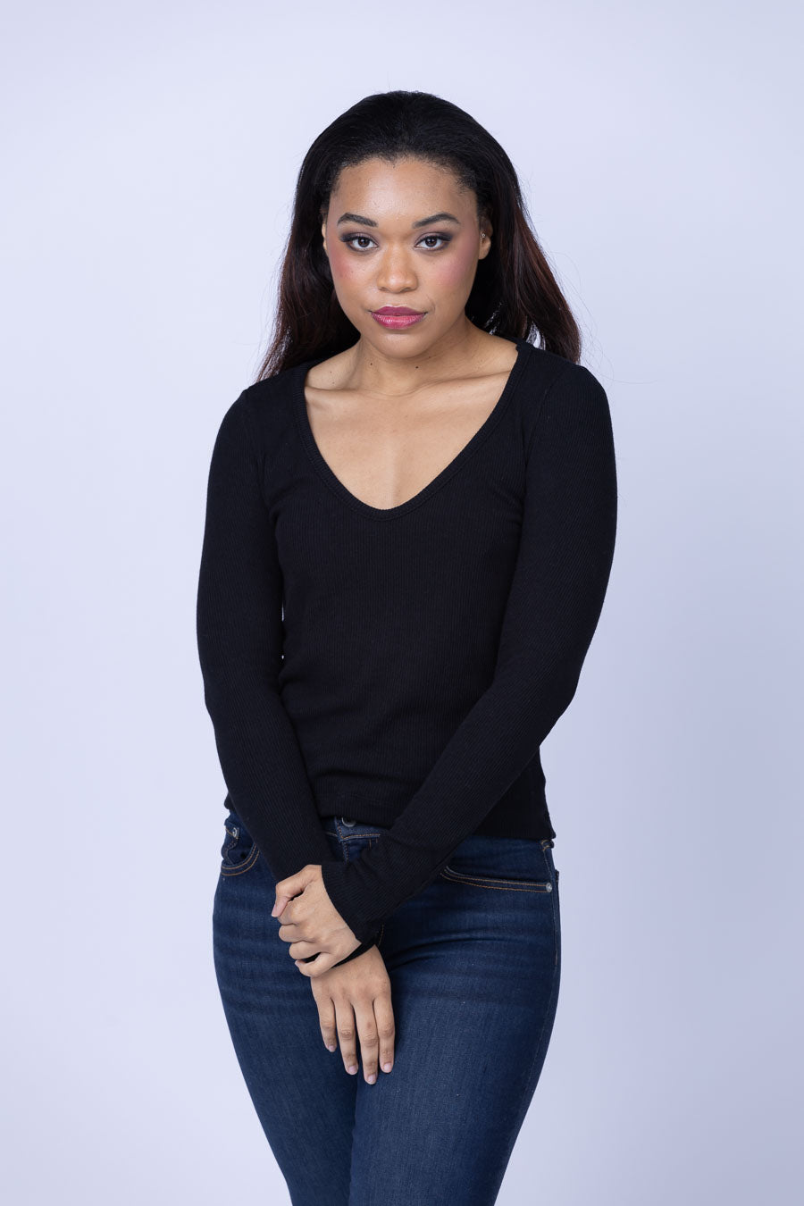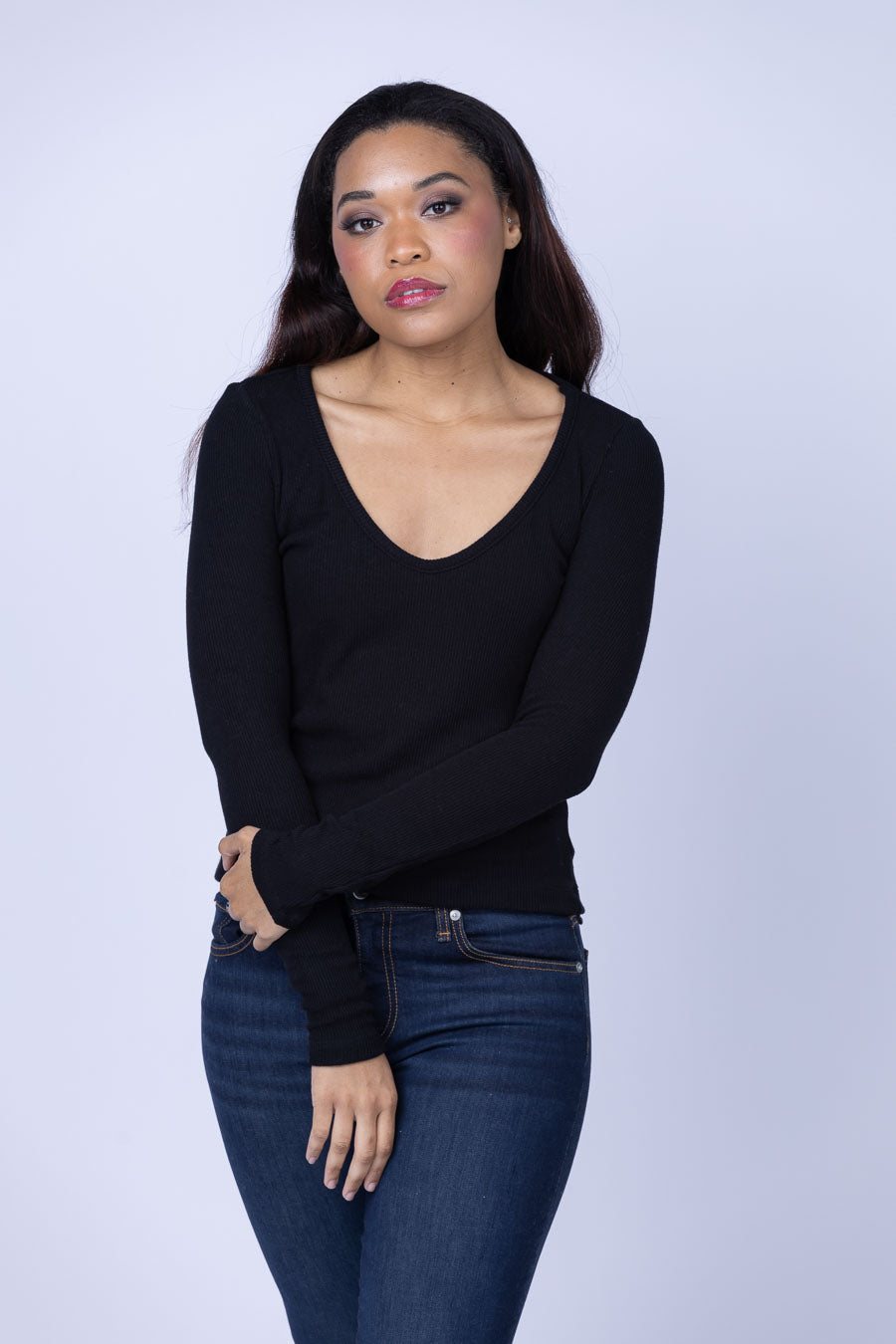 Be stylishly versatile with the Enza Costa Knit V-Neck Top! This classic black top is made with a luxuriously soft blend of Tencel and spandex, making it easy to wear under jackets and vests or as a standalone statement piece. With the Enza Costa Knit V-Neck Top, you get a closet staple that will never go out of style.