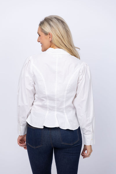 The Honor Top. is inspired by vintage Victorian tuxedo tops with a charmingly awkward fit. The classic silhouette features dramatic pleats, princess seams that nip in the waist and kick out at the hem, and billowy sleeves with pleats at the shoulder that add a blouson effect. The top’s tailored collar and sleeve cuffs add a cool menswear edge, and it’s finished with delicate shirting buttons at the front and sleeve cuff.
