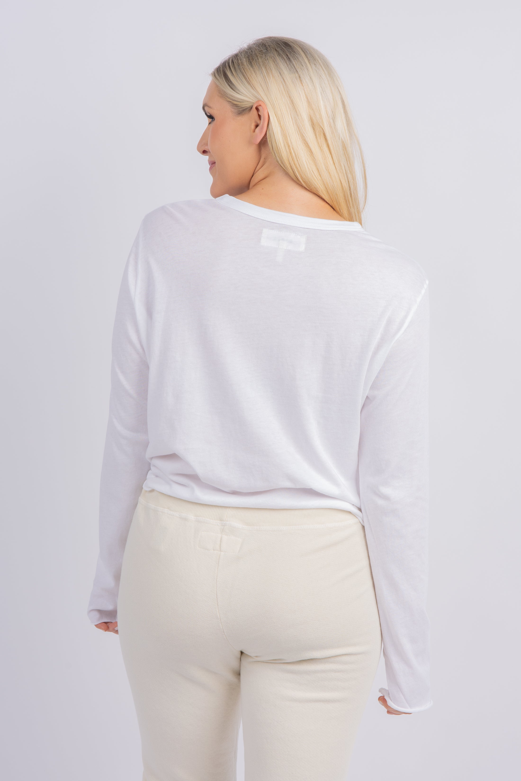 The Great. The Long Sleeve Crop Tee in True White is the perfect layering piece. Crafted from soft and comfortable 100% cotton, this boxier and shorter tee features raw hem and cuffs and slim long arms. Get ready to have an effortlessly cool and fashionable look - just machine wash cold and tumble dry low!