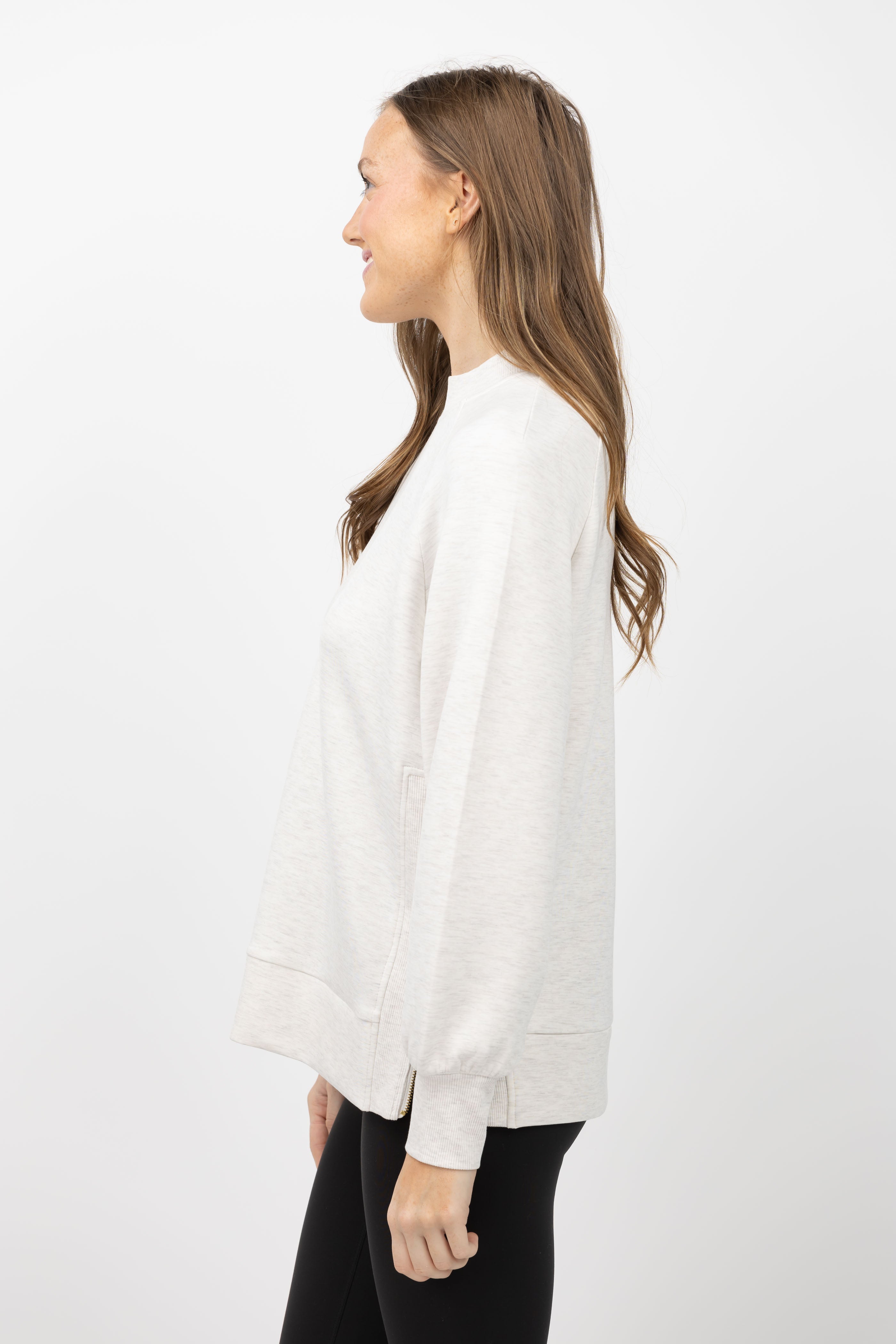Experience ultimate comfort in the Varley Nicole Sweatshirt in Ivory Marl! Our soft fabric and deep hem provide a cozy fit, while the side zipper adds a touch of style. Upgrade your loungewear game with this must-have piece!