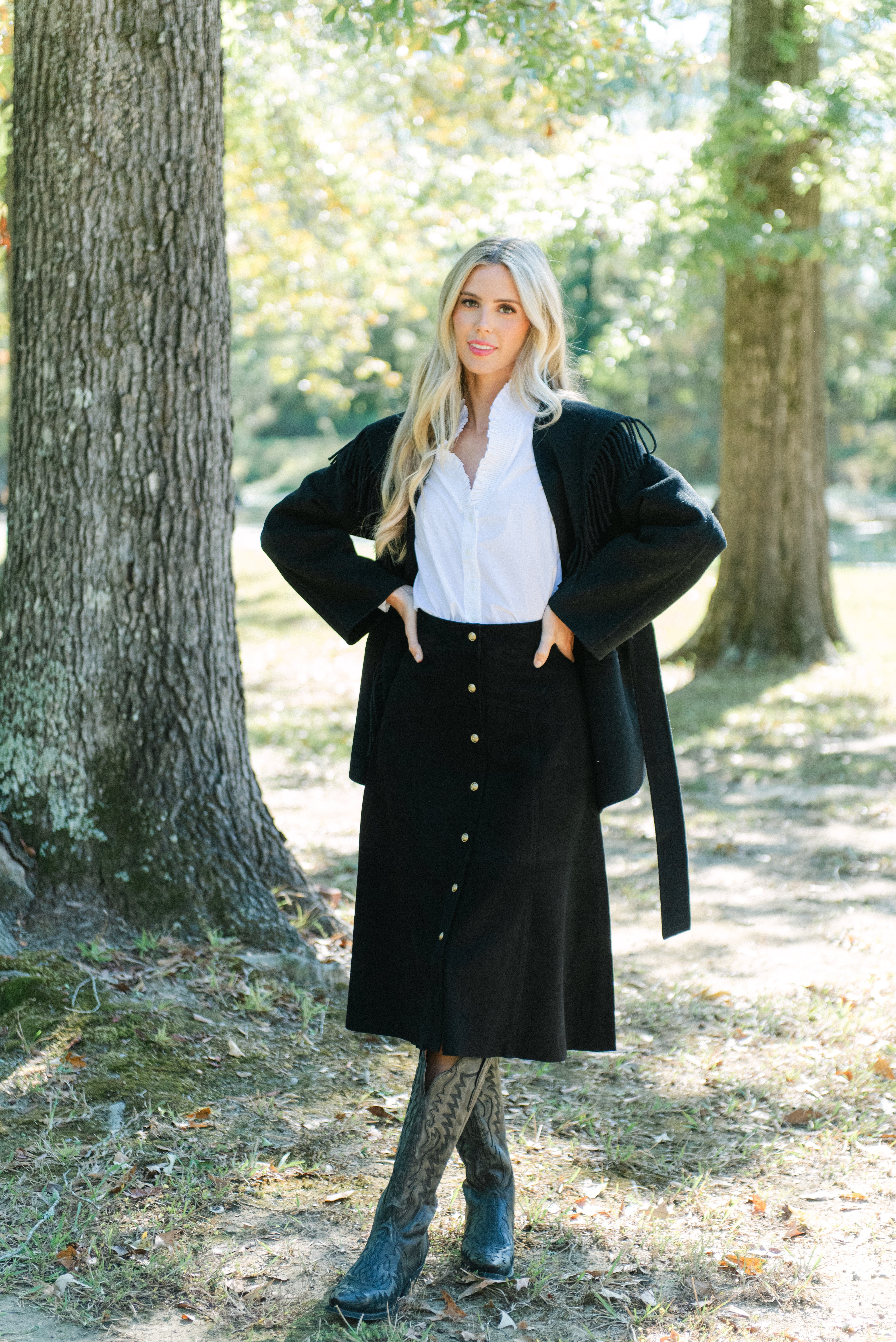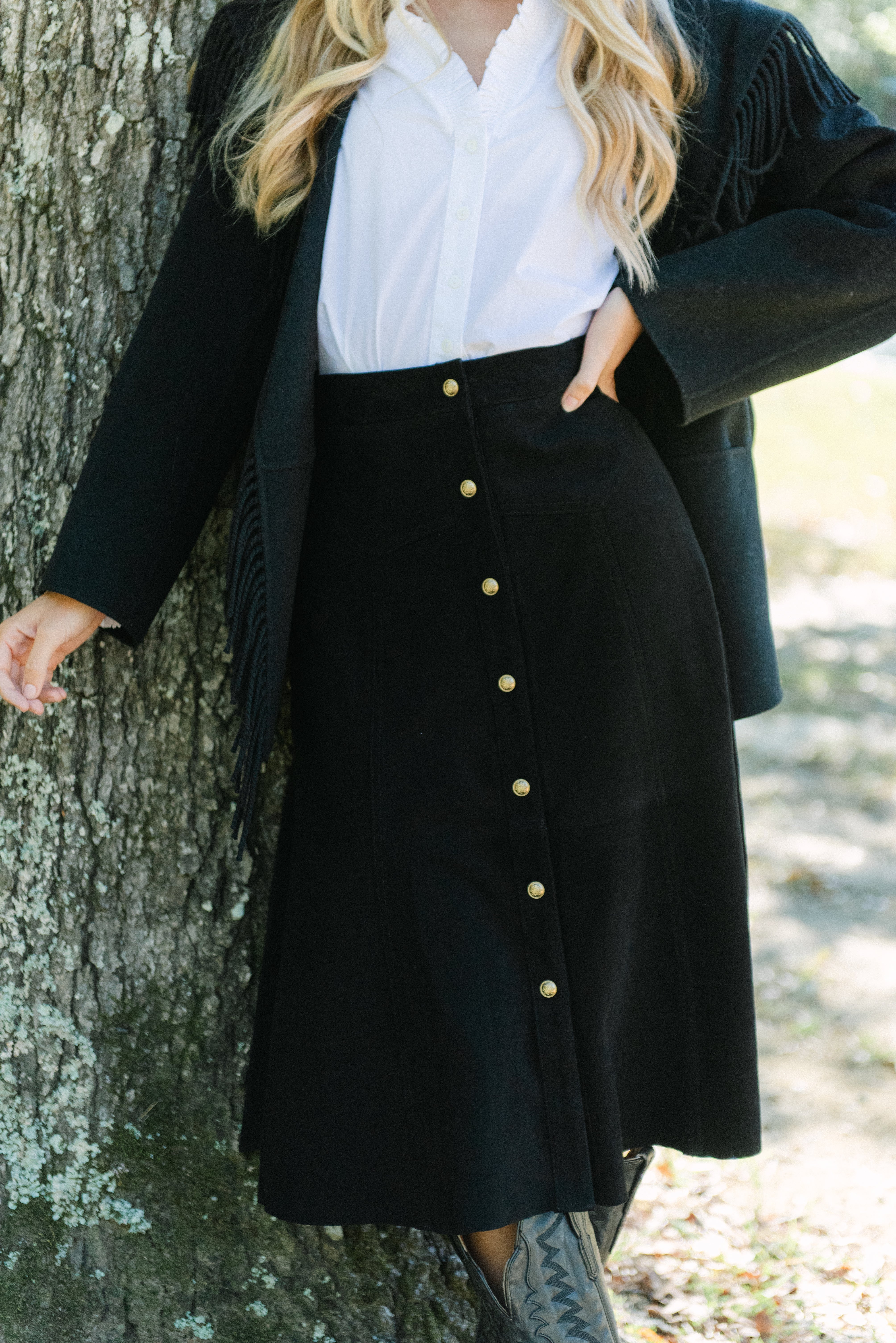 The Alice + Olivia Calica Suede Snap A-line Midi Skirt in Black combines rustic charm with refined sophistication. Crafted from soft lambskin, its high-waisted A-line silhouette flatters your figure while gracefully falling to mid-calf. The feminine shape moves effortlessly with every step, accentuated by elegant snap-front button closures. Perfect for elevating your wardrobe with timeless style and comfortable luxury.