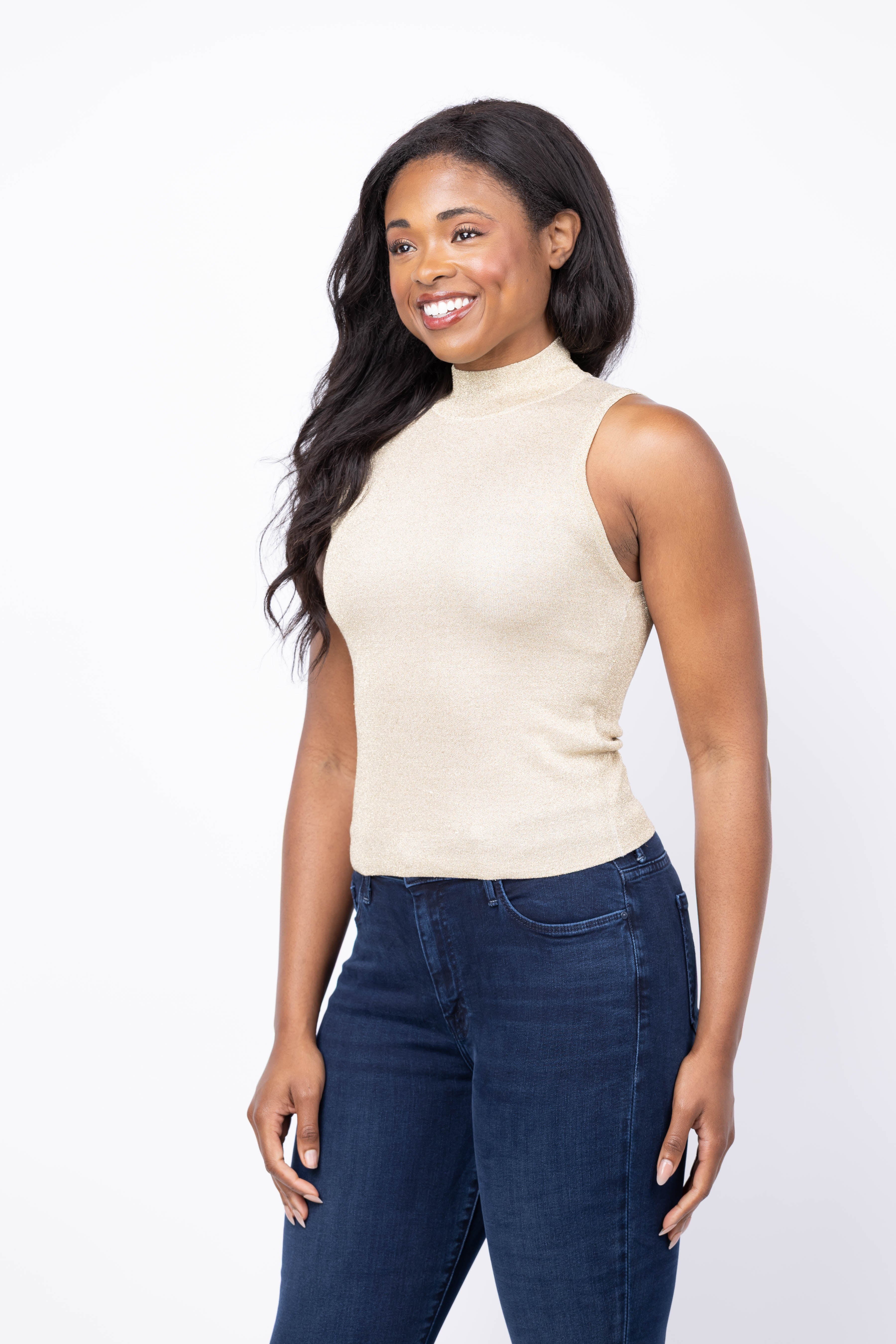 This luxe wool blend tank is the ultimate wardrobe essential that effortlessly transitions from day to night. The fitted silhouette flatters every frame, while the turtleneck provides cozy warmth perfect for cooler seasons. Metallic knit detailing adds just enough shimmer to elevate your look for evening occasions. Sleeveless and versatile, it's the piece you'll reach for again and again—whether layered under blazers or styled solo for sophisticated appeal.