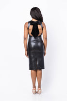 Elevate your evening look with the Alice + Olivia Wynell midi dress, a sophisticated piece that commands attention. Crafted from luxurious smooth faux leather, this sleeveless design features a flattering jewel neckline and a show-stopping open back adorned with an elegant velvet bow. Perfect for cocktail events or upscale dinners, this vegan leather dress combines modern edge with timeless elegance. The midi length offers versatility while the dramatic back detail ensures you'll turn heads from every angle.