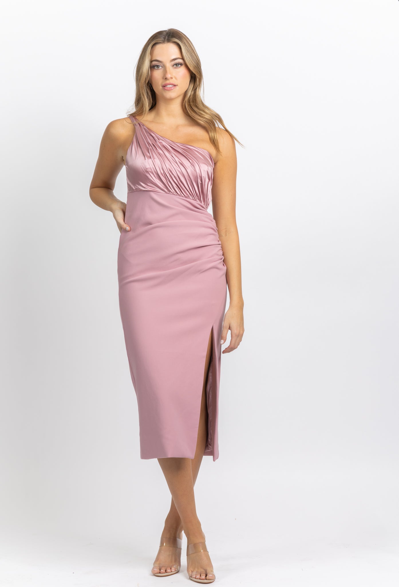 Crafted of smooth satin, the Trenton dress is finished in a one-shoulder silhouette.