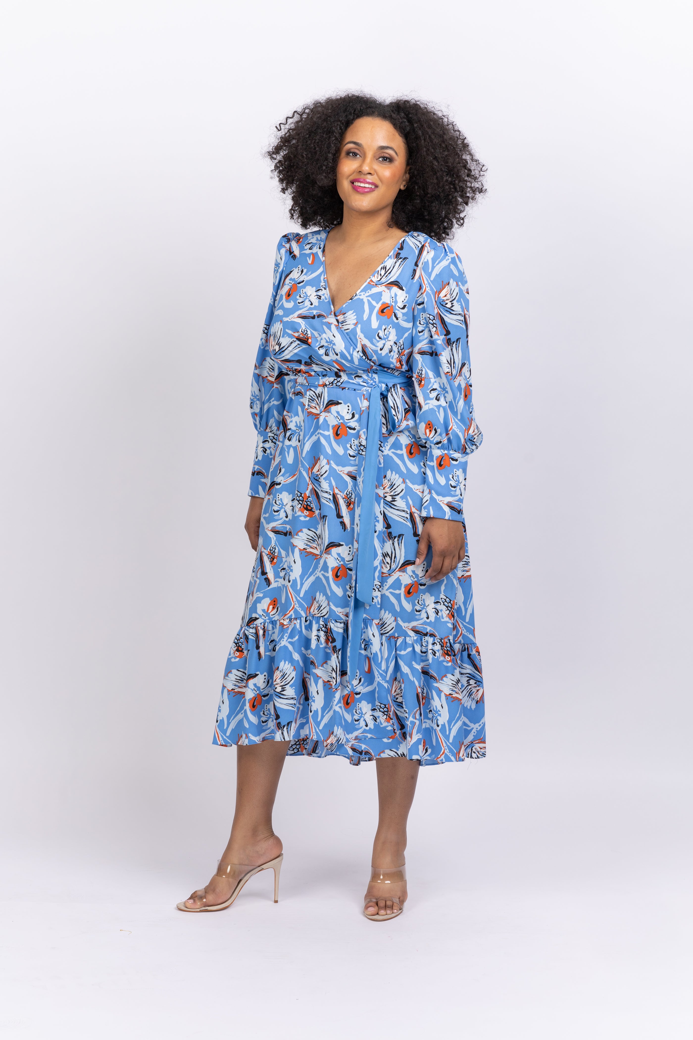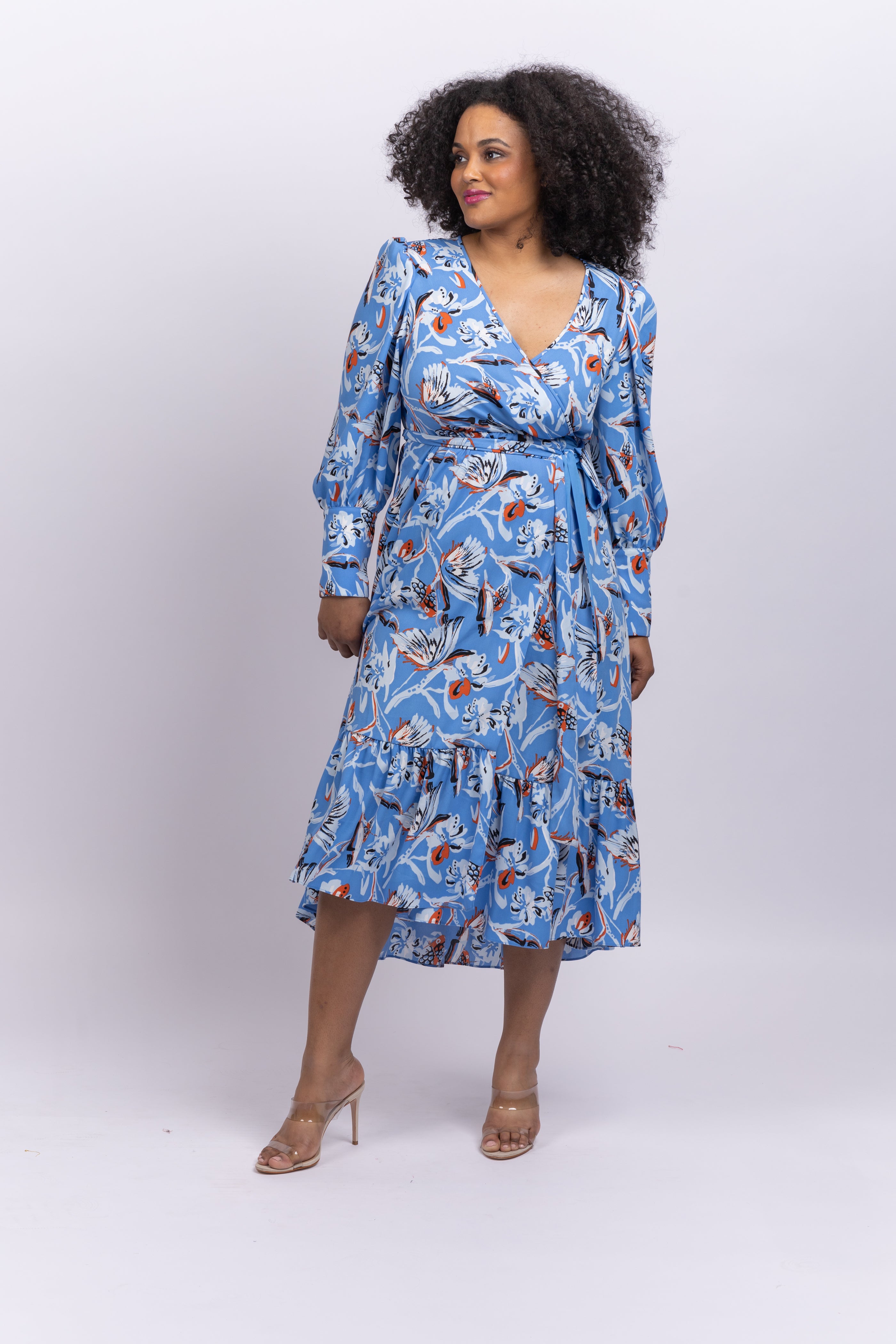 A classic wrap with a twist, the Blade is colorful and elegant. This piece has slightly ballooned, three-quarter sleeves, a wrap detail, and is midi in length, ending in a subtle peplum hem. Cut from a crepe, it is soft, breathable, and airy.