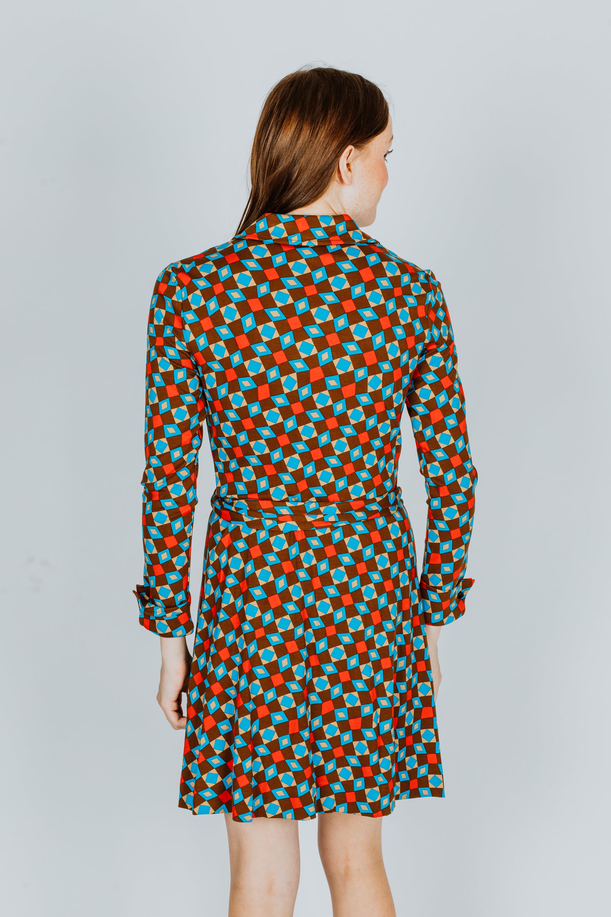 Didi is a mini shirt dress with our iconic wrap detail. It is stretchy in fit and uncompromising in its bold, 70s inspired print. Pair it with some chunky boots for a seamless work to happy hour look.