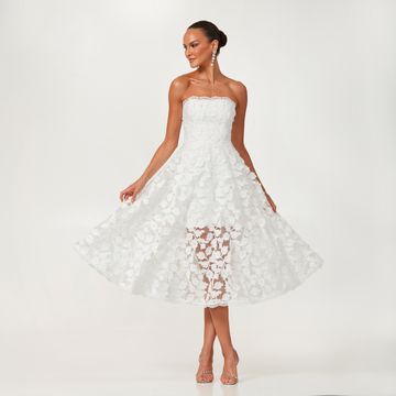 Embrace elegance and beauty in the Helsi Florence Dress. The white dress features stunning 3D floral embroidery, with a delicate scallop detail on the bodice and hem. The fitted strapless bodice and fit and flare silhouette create a flattering shape, while the fully lined front bodice and skirt ensure a comfortable fit. Perfect for any special occasion, this non-stretch dress is complete with a side zipper closure for easy wear.