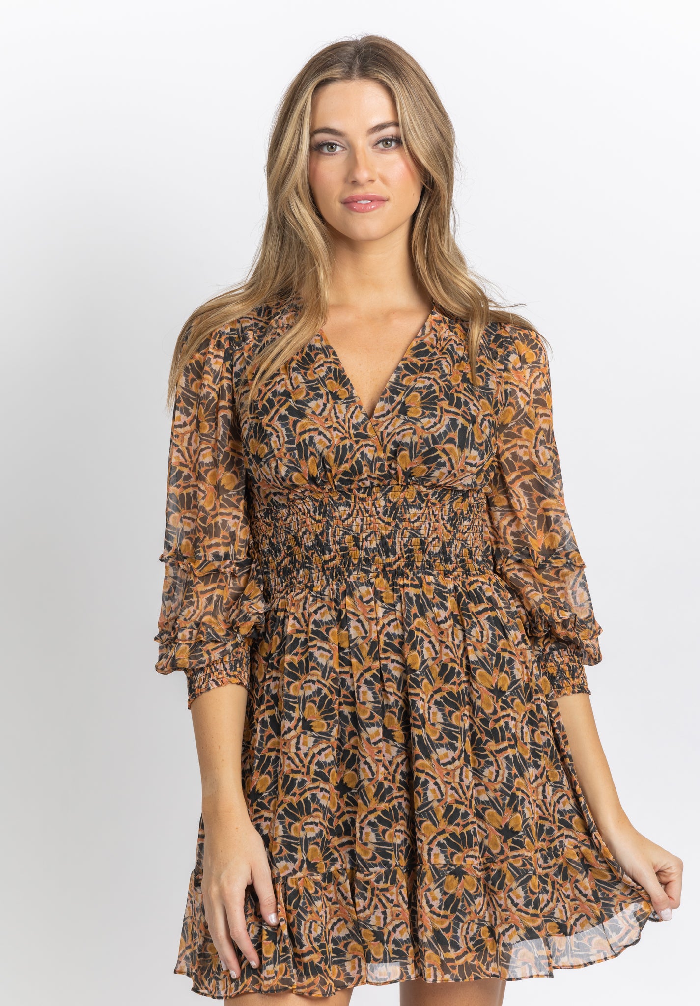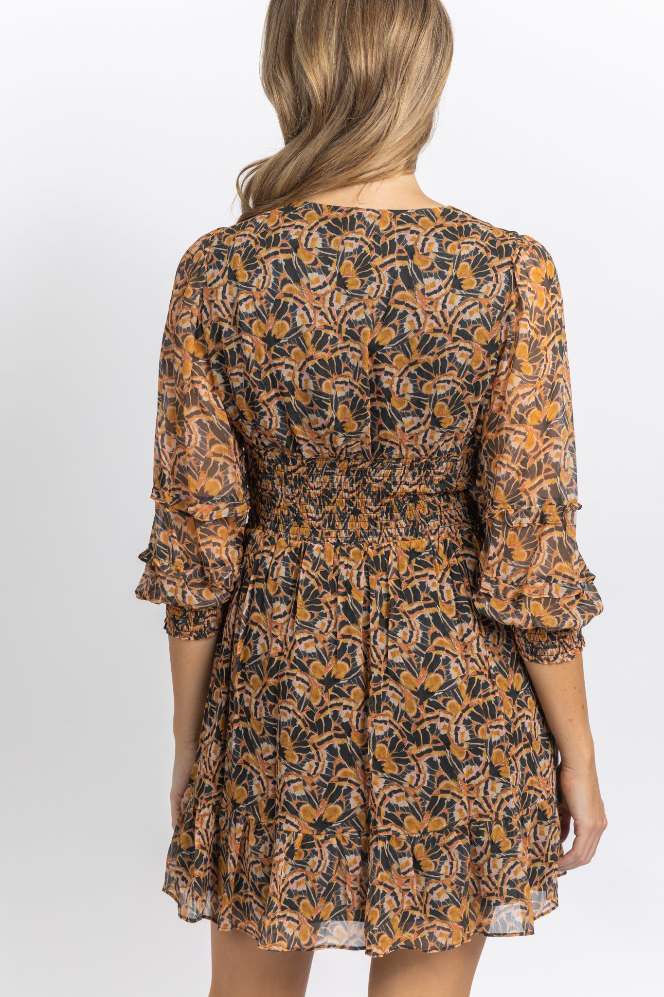Beautiful abstract printed crinkle chiffon mini dress. Style features a v-neckline, e/4 length balloon sleeves with ruffle details and smocked cuffs, and a smocked waistband that goes into a simple skirt. Body lined. Sleeves unlined. Slip in.