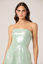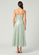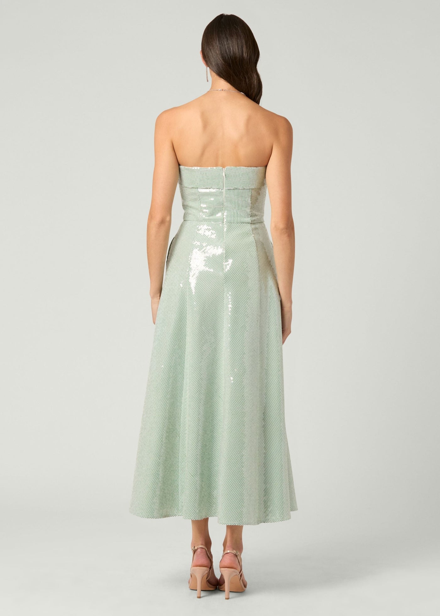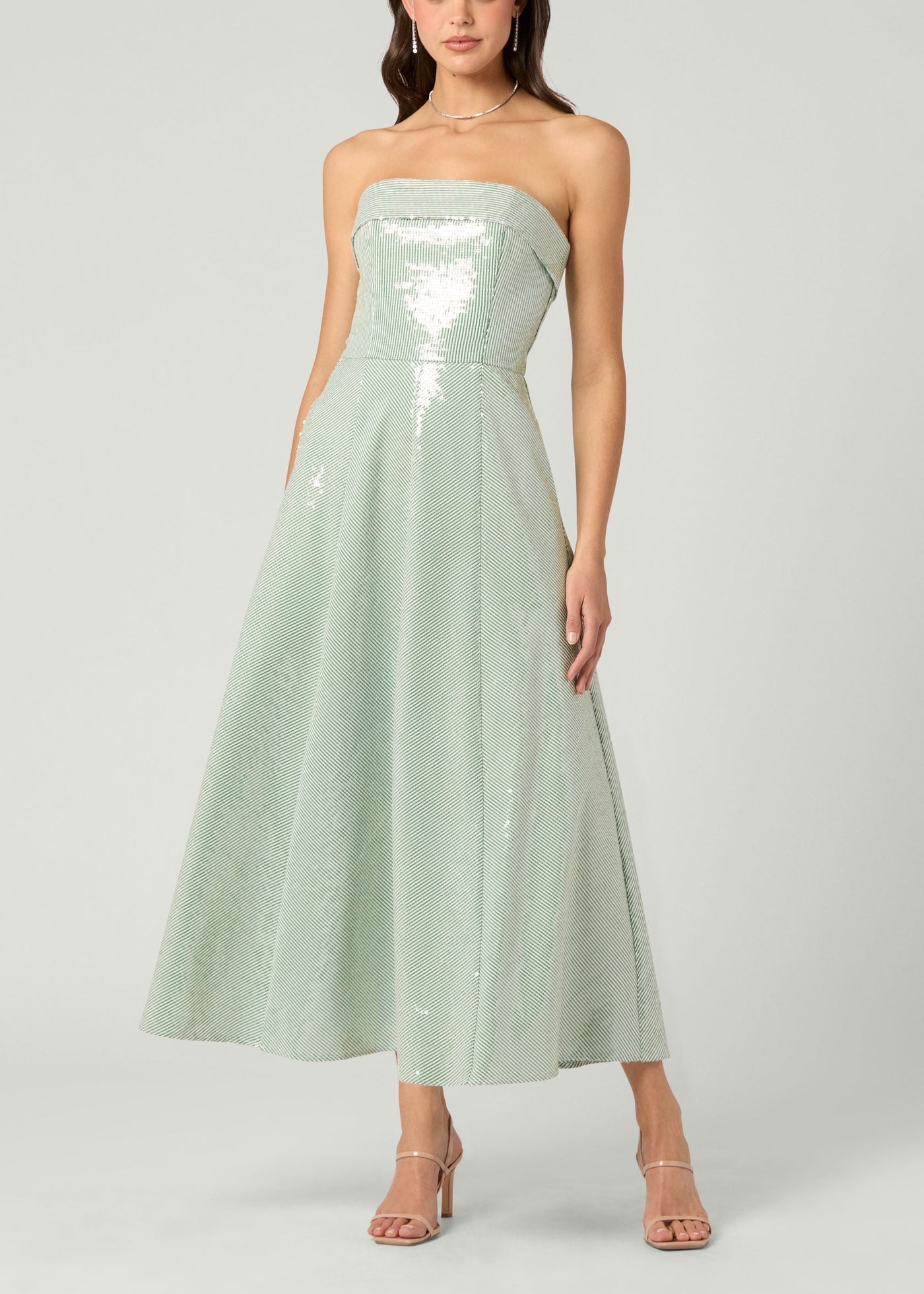 The Shoshanna Kiara Dress in Verde/Ivory exudes elegance with its sequined pinstripe fabric and sophisticated strapless neckline accented by a sleek band detail. Its fitted bodice and full bustier construction provide exceptional support and shape, while the A-line skirt with seamed detailing creates a graceful silhouette. Fully lined and featuring a hidden back zipper, this dress combines comfort with refined style, making it the perfect choice for standout cocktail events.