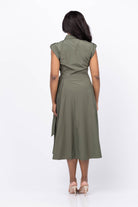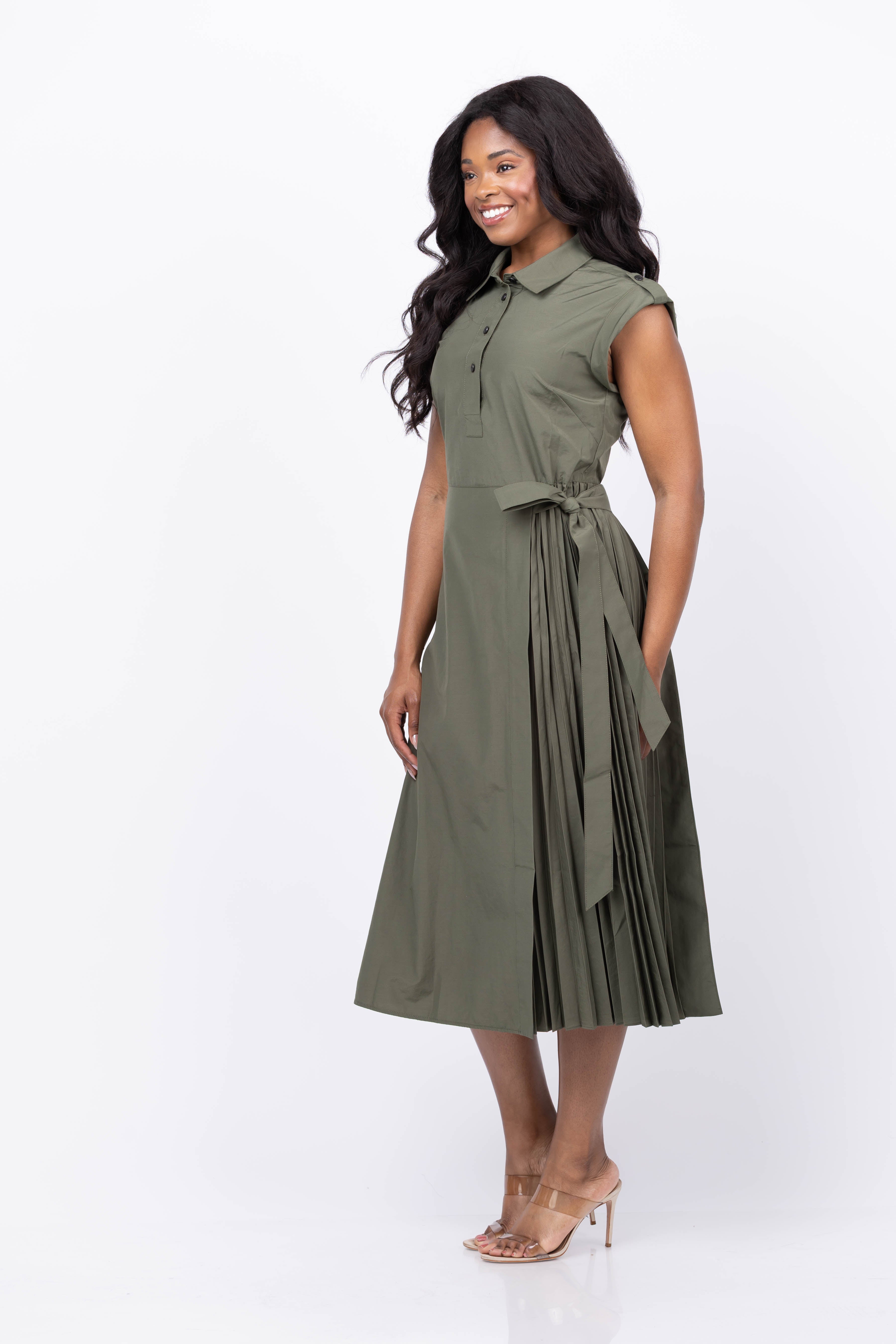 The Tanya Taylor Shivonley Dress in Army combines effortless style with thoughtful details like a self-tie belt, pleated side skirt, and collared button-up v-neck. Ideal for everyday wear, it transitions smoothly from day to night. Pair it with flats or heeled boots this Fall to create a polished, versatile look you’ll reach for again and again.