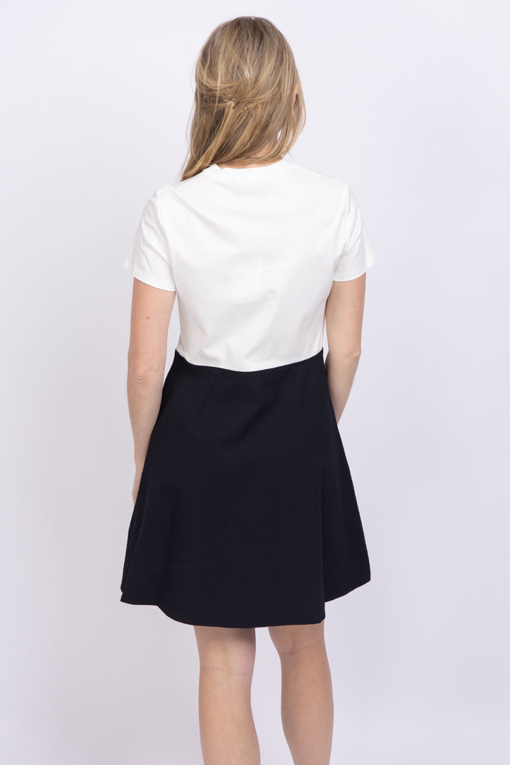 Theory's short-sleeve minidress offers mixed-media styling with a T-shirt bodice and pleated seersucker skirt.