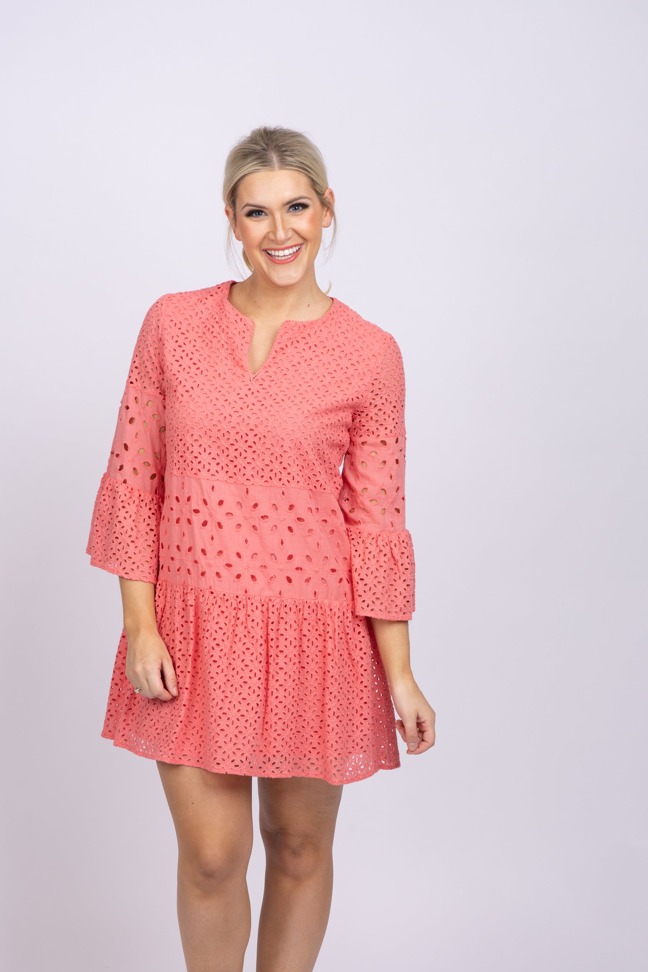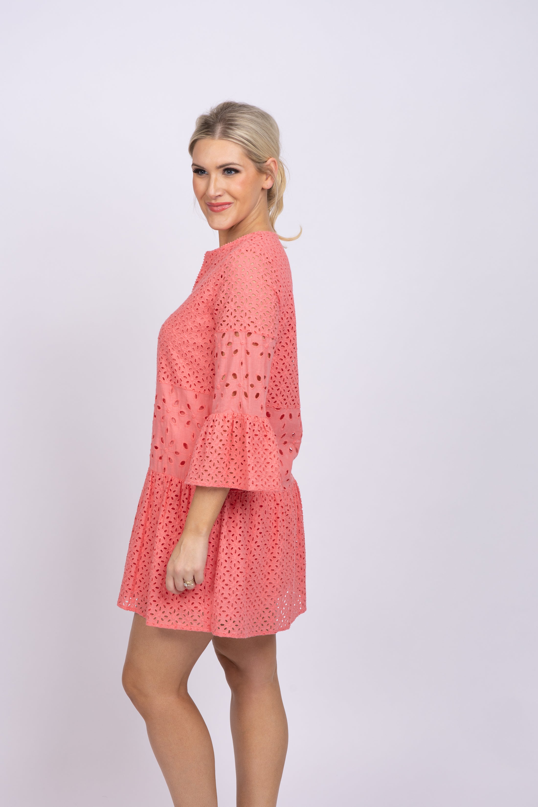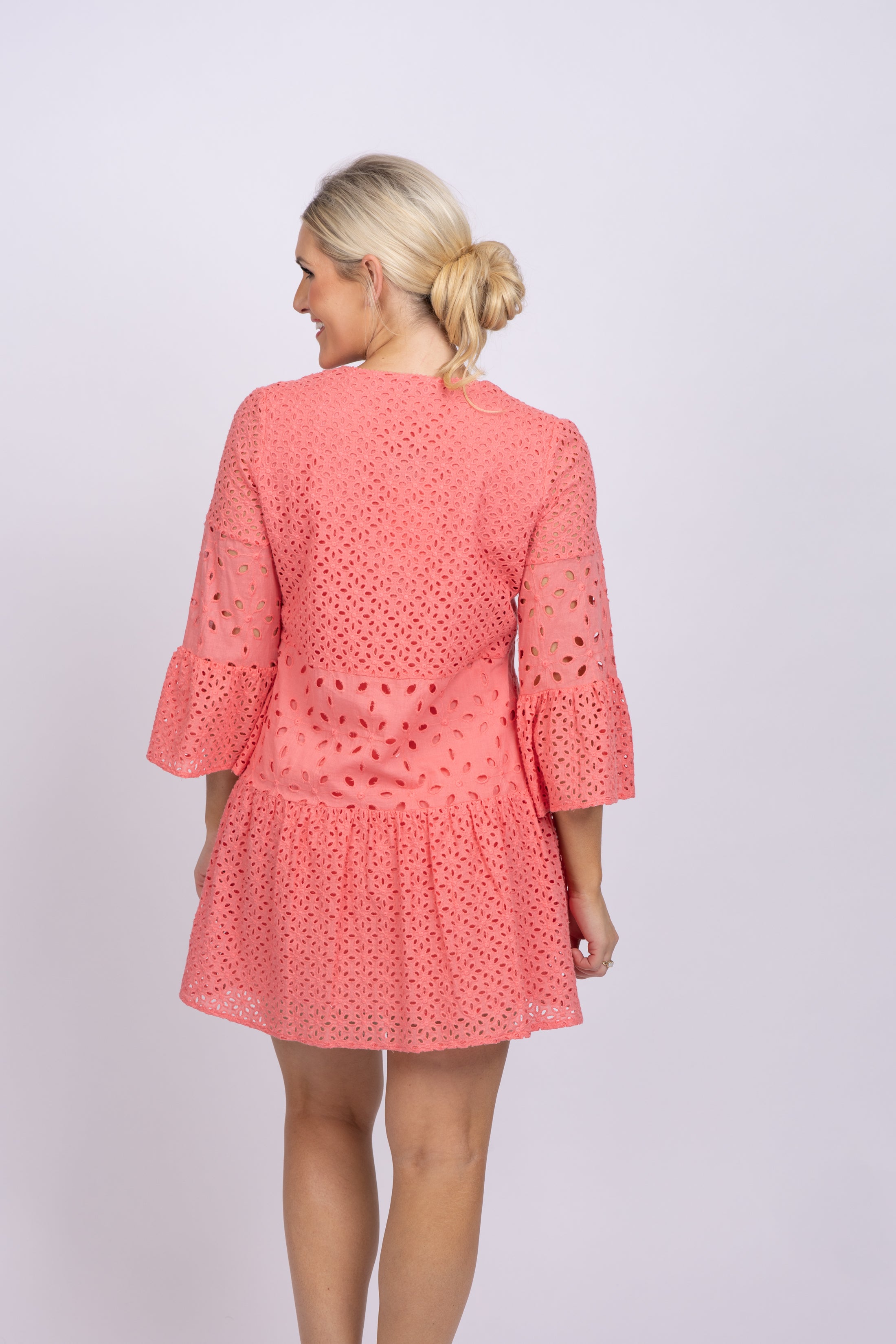 Look and feel your best in the Tyler Boe Isla Eyelet Skimmer Dress. Crafted from 100% cotton, this dress has a flattering v-neck and three-quarter bell sleeves, so you'll look great at the beach or dining out. With an effortlessly relaxed fit, you'll want to wear it for all your warm weather occasions!"