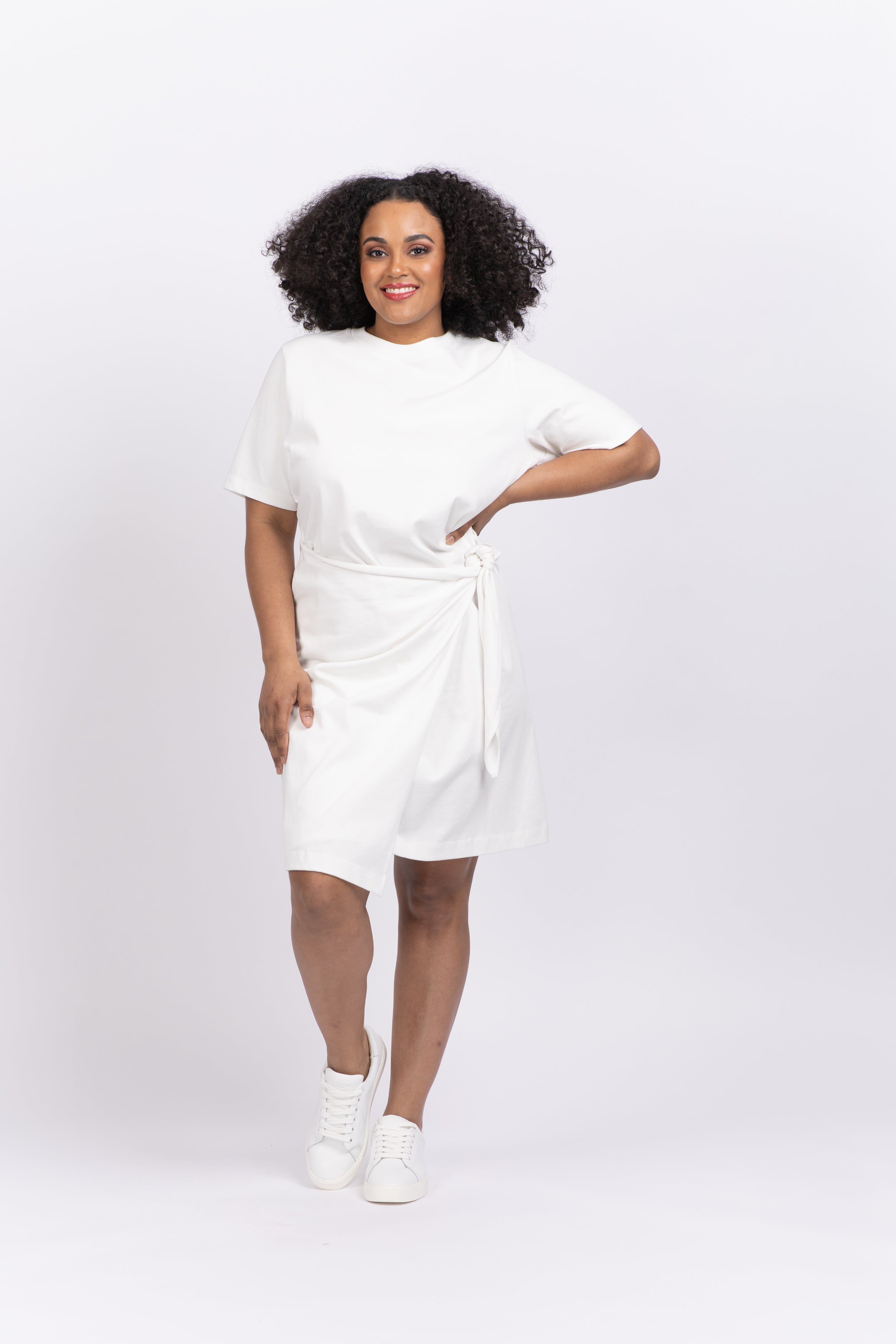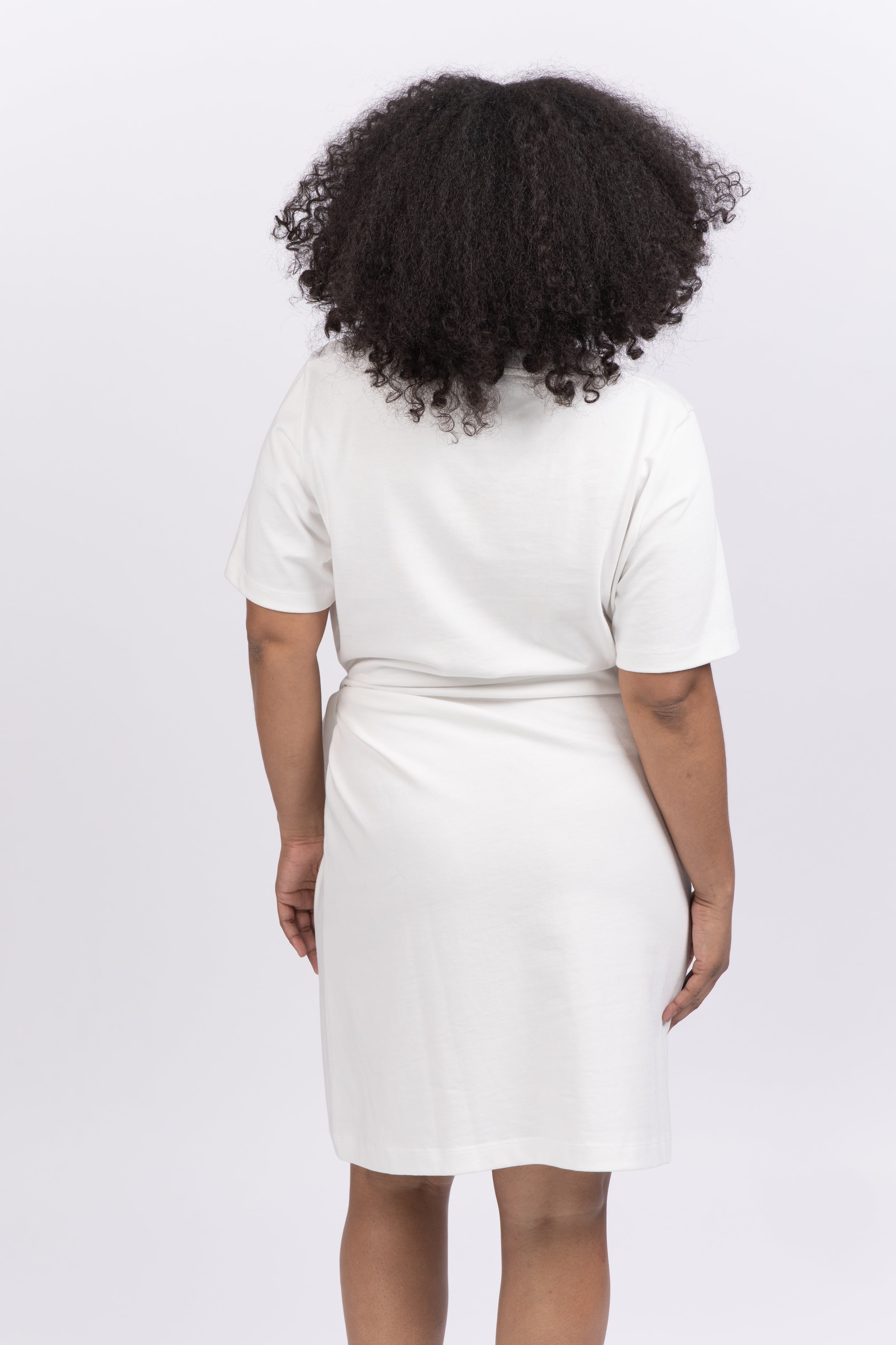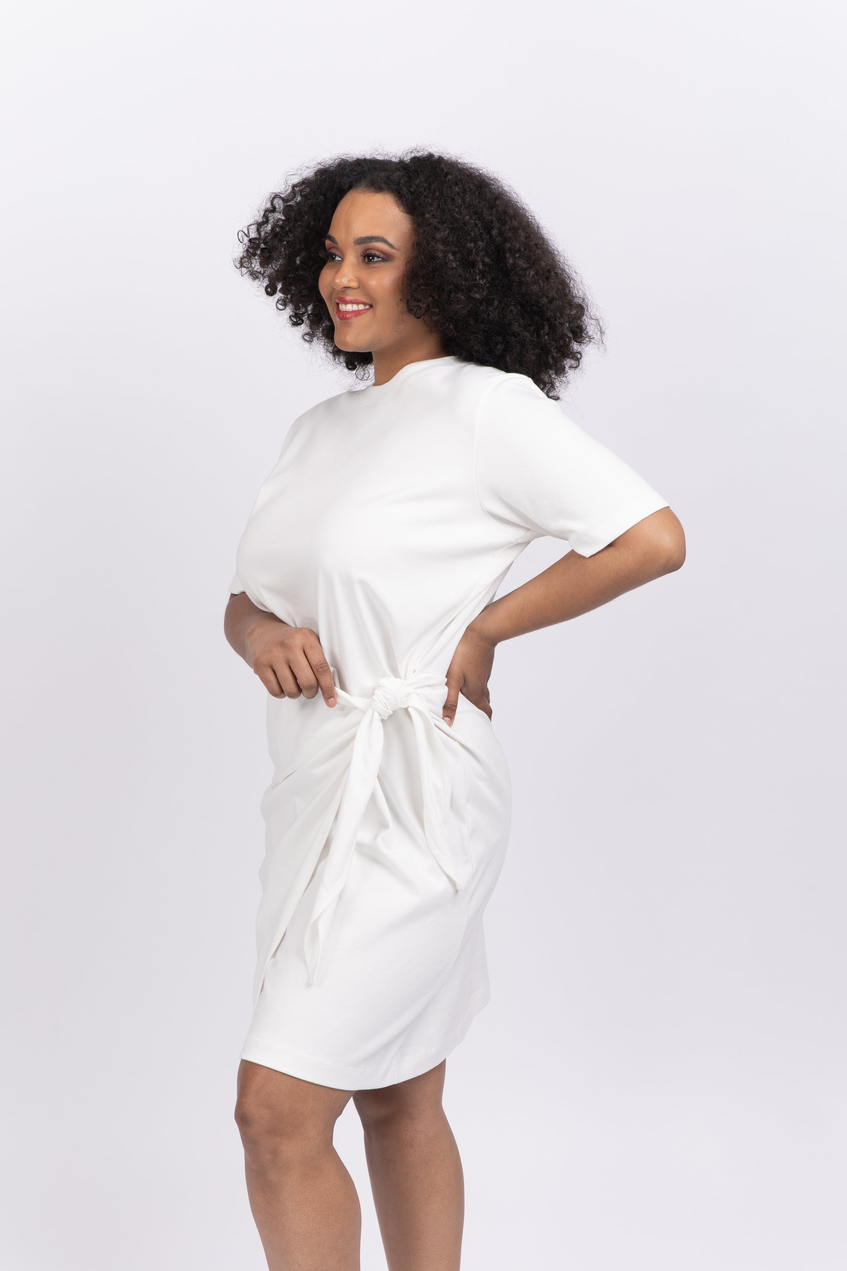 An elevated T-shirt dress cut from Peruvian cotton with a twisted tie detail at the side and gathering through the front.