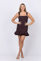 The Amanda Uprichard Annabeth Dress in Cocoa effortlessly blends bold style with playful charm. Its supportive wide straps and square neckline create a flattering silhouette, while the drop-waist flouncy hem adds a fun, flirty finish. Perfect for transitioning from day to night, this mini dress pairs just as well with cowboy boots for a spirited evening look or ballet flats for all-day comfort. Elevate your wardrobe with this versatile and lively dress made to turn heads wherever you go.
