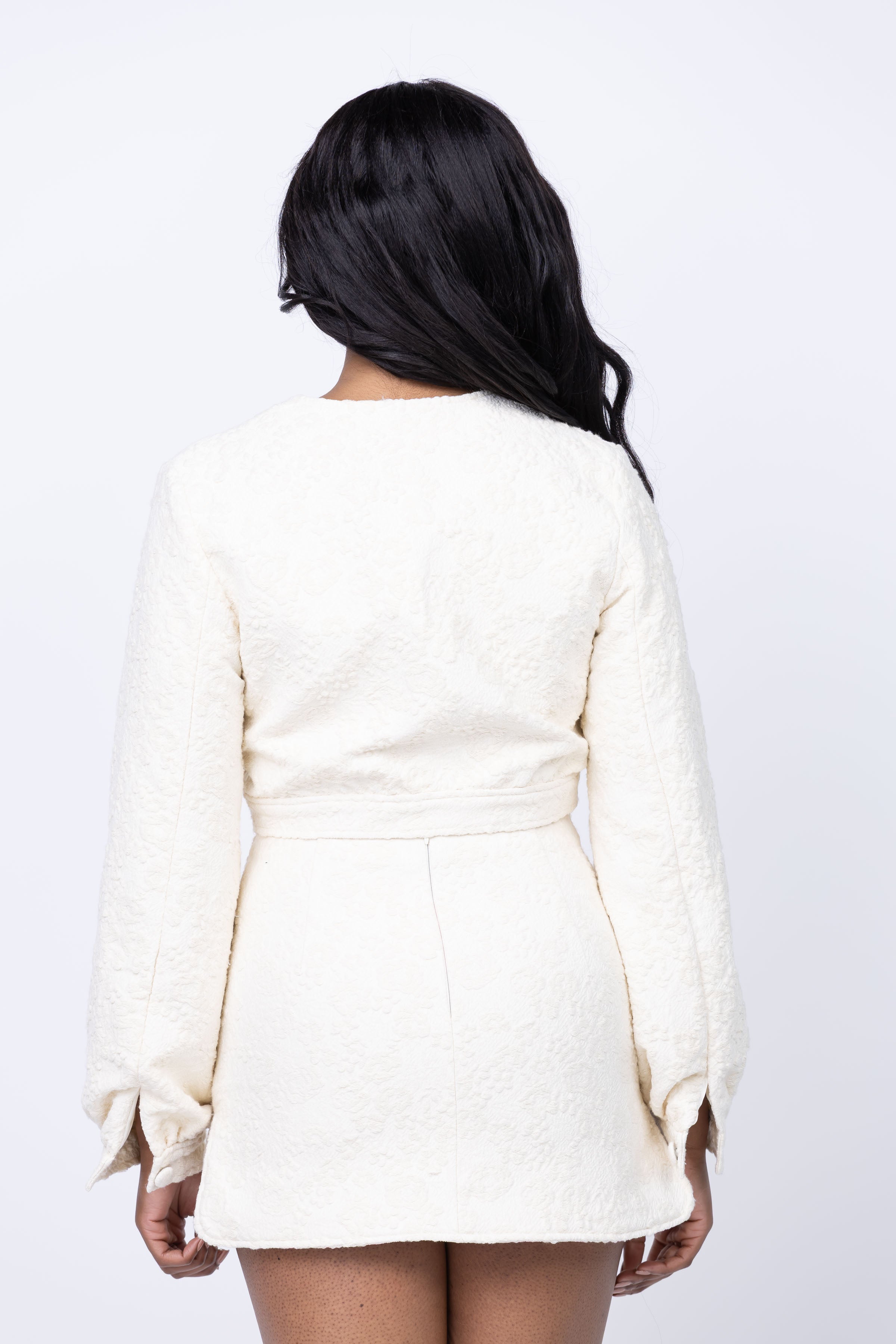 Elevate your style with the Amanda Uprichard Bello Jacket in Muslin. This impeccably crafted piece boasts elegant bell sleeves, covered buttons, and a chic cropped cut. Perfect for romantic evenings, brunch with friends, or any special occasion. Pair with the Bello Skirt for a sophisticated and polished ensemble.