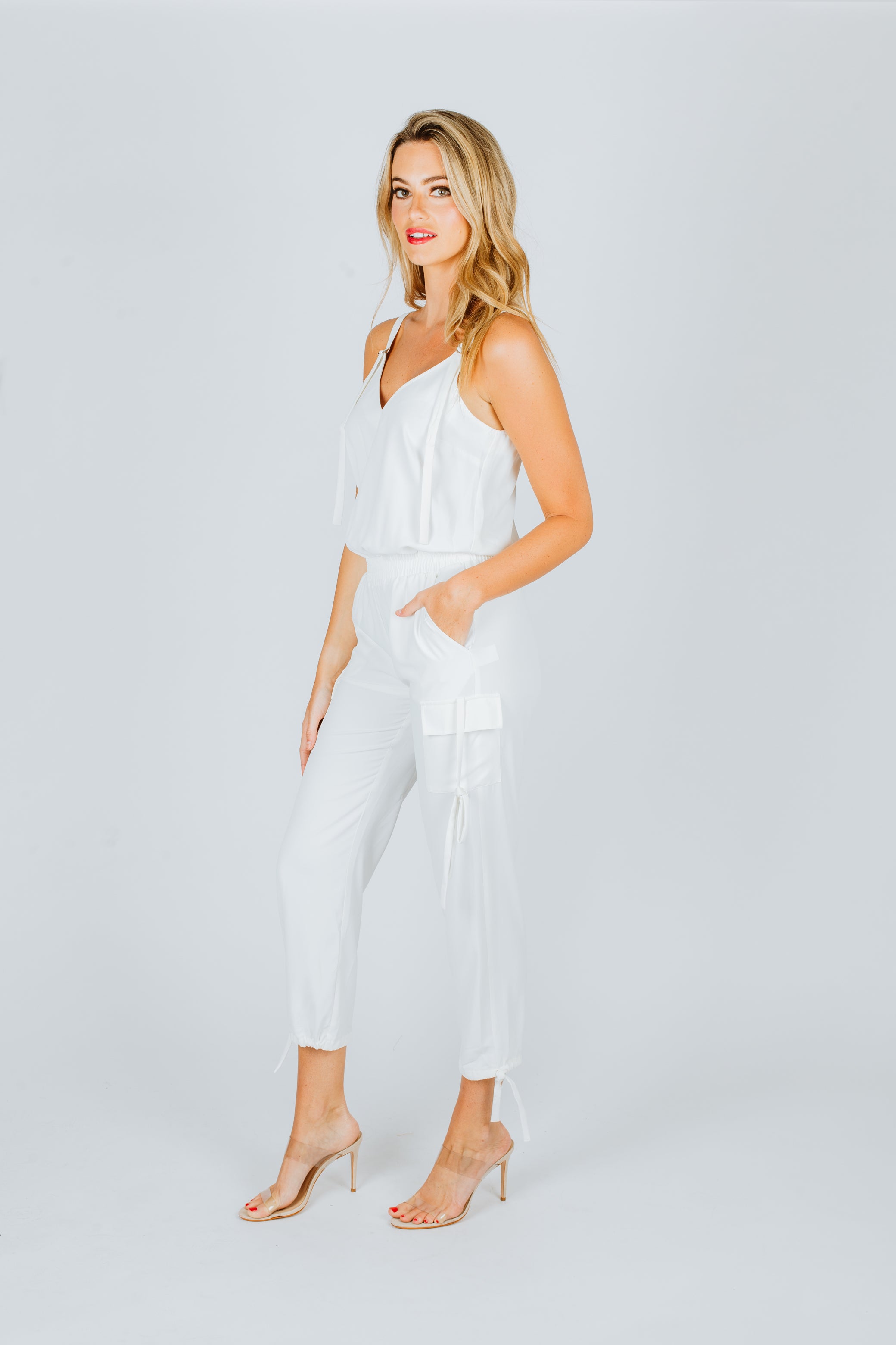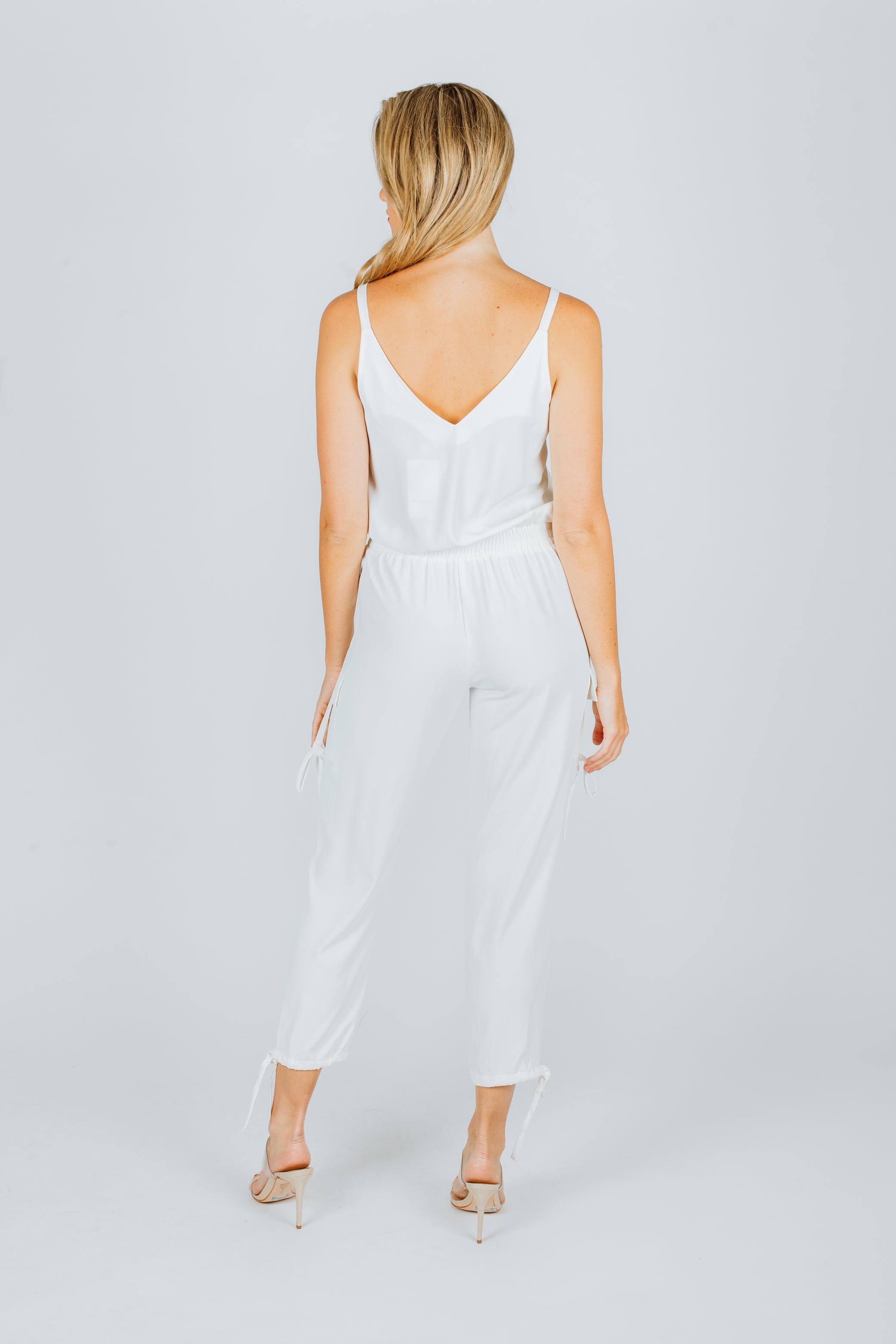 The Josietta Jumpsuit in offers adjustable straps, v-neckline, and tie detail at the pant hem. Accessorize the look with heels and a statement necklace for an effortless look to wear at brunch, on a date, or at a concert.
